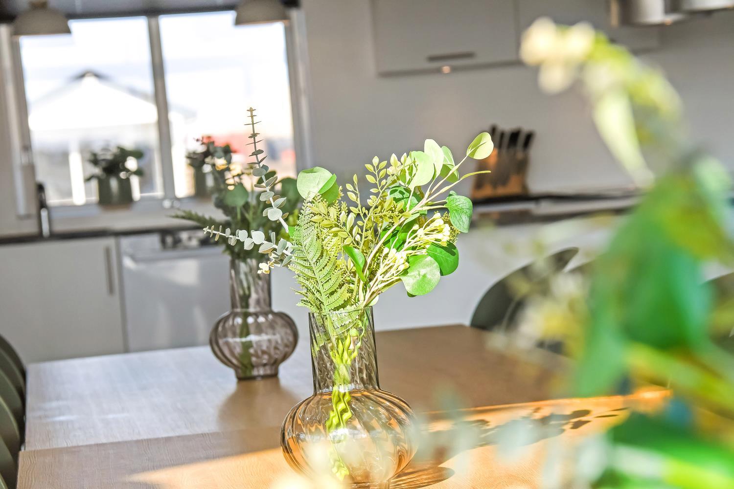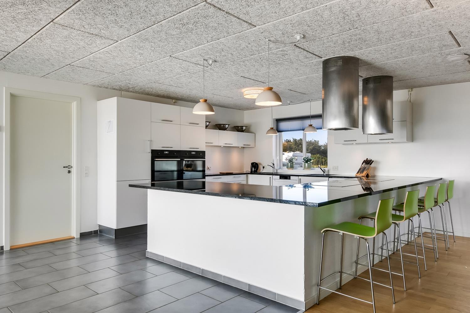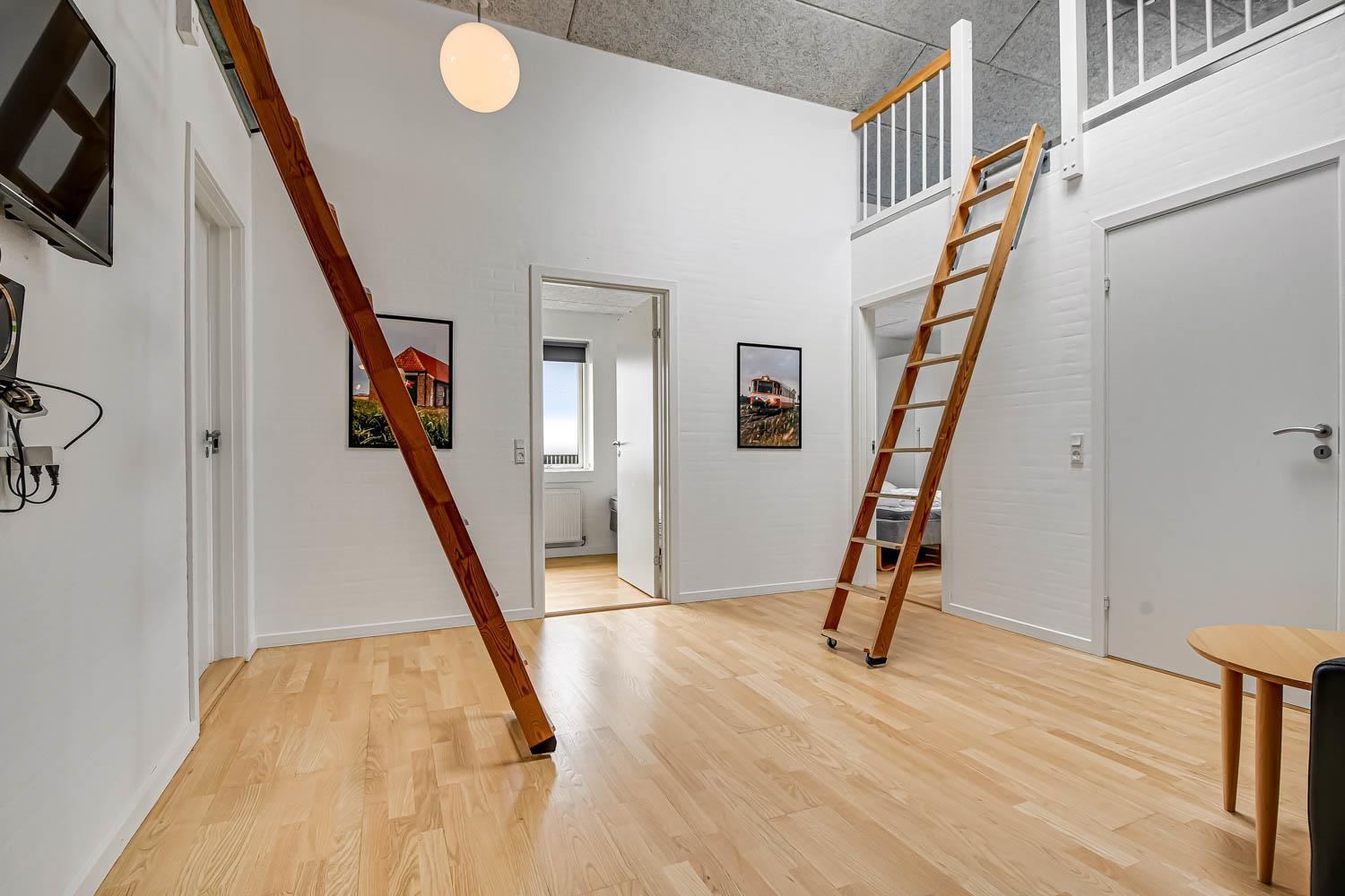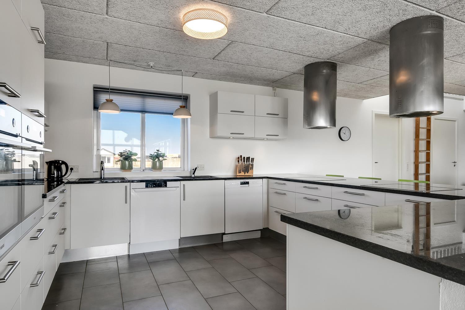 Huset er omgivet af flere terrasser, hvor man altid har mulighed for at finde læ på feriens solrige dage. Her finder man naturligvis havemøbler og liggestole og gasgrill. Til børnene er der desuden stor trampolin, sandkasse og gyngestativ. Dette storslåede feriehus er beliggende på en 1.700 m2 skøn naturgrund i Vrist kun 250 m fra stranden. Grunden er velbeliggende, centralt med kun 50 m til indkøb og samtidig ud til åbne markområder.