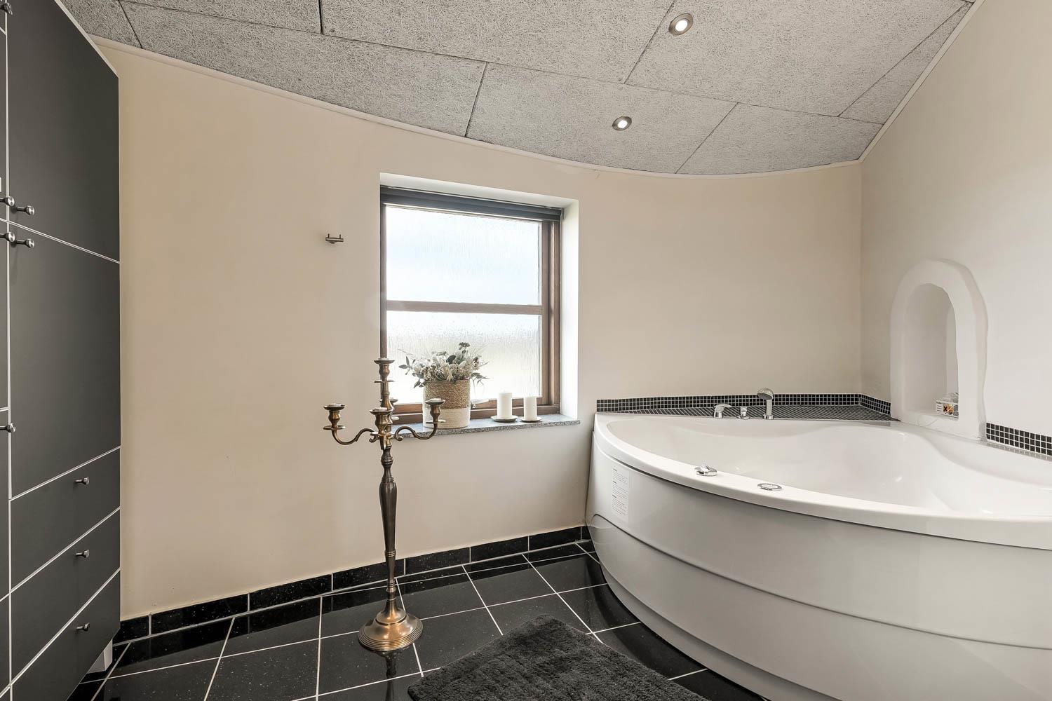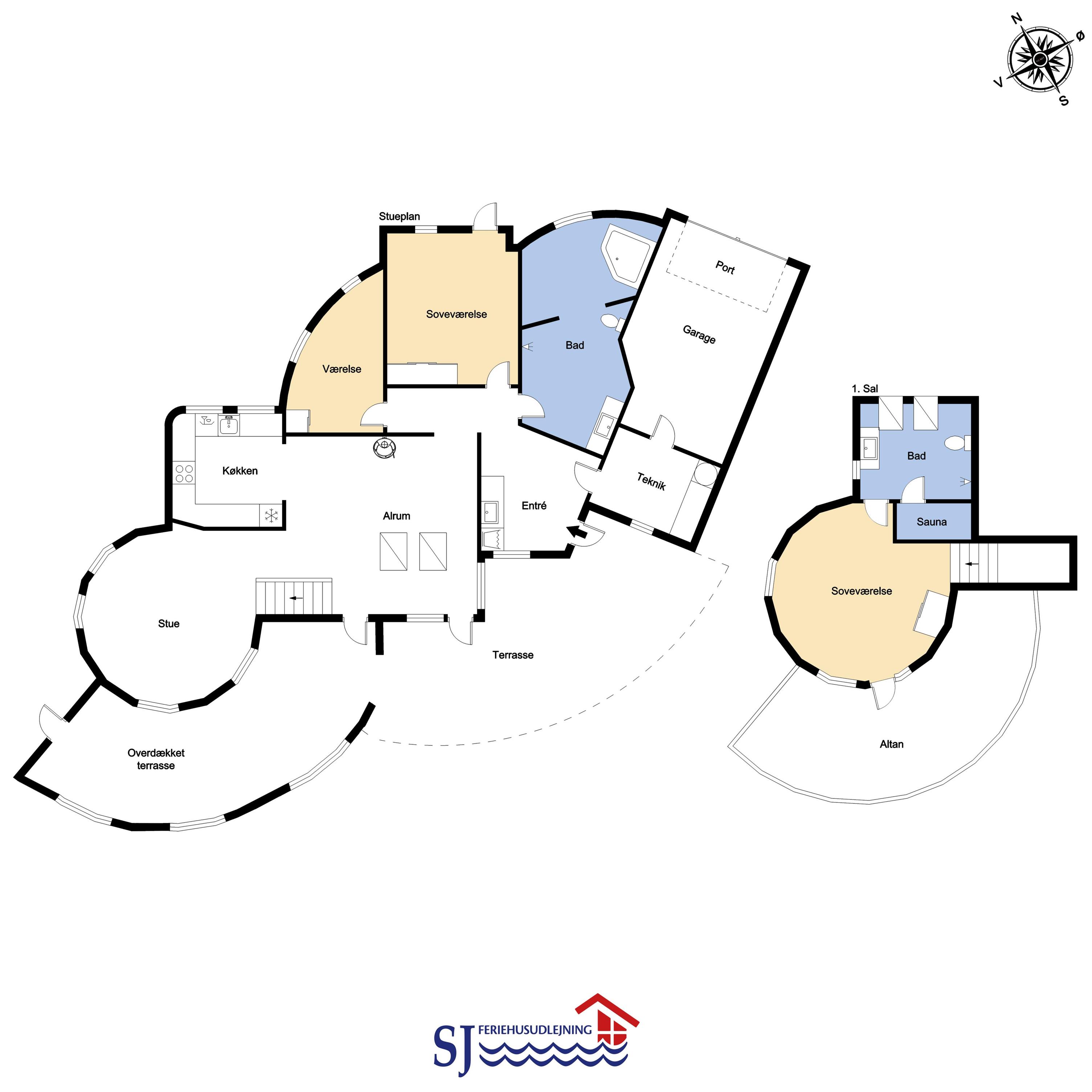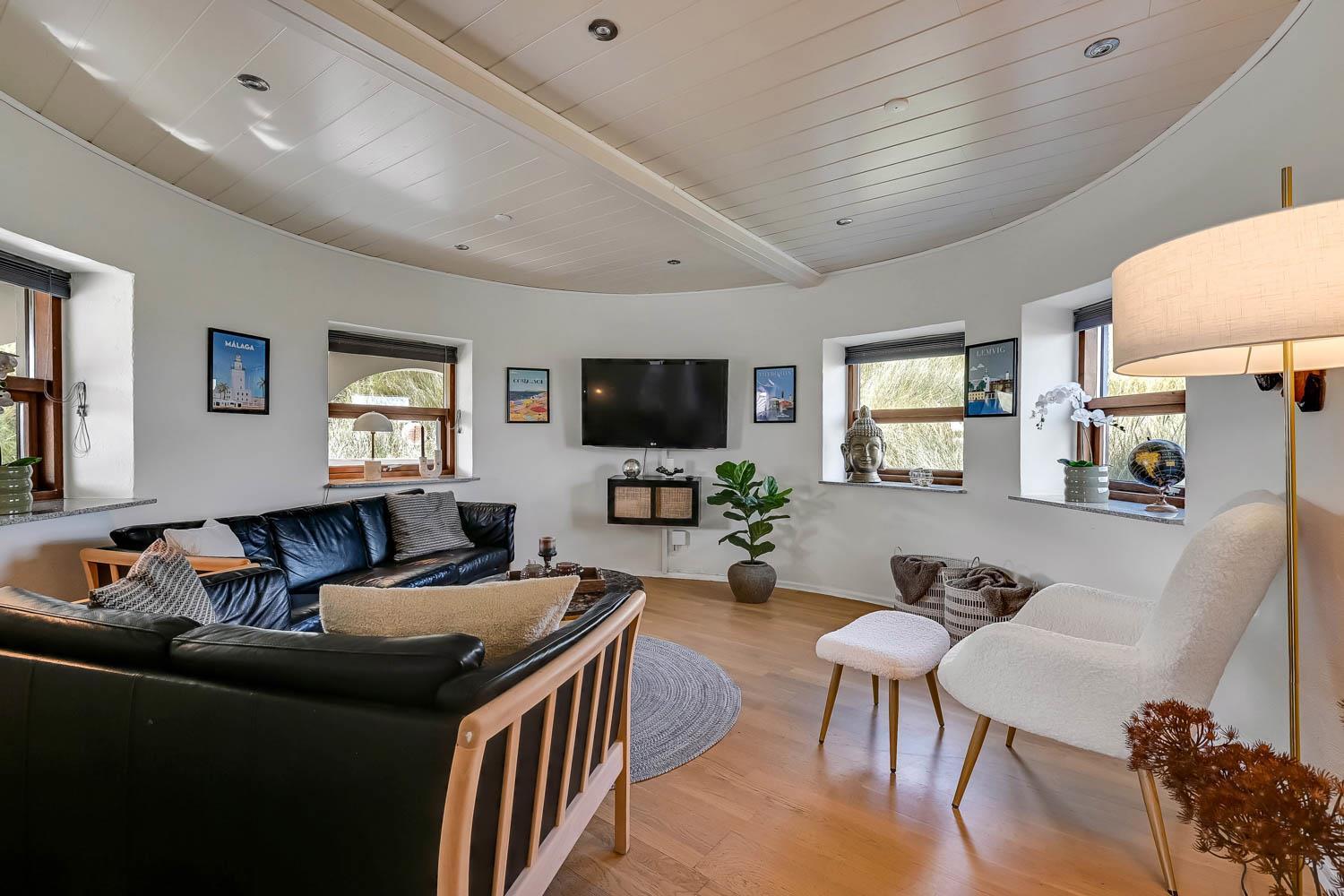 Allerede når bilen når grusvejen som fører op til huset kan man se at både hus og beliggenhed er noget ganske særligt. Dette hus er så specielt og flot at det skal opleves. En flot entre byder velkommen og her er der rig mulighed for at hænge sit overtøj op, desuden står husets vaskemaskine og tørretumbler også her. Fra entreen kommer man ind i en fordelergang her kan man få adgang til et af husets 2 badeværelser som er meget stort, her er der toilet, håndvask, bruser, gulvvarme samt et spabad og her er den spanske byggestil også kommet til udtryk. Ved siden af badeværelset er der et soveværelse med 1 DS og for enden af gangen er der et soveværelse med 1 DS. Fra gangen kommer man ind i spisestue/køkken. Her er der højt til loftet og herfra er der udgang til den overdækkede terrasse. Stort flot køkken med alt i service og kogegrej. Der er induktionskogeplade, indbygningsovn, emhætte, opvaskemaskine, mikroovn samt et køle-/fryseskab. Spisestuen er indrettet med et spisebord og her er der desuden en brændeovn, som giver en behagelig varme også på de kolde dage, fra spisestuen er der indgang til husets opholdsstue som er indrettet med gode lædermøbler, F-TV med fibernet TV med danske og tyske programmer. Fra spisestuen er der en lille trappe op til huset master bedroom med en DS og herfra er der indgang til det andet badeværelse i huset som er indrettet med toilet, håndvask, bruser samt adgang til husets sauna. Fra dette soveværelse er der udgang til en åben terrasse hvorfra man kan nyde udsigten over klitterne, herfra kommer man via en trappe op til den store runde terrasse som er ovenpå selve tårnet. Her er udsigten fantastisk ud over Vesterhavet og hele området omkring Vrist. Har man el-bil eller en Plug-In hybrid, så er der ved ladeboks til Type 2 ladestikIkke rygerhus. 1 husdyr er tilladt.