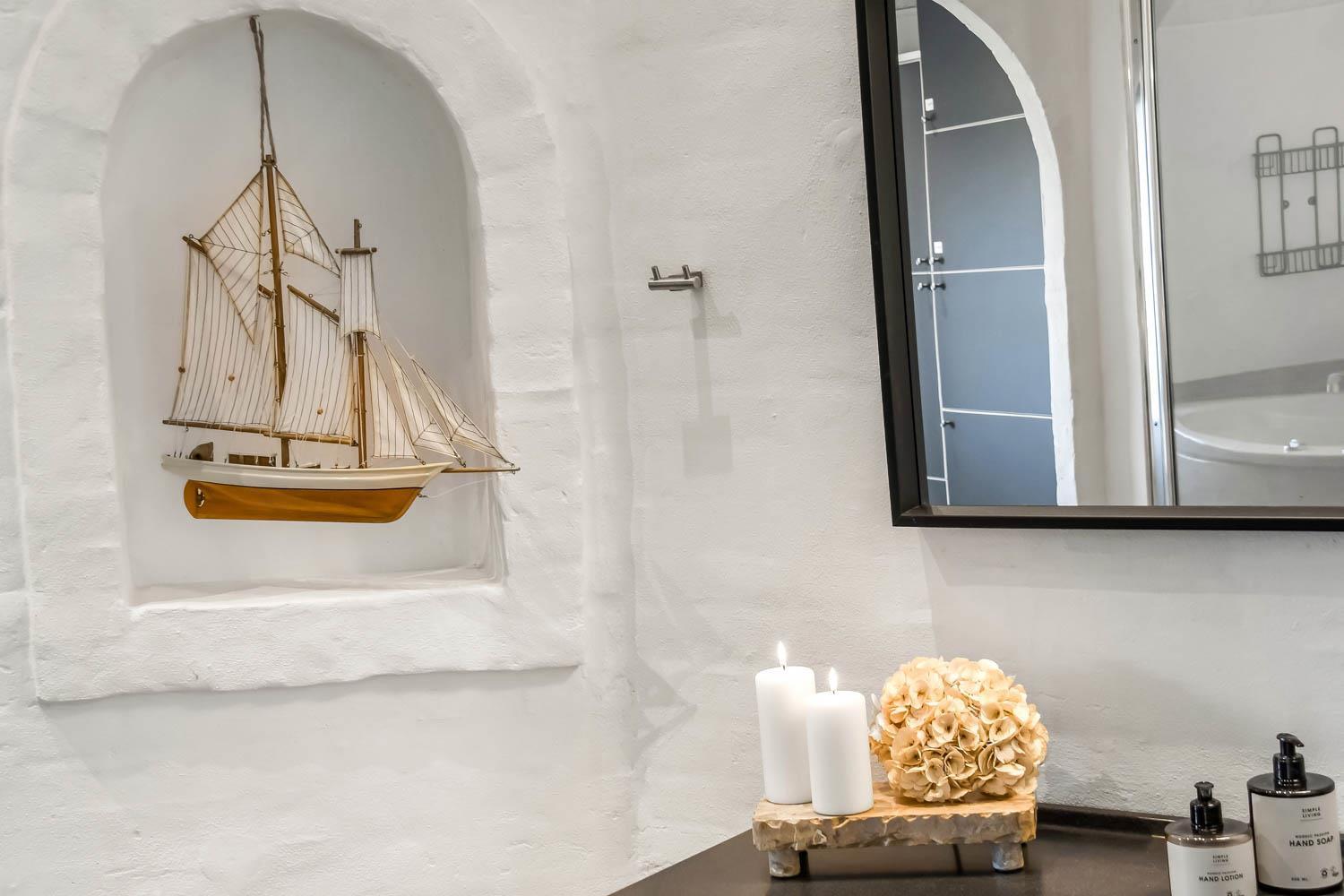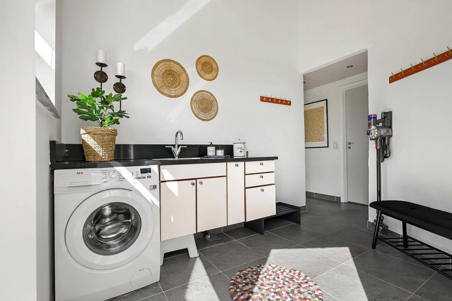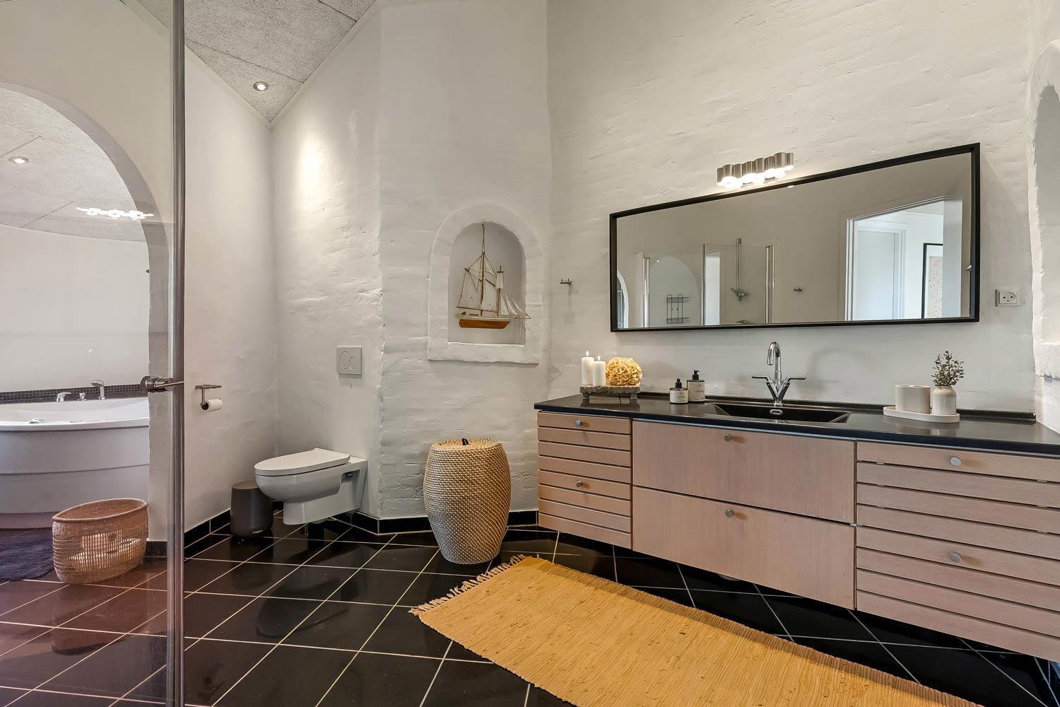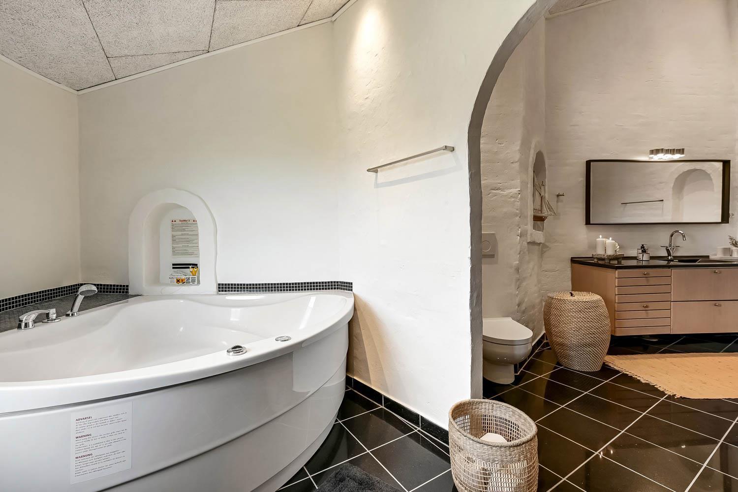 Allerede når bilen når grusvejen som fører op til huset kan man se at både hus og beliggenhed er noget ganske særligt. Dette hus er så specielt og flot at det skal opleves. En flot entre byder velkommen og her er der rig mulighed for at hænge sit overtøj op, desuden står husets vaskemaskine og tørretumbler også her. Fra entreen kommer man ind i en fordelergang her kan man få adgang til et af husets 2 badeværelser som er meget stort, her er der toilet, håndvask, bruser, gulvvarme samt et spabad og her er den spanske byggestil også kommet til udtryk. Ved siden af badeværelset er der et soveværelse med 1 DS og for enden af gangen er der et soveværelse med 1 DS. Fra gangen kommer man ind i spisestue/køkken. Her er der højt til loftet og herfra er der udgang til den overdækkede terrasse. Stort flot køkken med alt i service og kogegrej. Der er induktionskogeplade, indbygningsovn, emhætte, opvaskemaskine, mikroovn samt et køle-/fryseskab. Spisestuen er indrettet med et spisebord og her er der desuden en brændeovn, som giver en behagelig varme også på de kolde dage, fra spisestuen er der indgang til husets opholdsstue som er indrettet med gode lædermøbler, F-TV med fibernet TV med danske og tyske programmer. Fra spisestuen er der en lille trappe op til huset master bedroom med en DS og herfra er der indgang til det andet badeværelse i huset som er indrettet med toilet, håndvask, bruser samt adgang til husets sauna. Fra dette soveværelse er der udgang til en åben terrasse hvorfra man kan nyde udsigten over klitterne, herfra kommer man via en trappe op til den store runde terrasse som er ovenpå selve tårnet. Her er udsigten fantastisk ud over Vesterhavet og hele området omkring Vrist. Har man el-bil eller en Plug-In hybrid, så er der ved ladeboks til Type 2 ladestikIkke rygerhus. 1 husdyr er tilladt.
