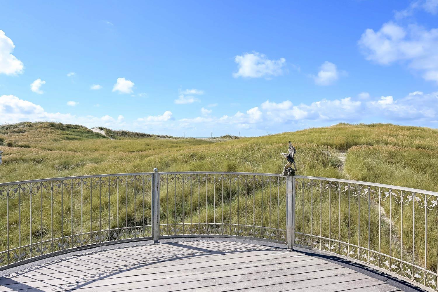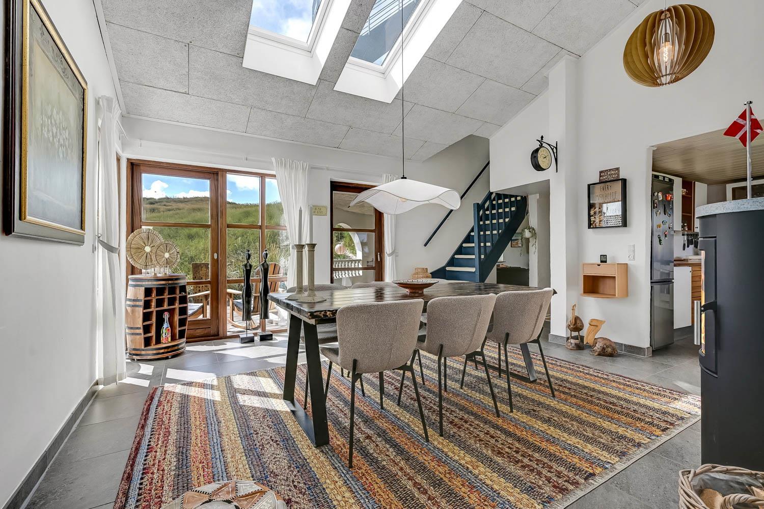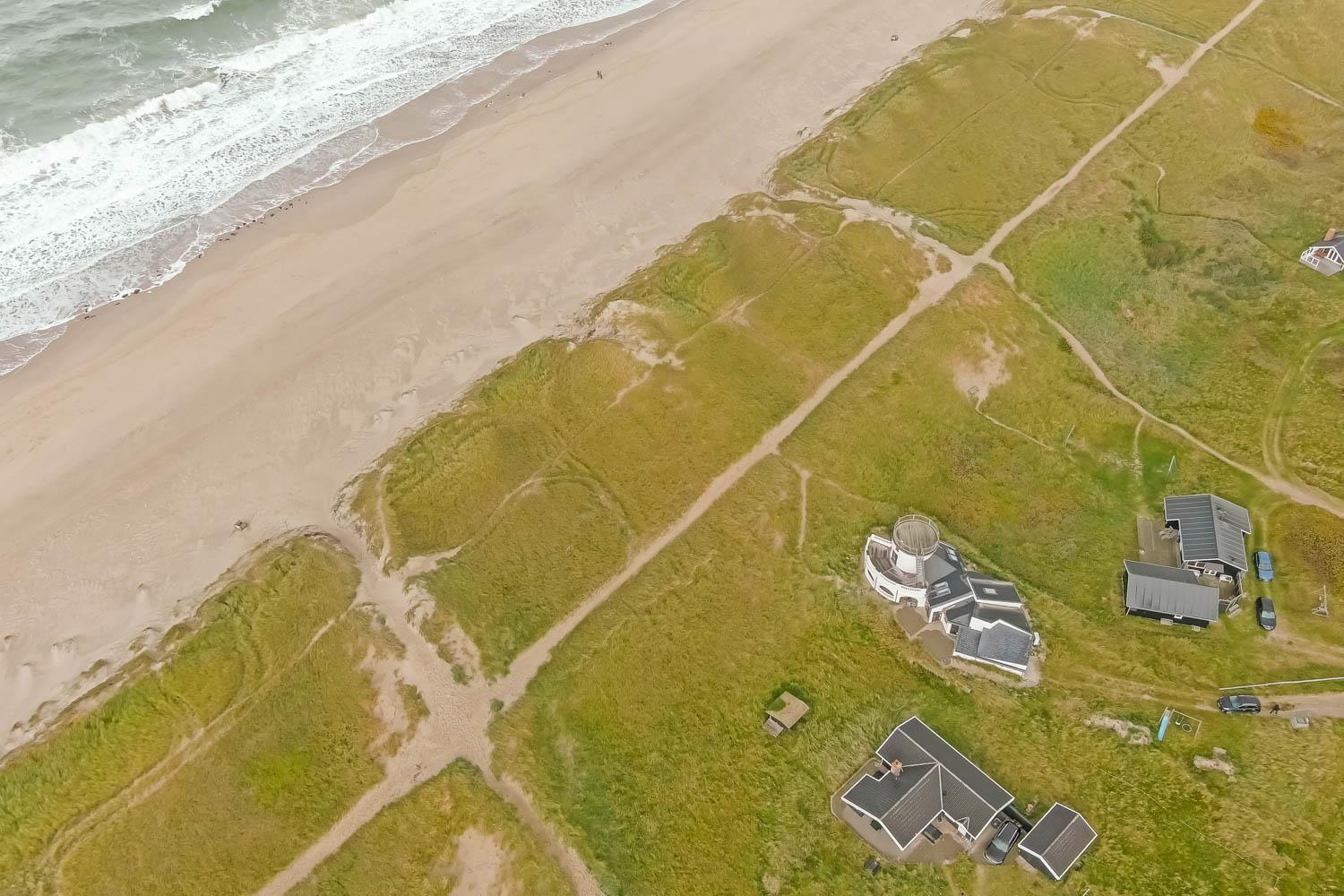 Huset er beliggende på en klitgrund helt op af diget ved Vesterhavet og har en af de bedste beliggenheder i området. Huset har flere terrasser og den som ligger, i stueplan er overdækket og her kommer den spanske stil helt til udtryk, her er selvfølgelig havemøbler og grill og det perfekte sted at opholde sig også når temperaturen udenfor er høj så er denne overdækkede terrasse dejlig sval. Fra 1. sal er der udgang til endnu en terrasse og herfra er der en flot udsigt til klitterne og området der går en udvendig trappe op til toppen af tårnet hvor den sidste terrasse befinder sig og herfra har man en storslået udsigt over Vesterhavet og hele Vrist området. Fra huset er der blot 50 m til stranden ved Vesterhavet som hver dag byder på nye oplevelser. Der er mange forskellige aktiviteter man kan foretage sig ved stranden, bade, svømme, fiske, samle sten og rav, bygge sandslotte eller flyve med drager og meget mere. I køreafstand fra huset ligger fiskerbyen Thyborøn som er en hyggelig by med mange gode spisesteder, butikker og attraktioner, her er også de bedste muligheder for at købe frisk fisk med hjem. Kører man i den anden retning kommer man til den gamle handelsby Lemvig som også har flere gode forretninger og spisesteder, her er ligeledes en dejlig havnepromenade hvor der er en lille legeplads til de mindste børn. Dette hus er til de gæster som ønsker sig det helt unikke i deres ferie med en beliggenhed så tæt på stranden som muligt.
