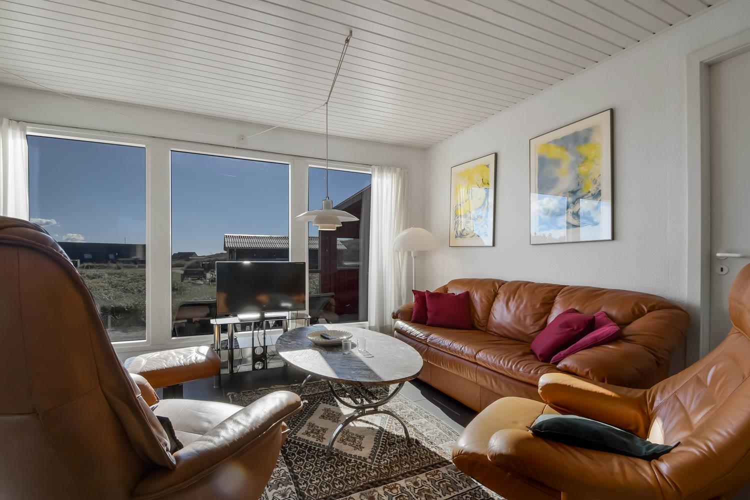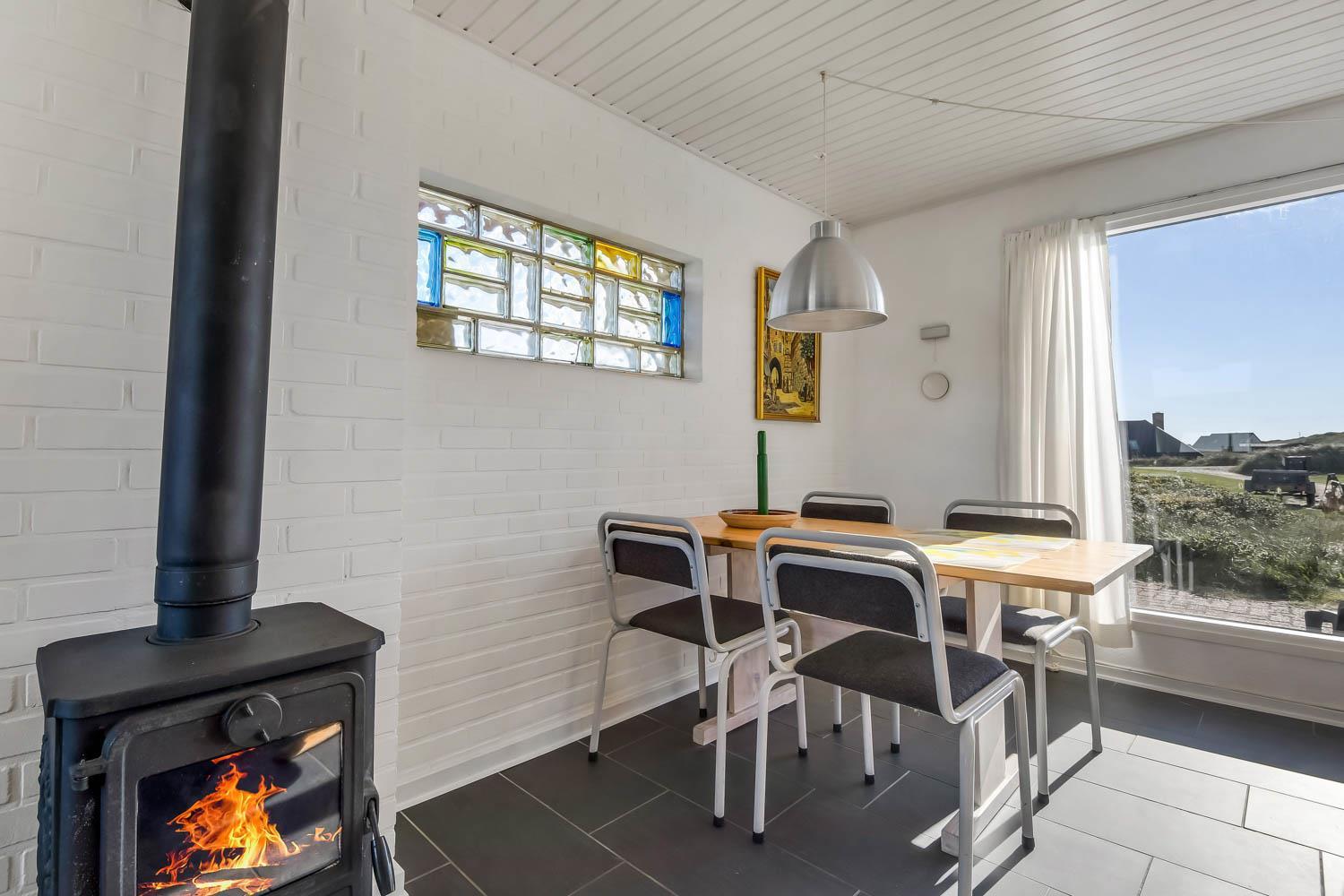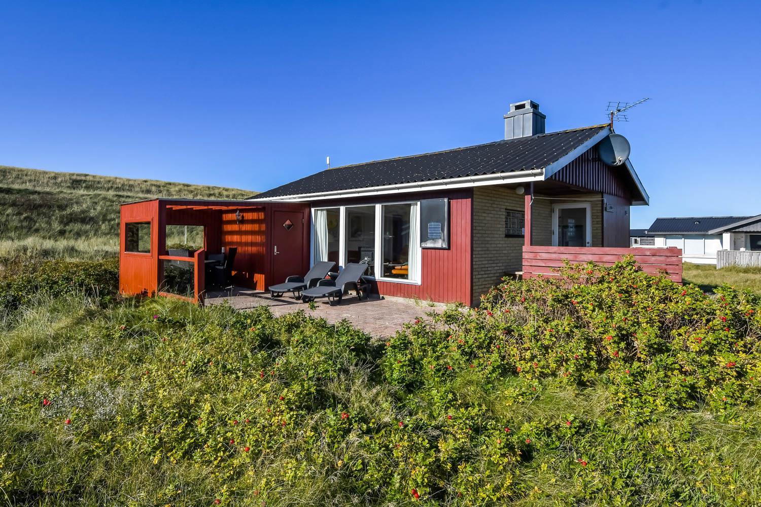 Fra køkkenhjørnet er der udgang til en lille terrasse med havemøbler og grill. Huset ligger på en ca. 3000 m2 stor klitgrund kun 50 fra Vesterhavet. Nyd en ferie i et lille, nyrenoveret feriehus med en helt unik beliggenhed. Parker bilen og nyd at I resten af ferien kan gå til stranden på under 5 minutter.