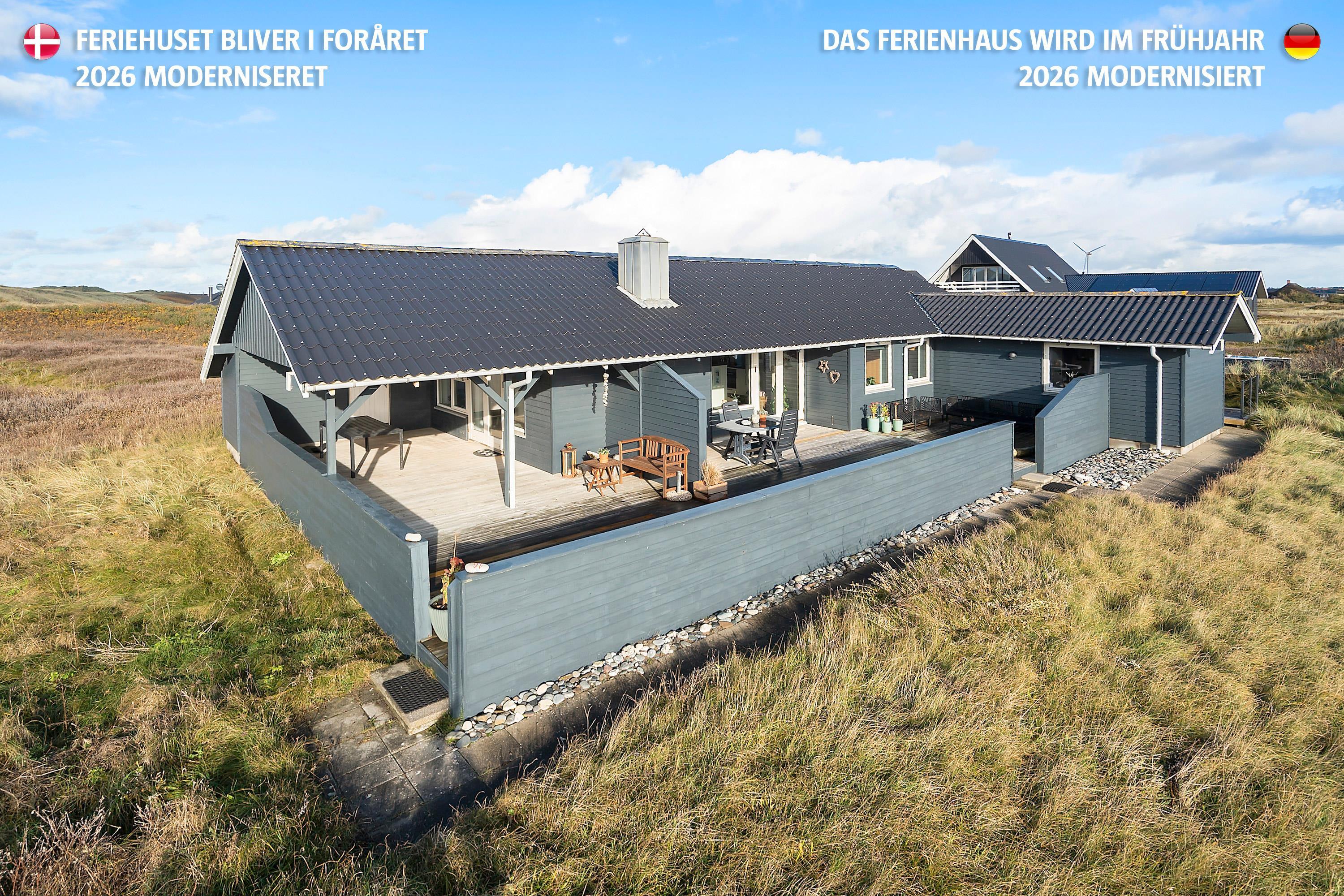 Udendørs finder I flere gode terrasseområder, hvoraf en del er overdækket. Her kan I nyde solen, grille på lune sommeraftener eller blot slappe af med udsigt til de smukke klitter. Den store naturgrund på 2.582 m² ligger ugeneret og giver masser af plads til både leg og afslapning.