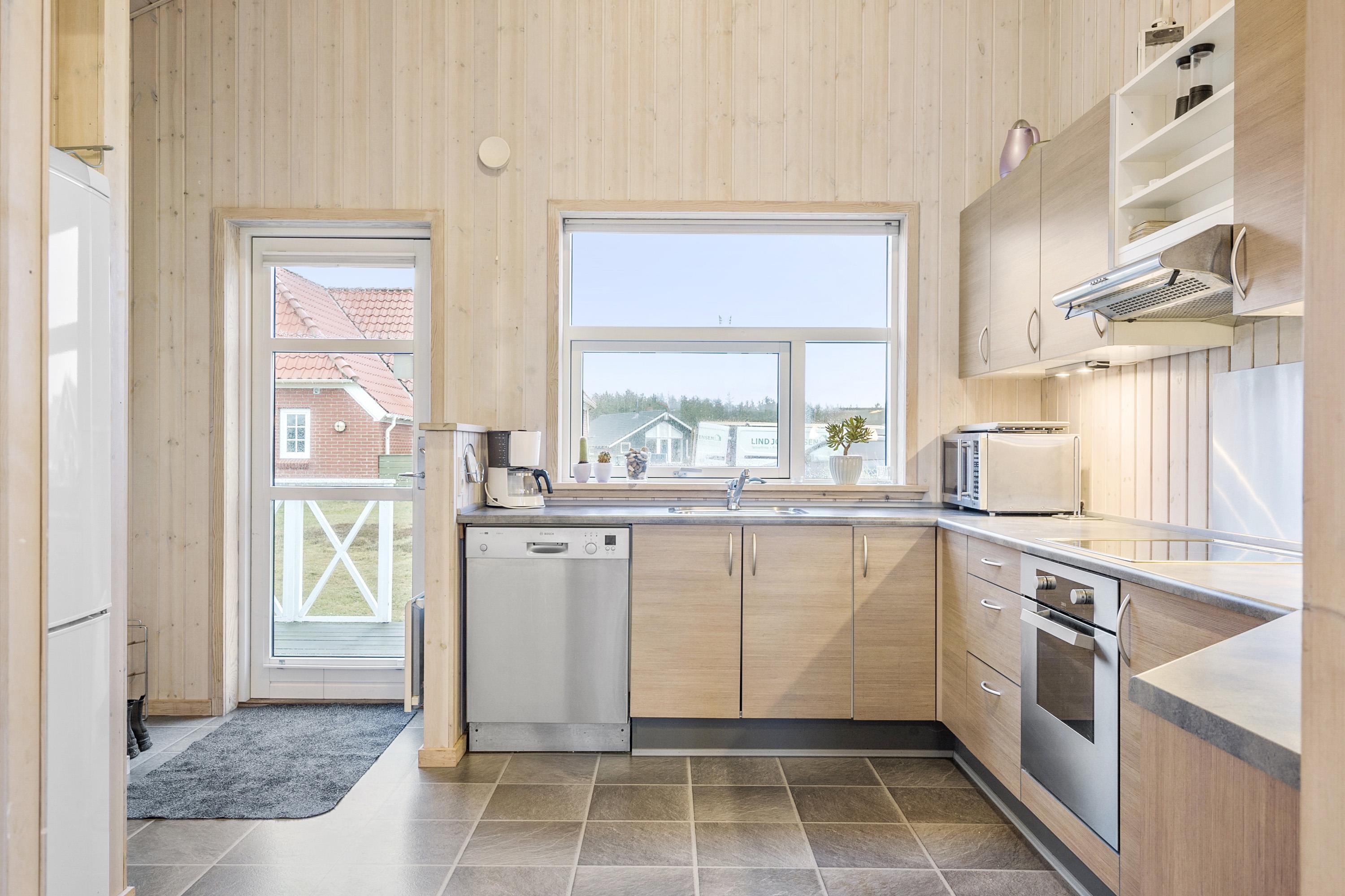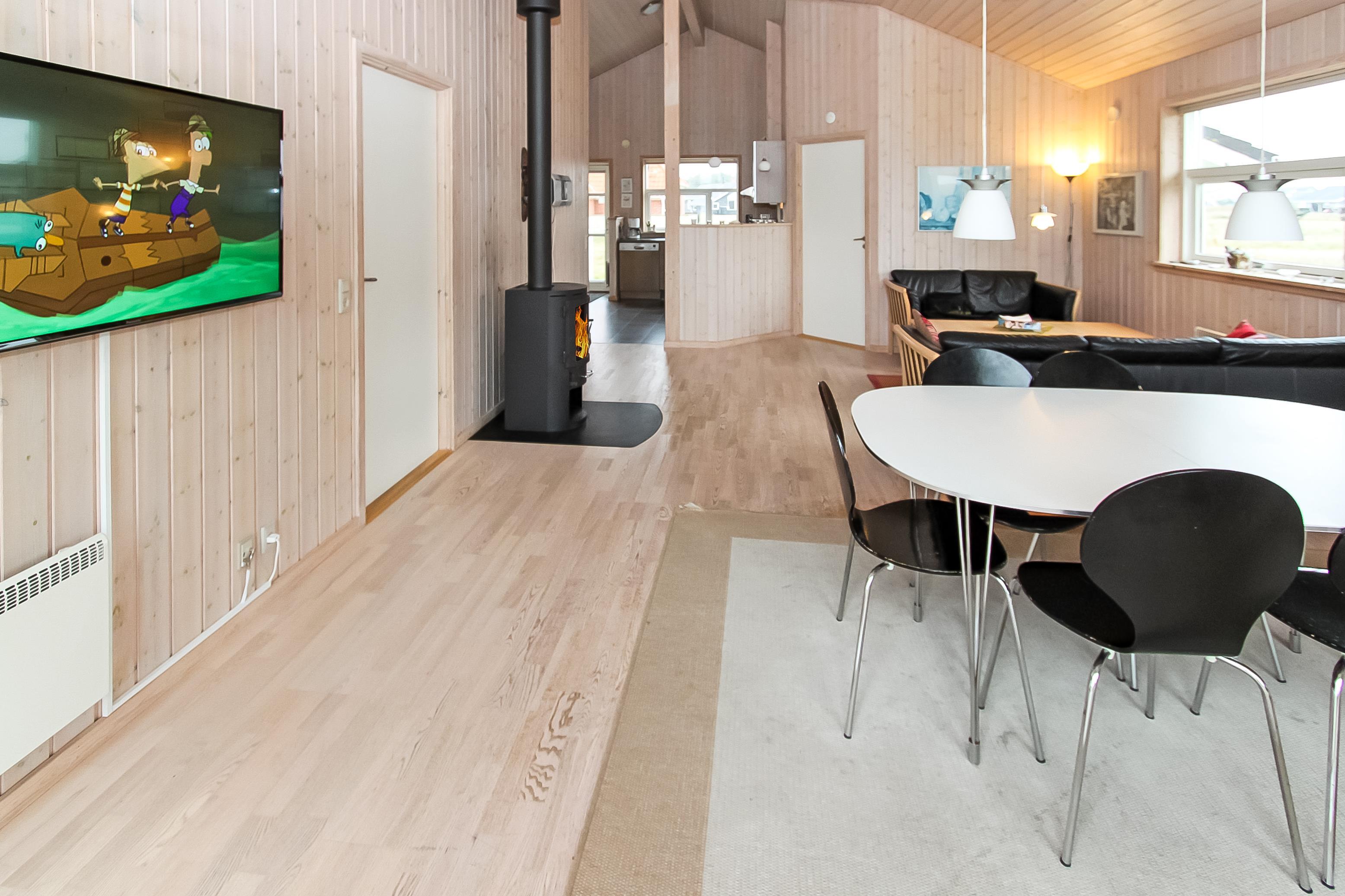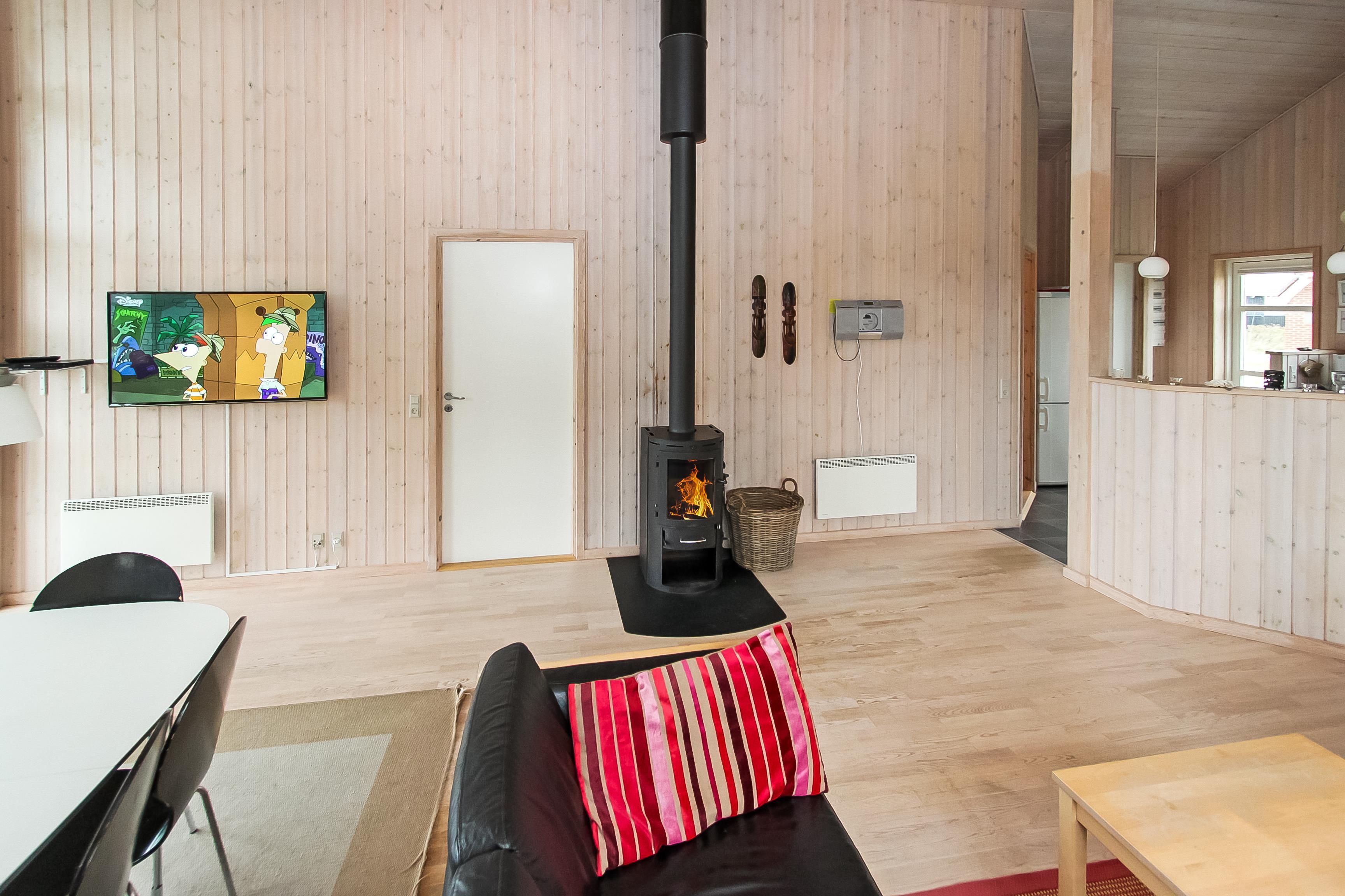 Dette dejligt og pænt indrettede feriehus i træ er med god møblering. Stuen er kombineret med køkkenet og har udgang til en delvis overdækket terrasse. Stuen er med gode møbler og et spisebord, der er en skøn brændeovn som giver en dejlig varme uanset årstid. Der er TV med parabol (kun tyske programmer). Fra stuen er der indgang til 2 af soverummene som er indrettet med 1DS og 2S. Fra køkkenet er der indgang til det sidste værelse som er med 2S. Husets badeværelse indeholder toilet, håndvask, bruser, spabad og adgang til sauna. På badeværelset er der også en vaskemaskine og tørretumbler. På badeværelset er der klinker og gulvvarme. Veludstyret køkken med el keramisk komfur, opvaskemaskine, emhætte, mikroovn og køle-/fryseskab. Der er trægulve i alle rum på nær køkkenet som er med vinyl gulv. Husdyr er ikken tilladt. Ikke rygerhus.