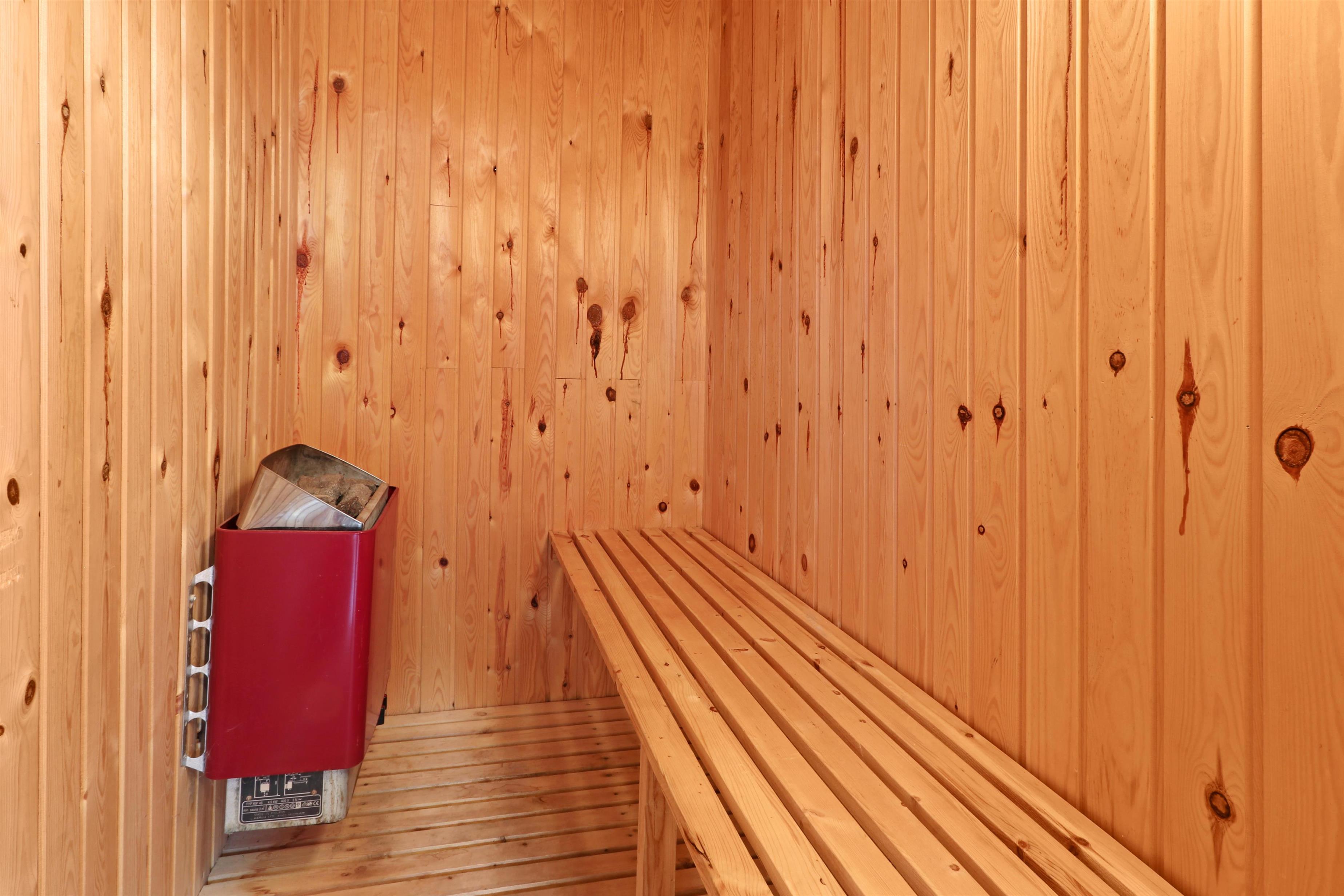 Der er to badeværelser: et med toilet, brusebad og direkte adgang til sauna, samt et med spabad – begge med opvarmede flisegulve. Køkkenet er veludstyret med elkedel, kaffemaskine, mikroovn, opvaskemaskine, køleskab med fryser og komfur. Køkkenet ligger i åben forbindelse med opholdsstuen, hvor der findes 2- og 3-personers sofaer, to lænestole, sofabord samt spiseafdeling med 8 stole og glasvitrine.