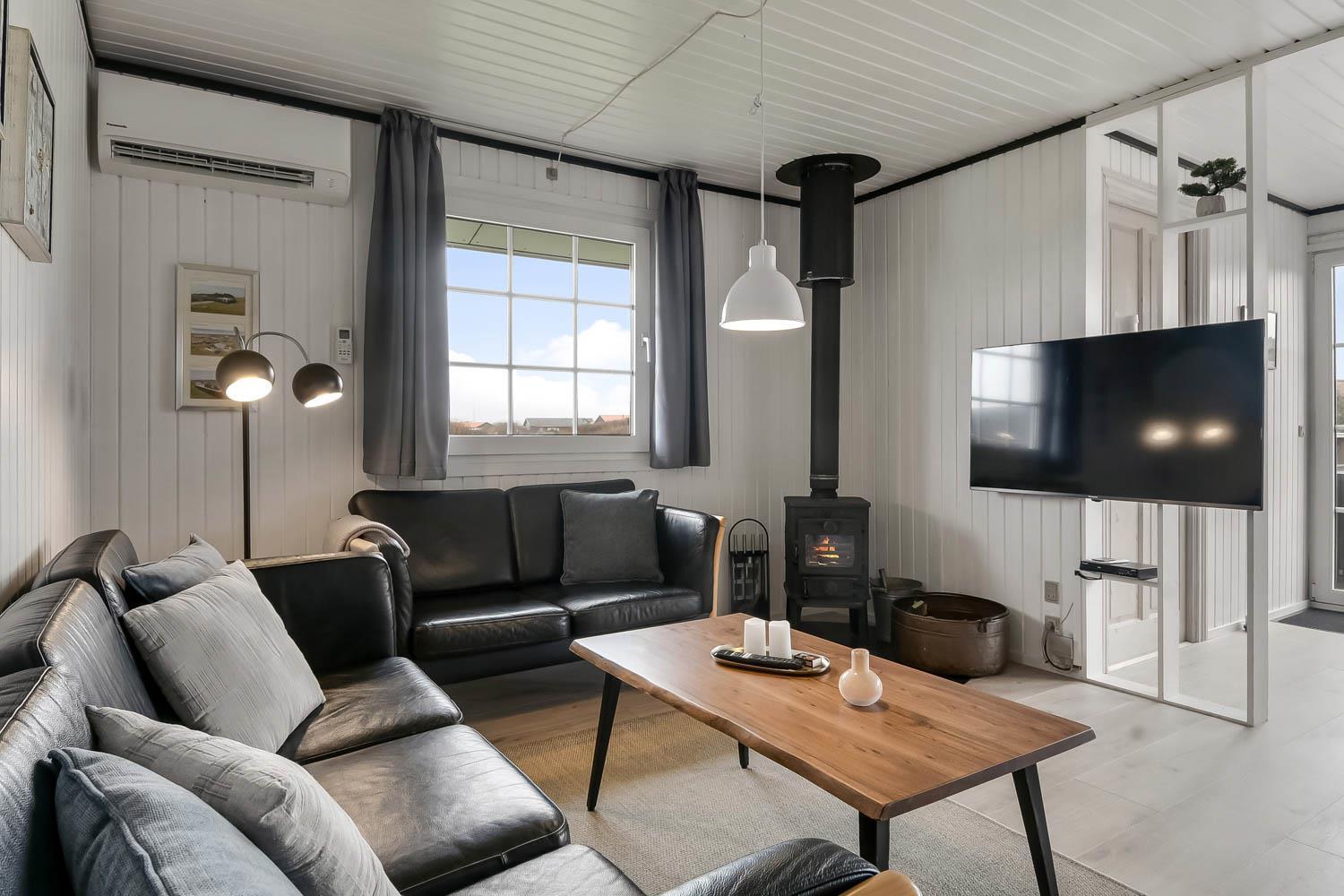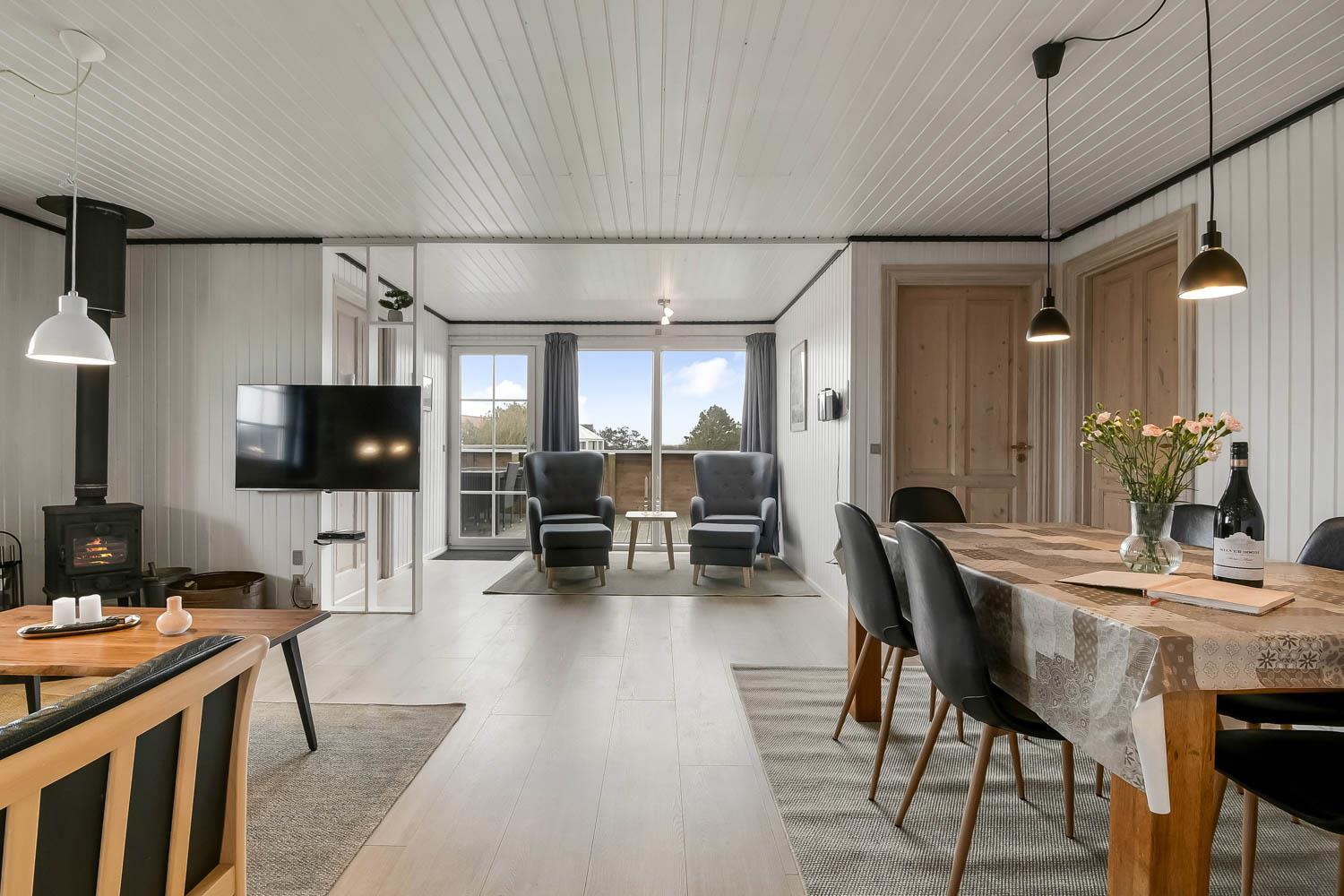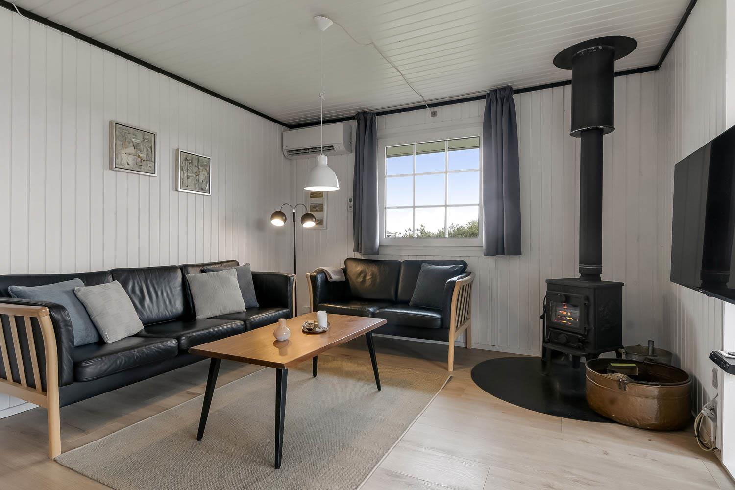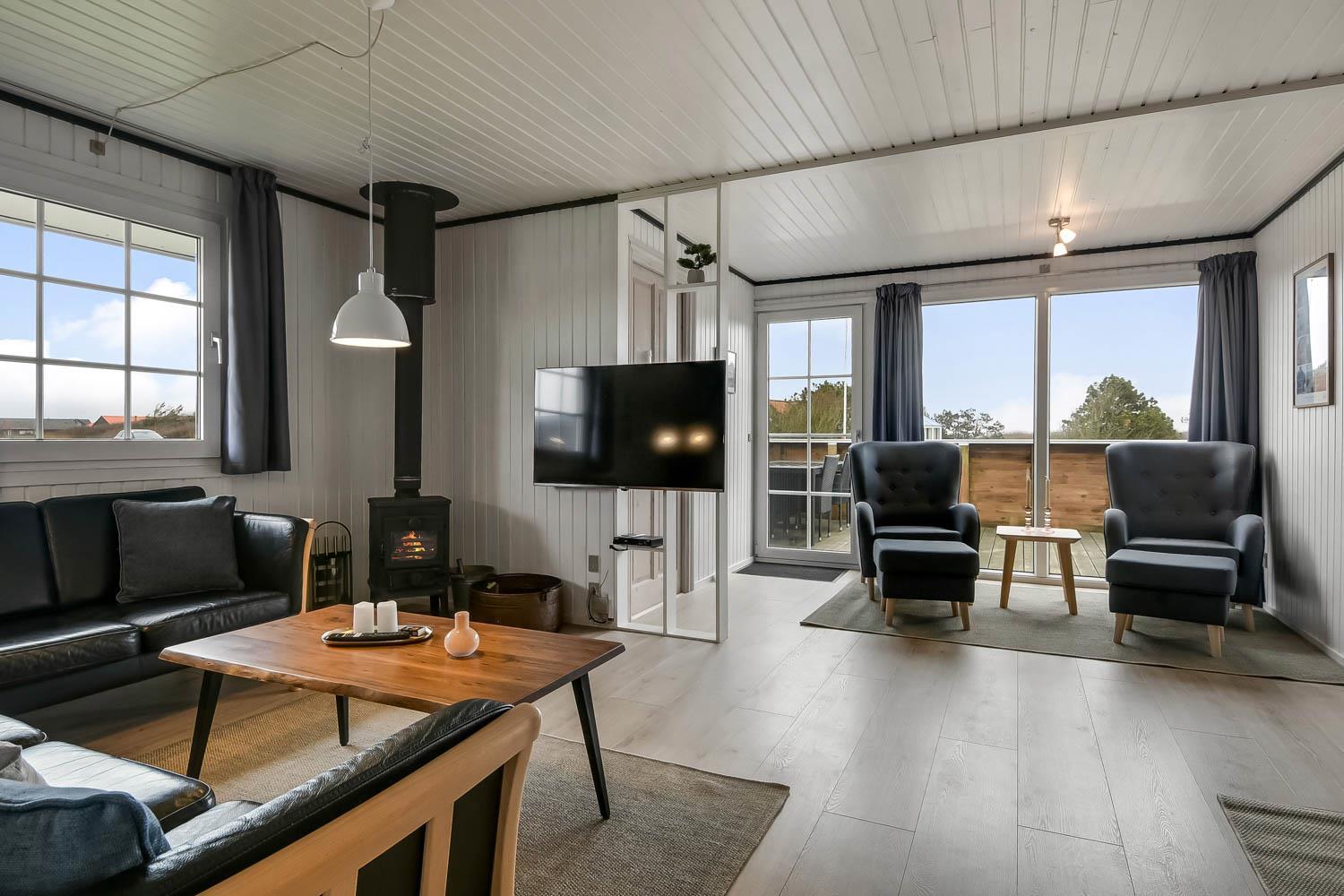 Køkkenet er fra 2022 og veludstyret med opvaskemaskine, 44 liter fryser, glaskeramisk komfur med emhætte, køleskab og mikrobølgeovn. I opholdsstuen er der brændeovn, stereoanlæg med CD,DVD, samt 50 " Smart Tv med indbygget chromecast og med DR kanalerne. Samt tyske satellitkanaler. Der er installeret varmepumpe i huset og det betyder at du som gæst kan spare en del på din elvarmeregning - varmepumpen leverer op til 4 gange så meget effekt som den bruger, det betyder at for hver kilowatt-time pumpen bruger yder den varme svarende til ca. 4 kW - energien udnyttes dermed langt bedre. Huset har 3 gode soveværelser: Et soveværelse med dobbeltseng på 140 cm og et med dobbeltseng på 160 cm og et med 2 enkeltsenge. Huset har hele 2 badeværelser og det ene har brusemulighed, opvarmet flisegulv, og en 2-personers spabad. I det andet badeværelse er der også en bruseniche og opvarmet flisegulv. Fra dette badeværelse er der direkte adgang til saunaen. Hertil er der et ekstra rum med vaskemaskine og tørretumbler. Huset er desuden udstyret med barneseng og høj barnestol. Huset er generelt hyggeligt indrettet og møbleret med flotte møbler sat i udtryk via trægulve i soverummene og trægulve med løse tæpper i køkken, stue og gang. Væggene og lofterne er beklædt med træ.