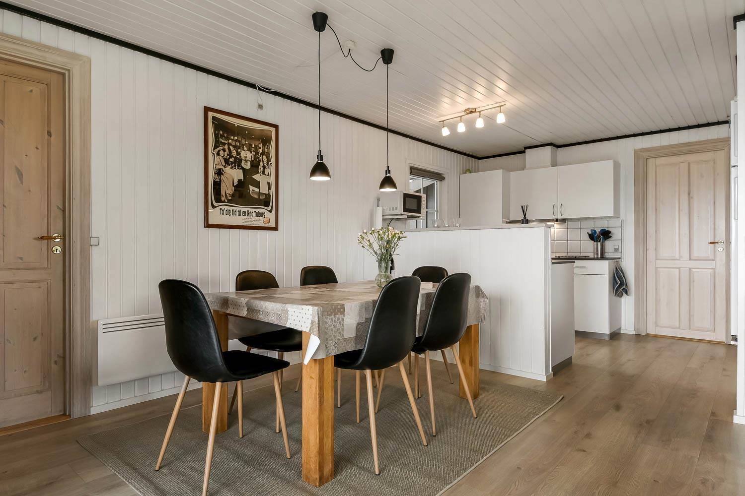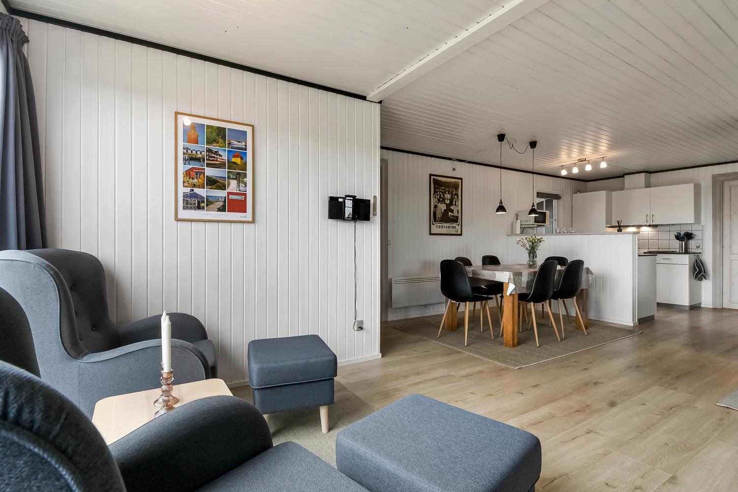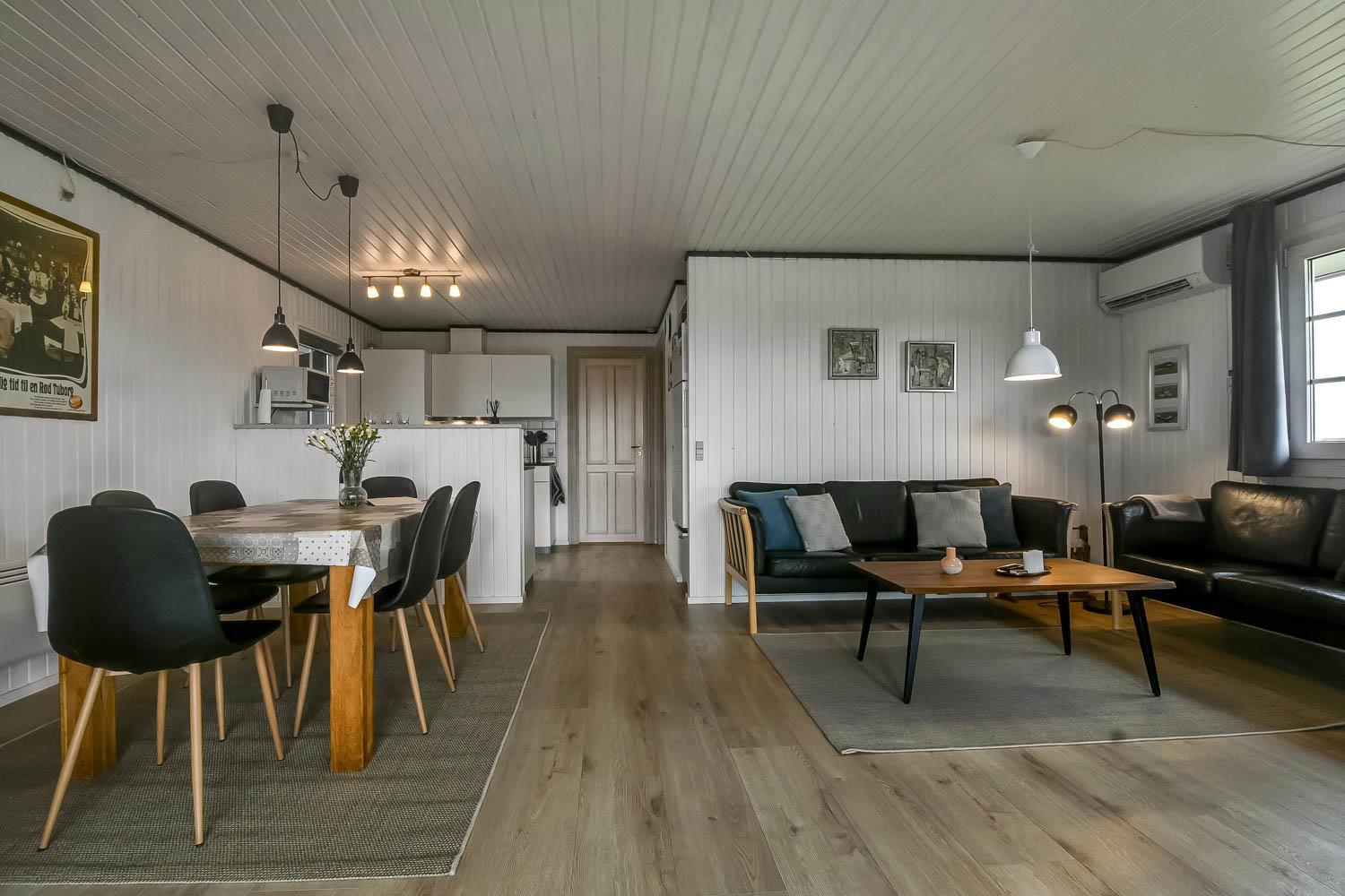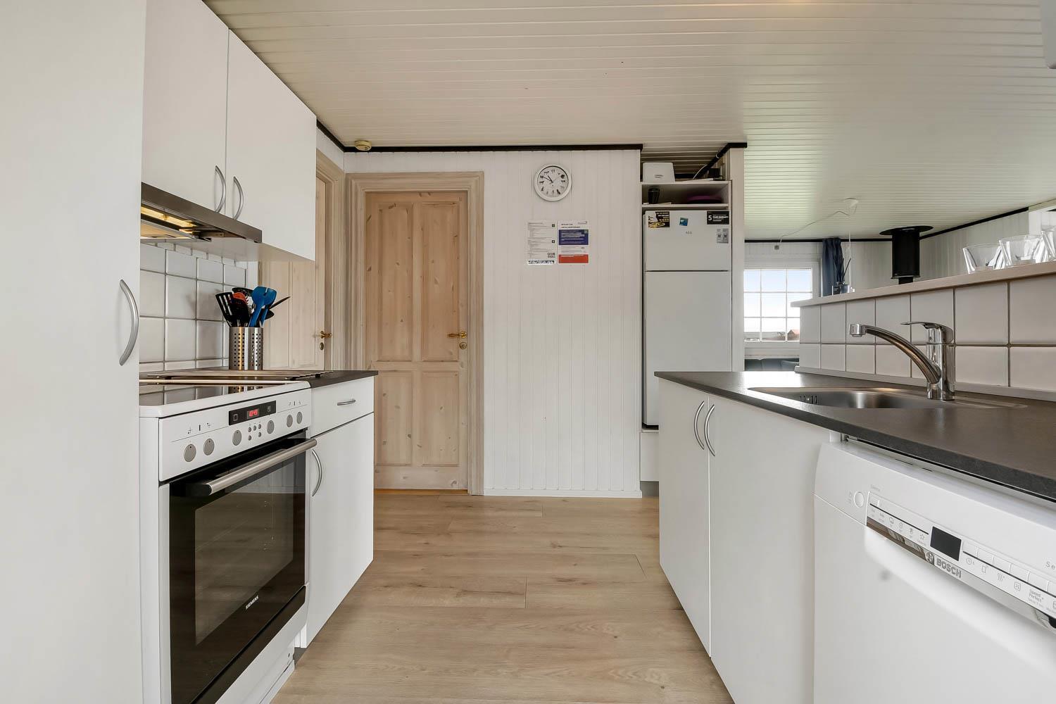 Køkkenet er fra 2022 og veludstyret med opvaskemaskine, 44 liter fryser, glaskeramisk komfur med emhætte, køleskab og mikrobølgeovn. I opholdsstuen er der brændeovn, stereoanlæg med CD,DVD, samt 50 " Smart Tv med indbygget chromecast og med DR kanalerne. Samt tyske satellitkanaler. Der er installeret varmepumpe i huset og det betyder at du som gæst kan spare en del på din elvarmeregning - varmepumpen leverer op til 4 gange så meget effekt som den bruger, det betyder at for hver kilowatt-time pumpen bruger yder den varme svarende til ca. 4 kW - energien udnyttes dermed langt bedre. Huset har 3 gode soveværelser: Et soveværelse med dobbeltseng på 140 cm og et med dobbeltseng på 160 cm og et med 2 enkeltsenge. Huset har hele 2 badeværelser og det ene har brusemulighed, opvarmet flisegulv, og en 2-personers spabad. I det andet badeværelse er der også en bruseniche og opvarmet flisegulv. Fra dette badeværelse er der direkte adgang til saunaen. Hertil er der et ekstra rum med vaskemaskine og tørretumbler. Huset er desuden udstyret med barneseng og høj barnestol. Huset er generelt hyggeligt indrettet og møbleret med flotte møbler sat i udtryk via trægulve i soverummene og trægulve med løse tæpper i køkken, stue og gang. Væggene og lofterne er beklædt med træ.