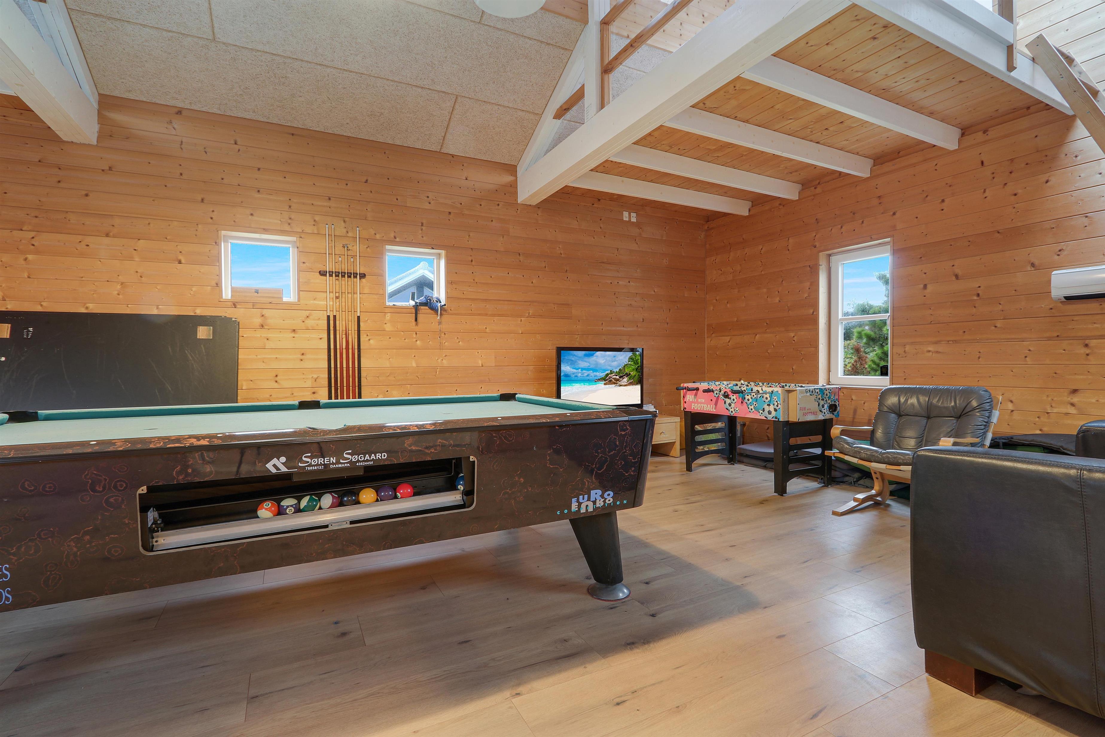 Velindrettet feriehus på 216 m2. 5 dejlige soverum med helt nye senge (1DS+1KS, 1DS+1KS, 1DS, 1DS, 2ES). Derudover forefindes 1 store hems med hver 2 sovepladser. Huset er med et veludstyret nyere køkken alrum med alt i hårde hvidevarer. Stor glaskeramisk plade, emhætte, indbygningsovn, opvaskemaskine, mikroovn, 2 køle / fryse skabe. Alle 12 beboere kan samles om husets store spisebord som også er perfekt til spil og hyggesnak. Slap af i de bløde lædermøbler. Se TV på dansk og tysk på husets Smart-TV med tyske og danske programmer samt mulighed for streaming af TV / radio / Apps, så har du en mobiltelefon eller et andet device med kan du streame hvad du nu har abonnement. Der er trægulve i opholdsrum og gulvtæpper i soveværelserne. Tænd op i brændeovnen som let hjælper med opvarmningen sammen med varmepumpen eller blot sørger for en hyggelig stemning. Fra fordelergangen er der udgang til en totalt privat terrasse med en stor udendørs spa. Aktivitetsrummet indeholder: dart bordfodbold og kombineret pool / billard. Vaskemaskine og tørretumbler er en selvfølge. 2 badeværelser. Det store badeværelse har toilet, bruser, håndvask, gulvvarme samt Wellness- / saunaafdeling med spabad med massagedyser samt dejlig infraød sauna et ekstra toilet med håndvask. Det andet badeværelse har ligeledes toilet, håndvask, gulvvarme og en dejlig bruser. Herudover er der endnu et toilet med håndvask. Til børnene er der barneseng og barnestol. Max. 2 husdyr er tilladt. Ikke ryger hus. Huset lejes ikke ud til ungdomsgrupper