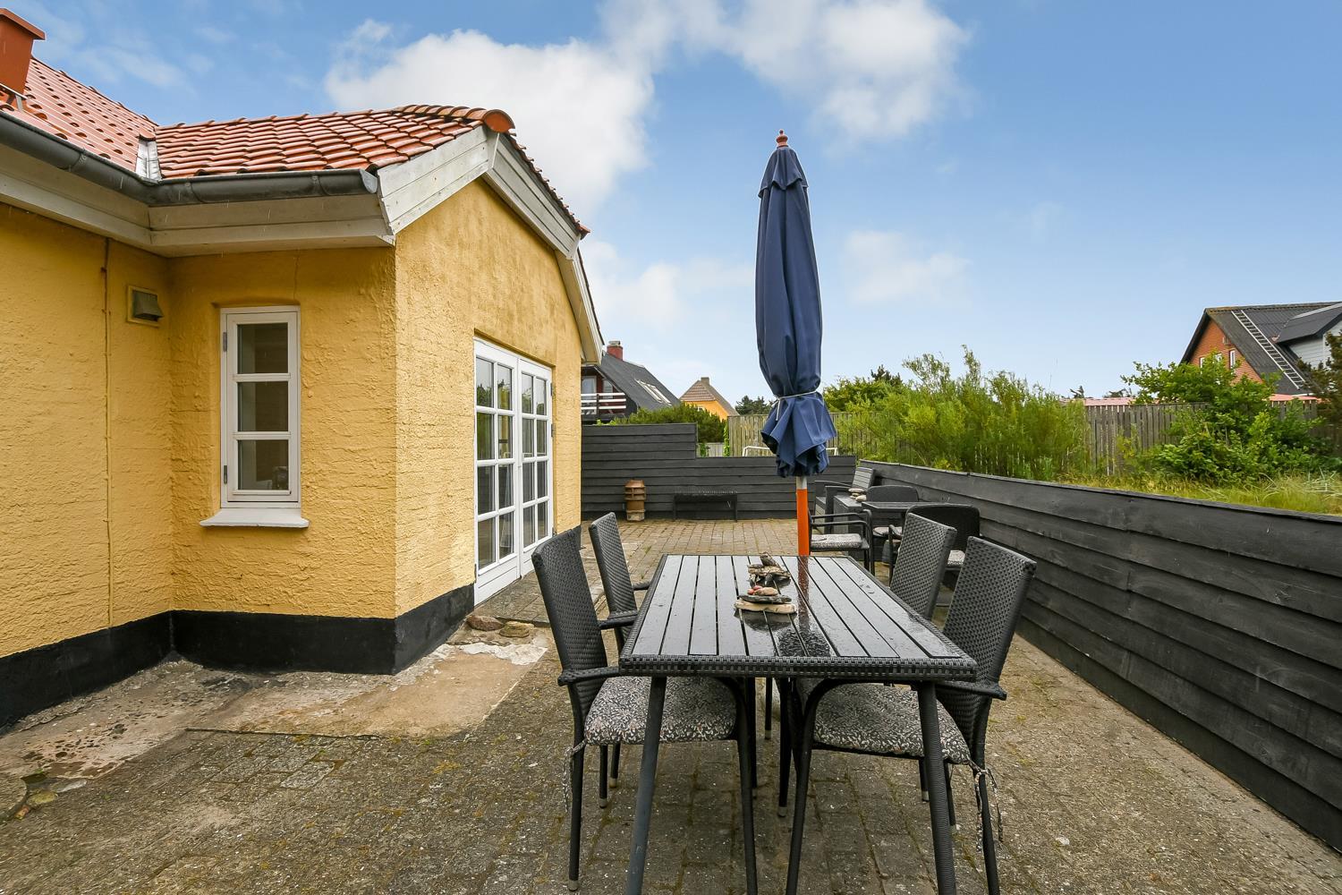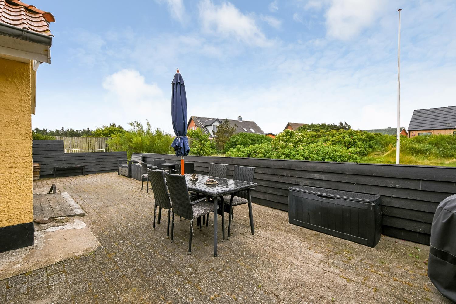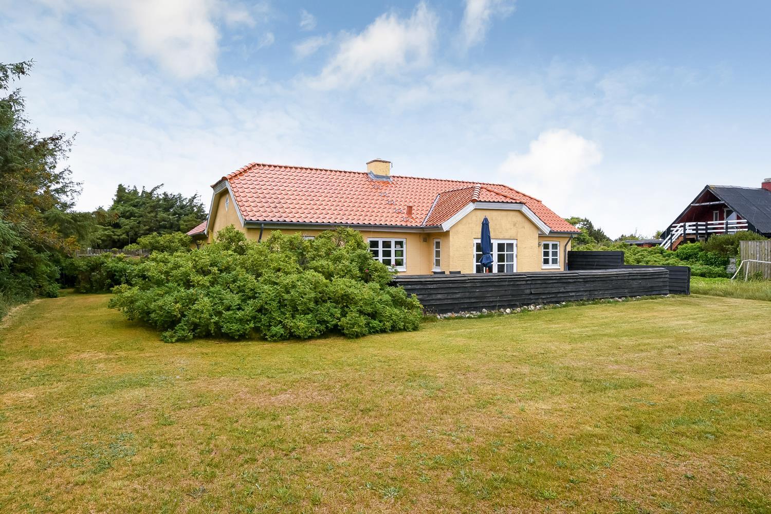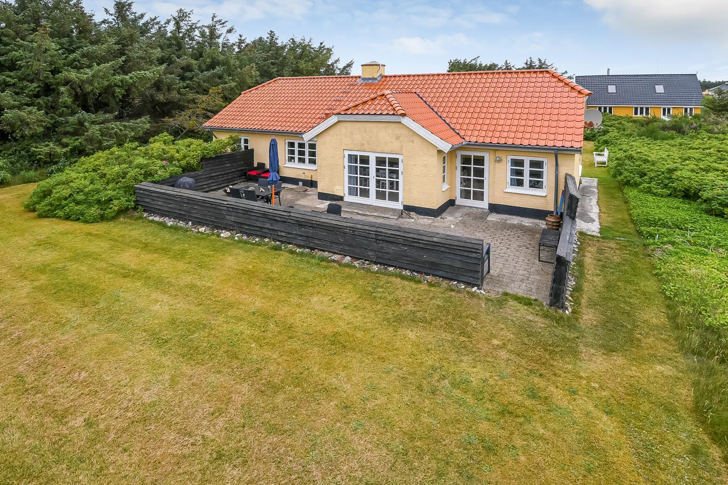Dette skønne feriehus ligger på en 1900 m2 stor grund og er dejligt tilbagetrukket med godt læ til alle sider. Den hyggelige østvendte terrasse med havemøbler er omkranset af halvmur, der bare indbyder til, at morgenkaffen her kan nydes i ro og fred. På den sydvendte terrasse er der havemøbler, 2 solvogne og grill, hvor man kan slutte de sene sommeraftener af og lytte til Vesterhavet, der suser og bruser bag klitterne kun får hundrede meter fra huset.
