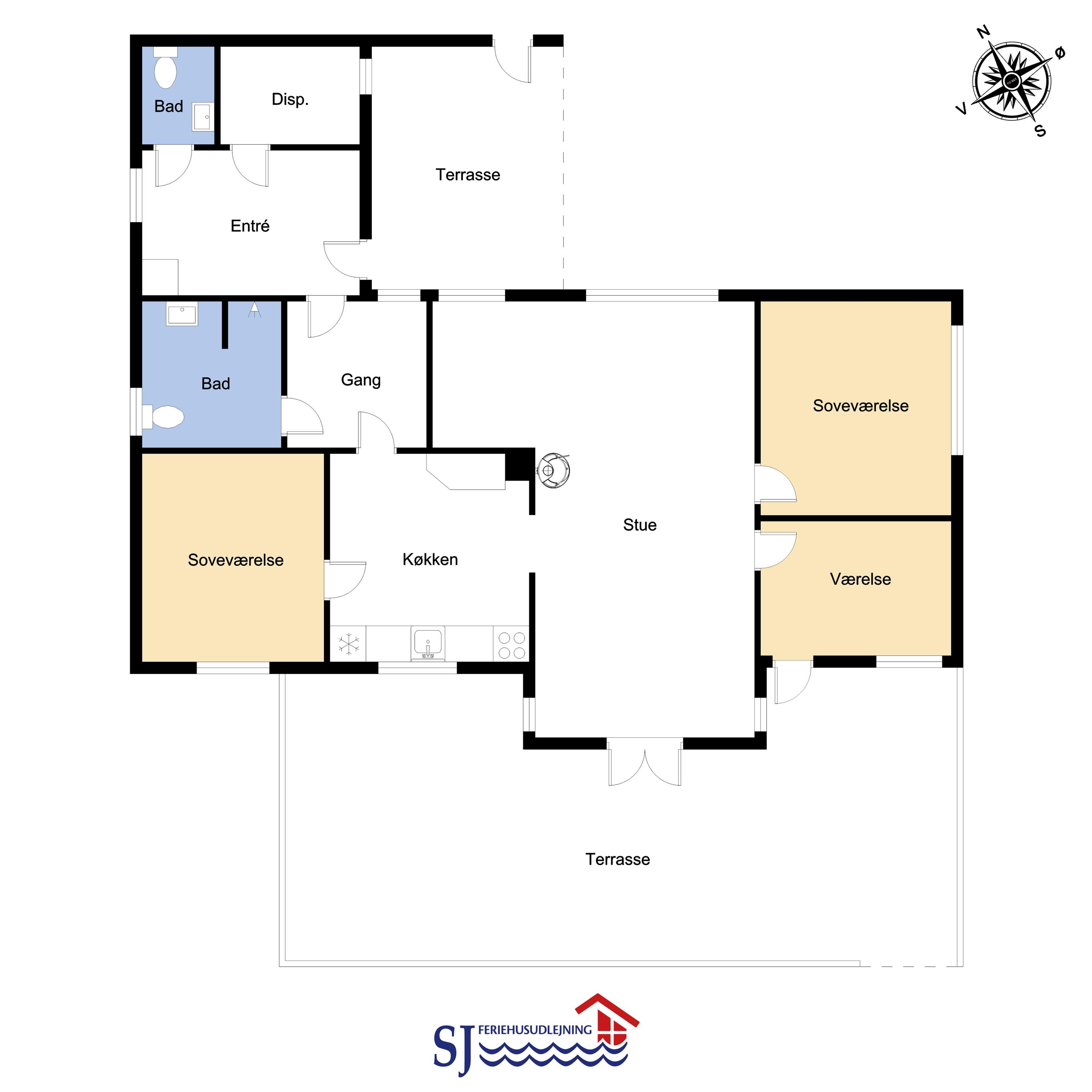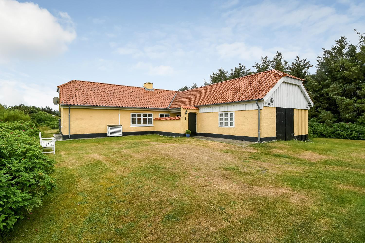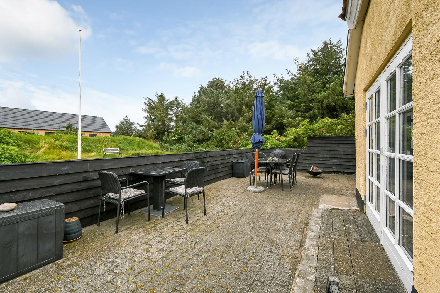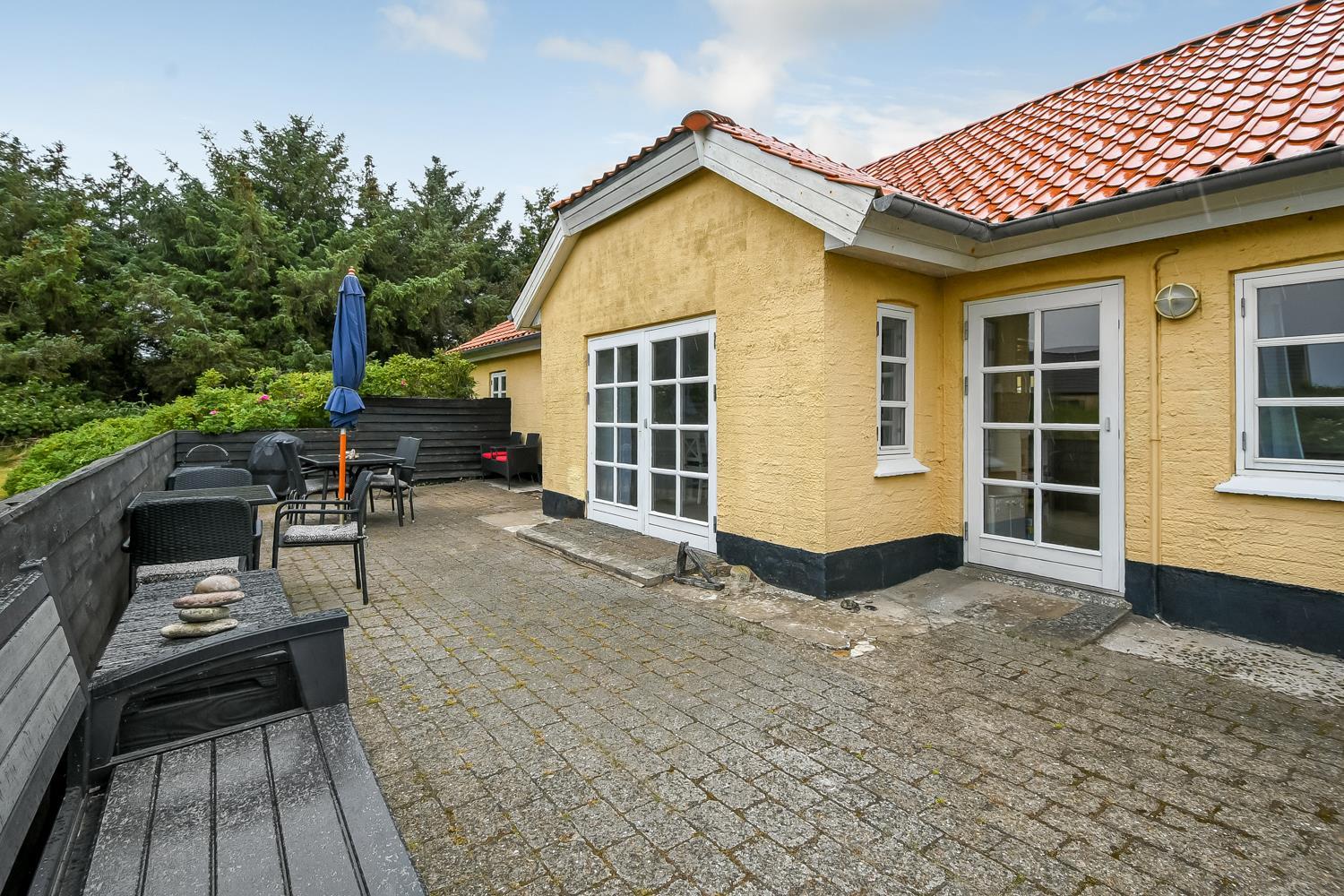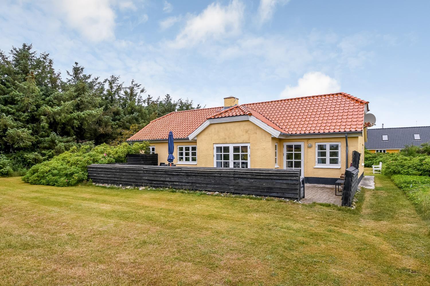 Dette skønne feriehus ligger på en 1900 m2 stor grund og er dejligt tilbagetrukket med godt læ til alle sider. Den hyggelige østvendte terrasse med havemøbler er omkranset af halvmur, der bare indbyder til, at morgenkaffen her kan nydes i ro og fred. På den sydvendte terrasse er der havemøbler, 2 solvogne og grill, hvor man kan slutte de sene sommeraftener af og lytte til Vesterhavet, der suser og bruser bag klitterne kun får hundrede meter fra huset.