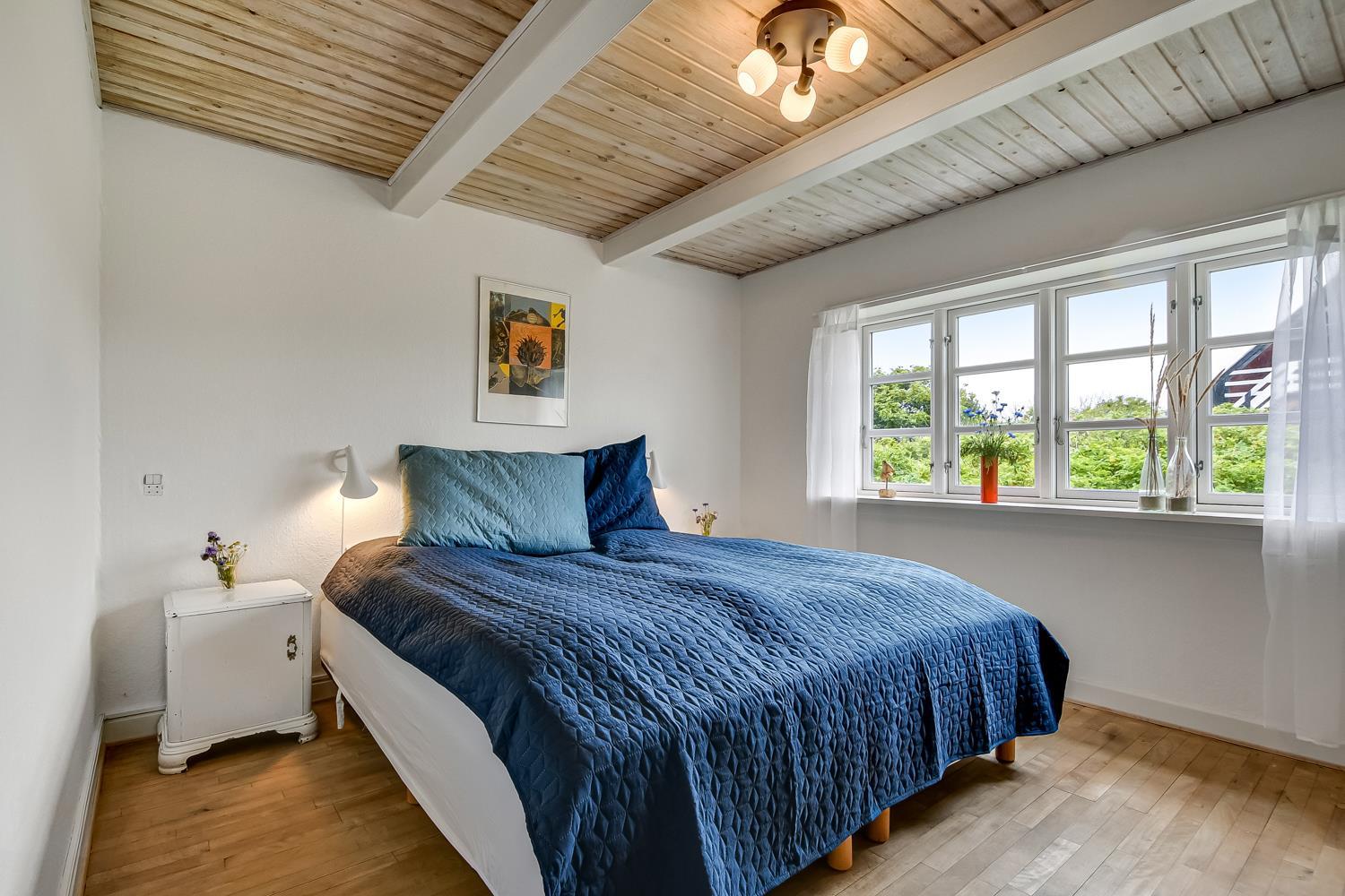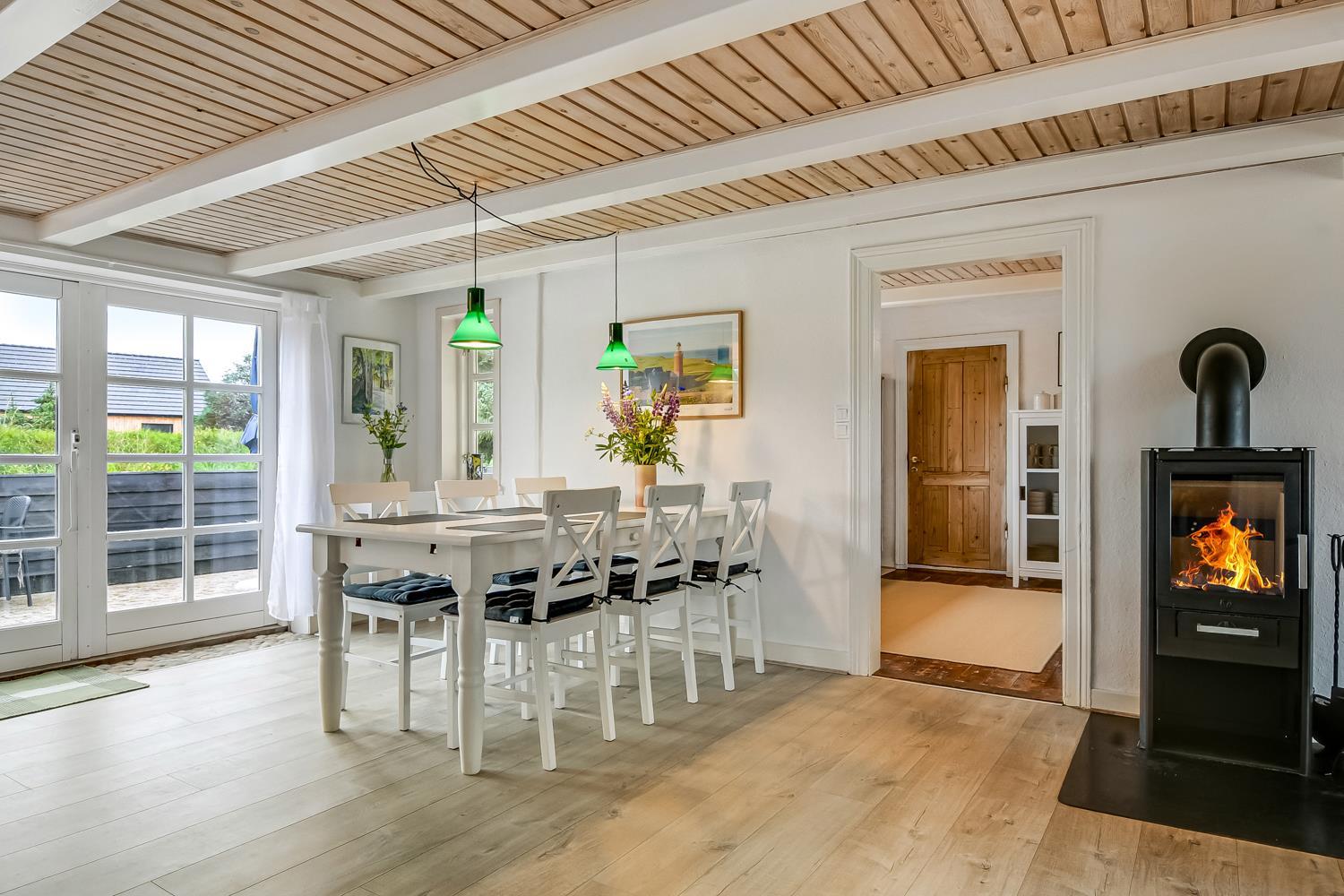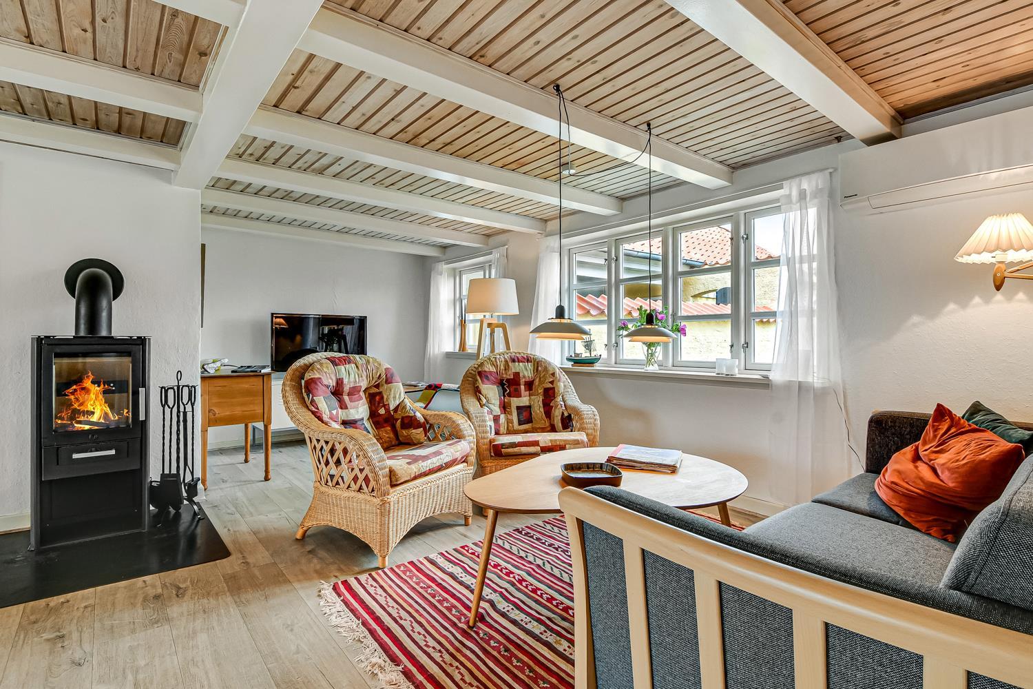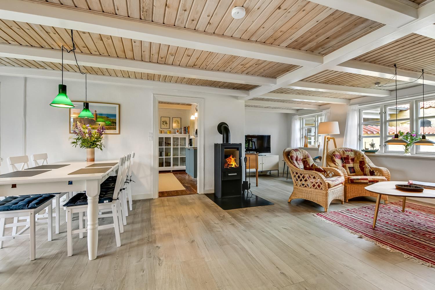 Dette historiske hus på 100 m2 er fra 1877 og er forfatteren Erik Bertelsens fødehjem (bl.a. kendt for sangen ”Blæsten går frisk over Limfjordens vande”). Husets største rum er den dejlige store og lyse stue, hvor de mange vinduer bidrager til et godt lysindfald. I stuen er der polstermøbler, fjernsyn med danske og tyske kanaler og radio. Fra stuen er der udgang til den store sydvendte terrasse, hvor der er mulighed for at nyde grill og sol. Stuen kan opvarmes med den energisparende varmepumpe eller man kan tænde op i den hyggelige brændeovn. I størstedelen af huset er de gamle autentiske loftsbjælker bevaret. Man skal derfor være opmærksom på at der i stuen er lavere til loftet (1,90 m). Køkkenet har alt hvad man skal bruge til ferien. Her er der induktionskogeplader, ovn, emhætte, køle-/fryseskab, opvaskemaskine og mikroovn i et helt nyrenoveret køkken. Huset har tre gode lyse soveværelser. To værelser er med en dobbeltseng og det sidste værelse er med en sovesofa. Fra soveværelset med sovesofa er der også udgang til den store sydvendte terrasse. Husets badeværelse er med toilet, håndvask og bruser og opvarmes med gulvvarme. Desuden har huset et gæstetoilet. Der er mulighed for tøjvask i vaskemaskine. Til de mindste gæster er der en barnestol og en barneseng til rådighed. Tæt på huset er der opsat 2 ladestationer til elbiler.