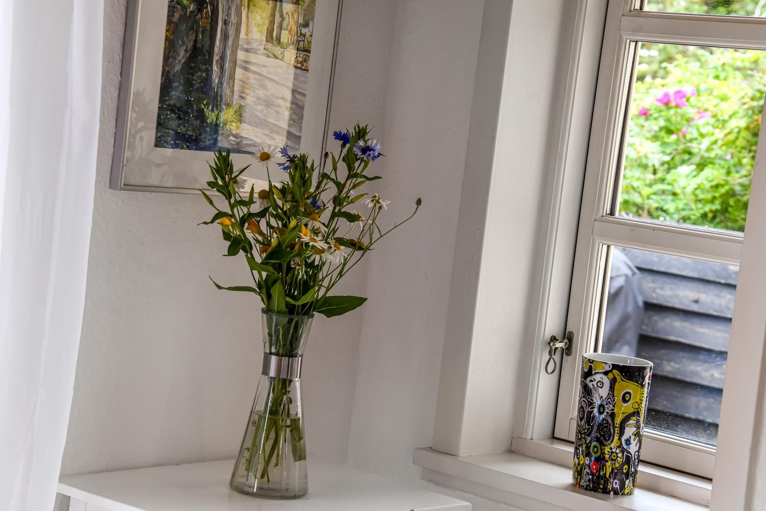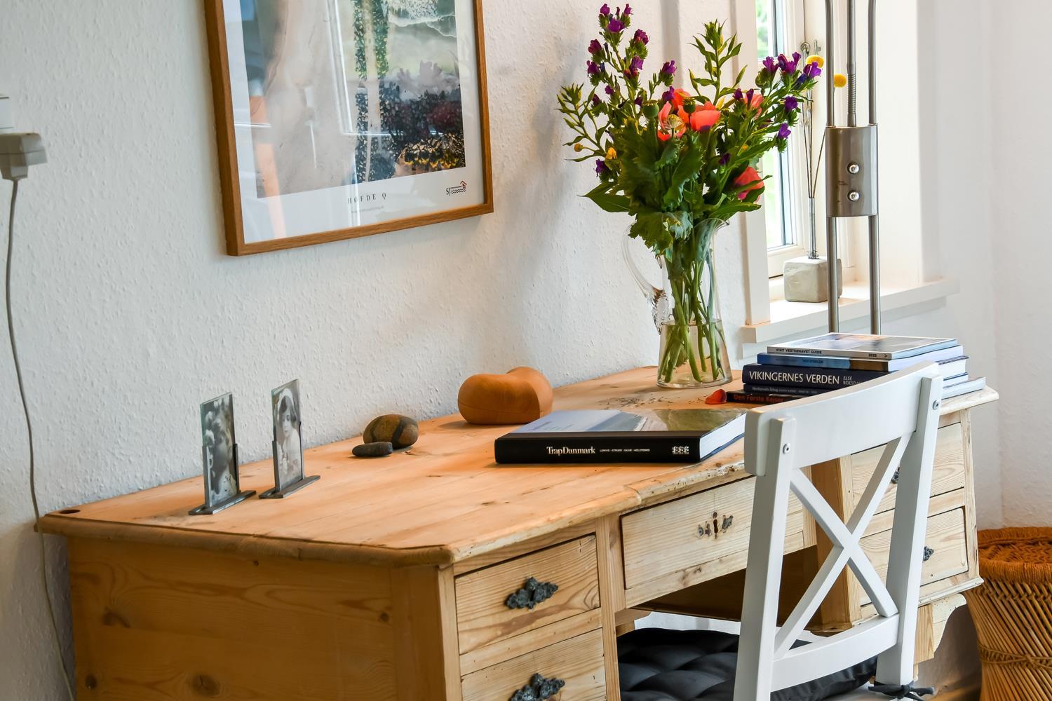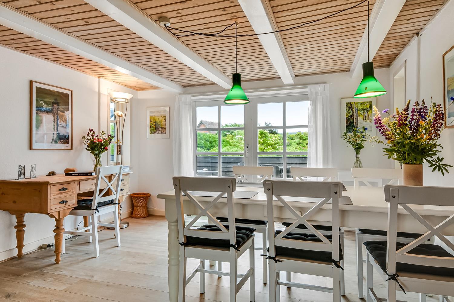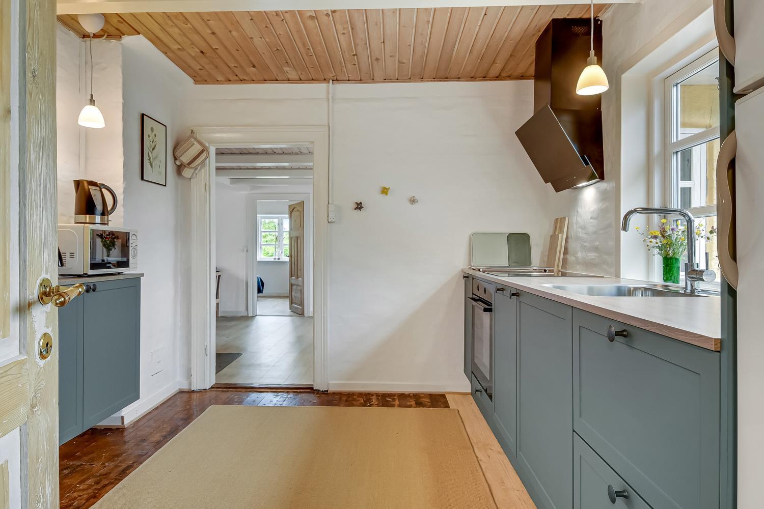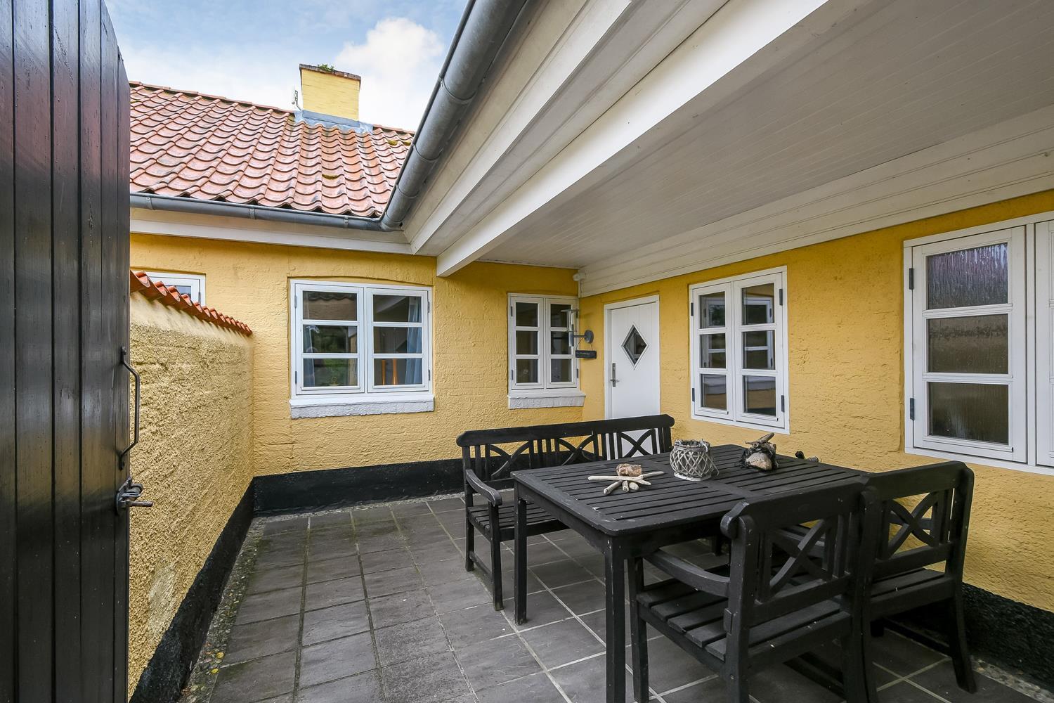 Dette historiske hus på 100 m2 er fra 1877 og er forfatteren Erik Bertelsens fødehjem (bl.a. kendt for sangen ”Blæsten går frisk over Limfjordens vande”). Husets største rum er den dejlige store og lyse stue, hvor de mange vinduer bidrager til et godt lysindfald. I stuen er der polstermøbler, fjernsyn med danske og tyske kanaler og radio. Fra stuen er der udgang til den store sydvendte terrasse, hvor der er mulighed for at nyde grill og sol. Stuen kan opvarmes med den energisparende varmepumpe eller man kan tænde op i den hyggelige brændeovn. I størstedelen af huset er de gamle autentiske loftsbjælker bevaret. Man skal derfor være opmærksom på at der i stuen er lavere til loftet (1,90 m). Køkkenet har alt hvad man skal bruge til ferien. Her er der induktionskogeplader, ovn, emhætte, køle-/fryseskab, opvaskemaskine og mikroovn i et helt nyrenoveret køkken. Huset har tre gode lyse soveværelser. To værelser er med en dobbeltseng og det sidste værelse er med en sovesofa. Fra soveværelset med sovesofa er der også udgang til den store sydvendte terrasse. Husets badeværelse er med toilet, håndvask og bruser og opvarmes med gulvvarme. Desuden har huset et gæstetoilet. Der er mulighed for tøjvask i vaskemaskine. Til de mindste gæster er der en barnestol og en barneseng til rådighed. Tæt på huset er der opsat 2 ladestationer til elbiler.