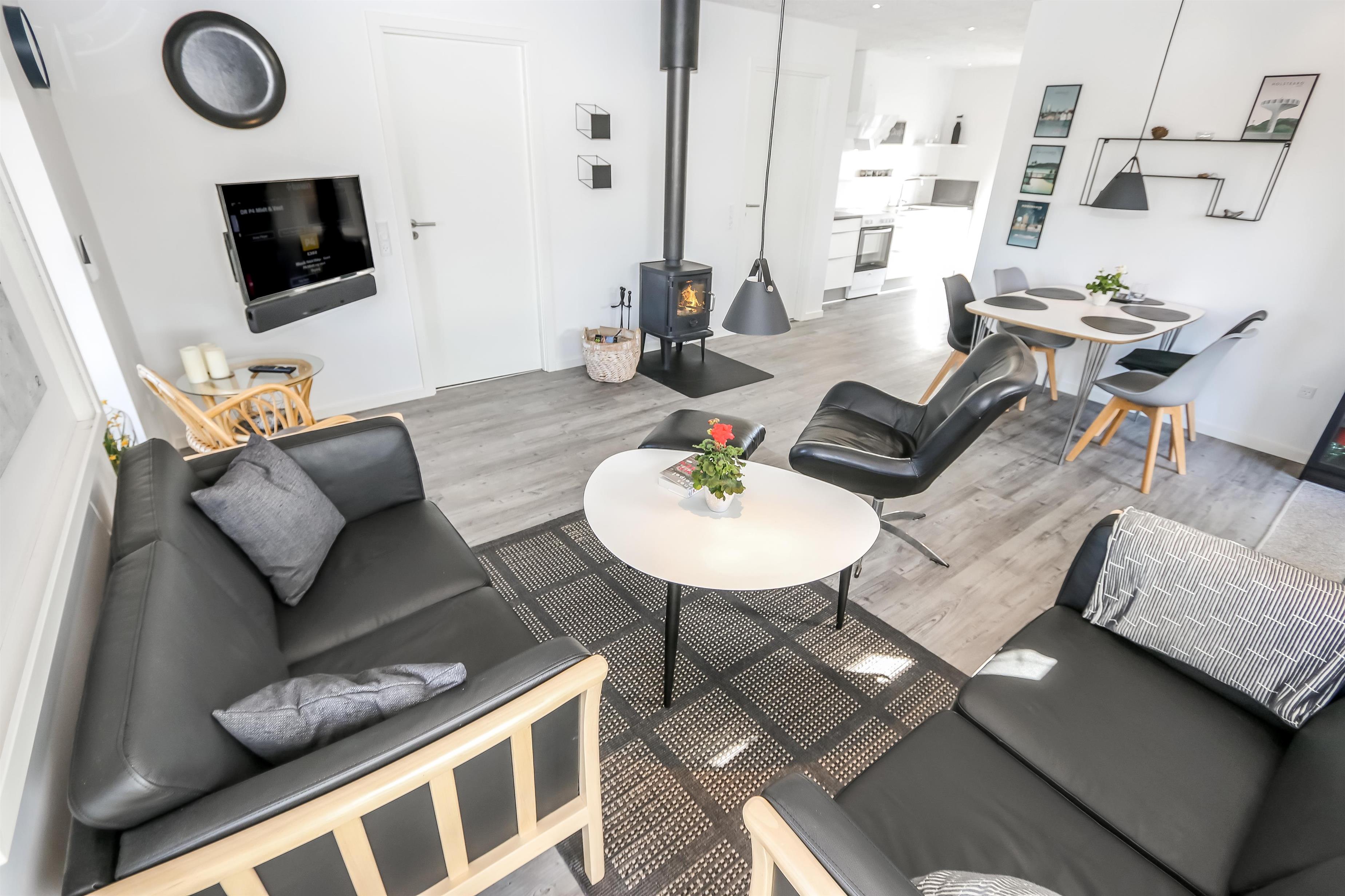 Fra stuen er er udgang til et dejligt terrasseanlæg giver unikke muligheder for en plads i solen hele dagen og der er masser af havemøbler. Der er ligeledes liggestole og grill, som kan flyttes efter behov samt et hyggeligt fast bord med 4 stubbe som siddeplads. Der er opdat kraftstik ved huset - som er pefket til opladning af hybrid- eller el-bil. Sandkasse til de mindste. Terrasseanlægget byder både åbne terrasser samt delvis overdækket terrasse med læ. Et helt fantastisk gennemført hus, som giver rammerne for en fantastisk ferie ved Vesterhavet der hver dag byder på nye maleriske oplevelse, der invitere til en frisk gå- eller løbetur. Eller hvad med en lille gåtur på ca. 15 – 20 min op til områdets lille købmand, som i sæsonen har åbent og byder på frisk morgenbrød, og hvor de daglige indkøb også kan klares. Så hvad enten du er til aktiv ferie eller total afslapning, danner dette flotte feriehus den perfekte ramme både hvad angår hus, beliggenhed og omgivelser.