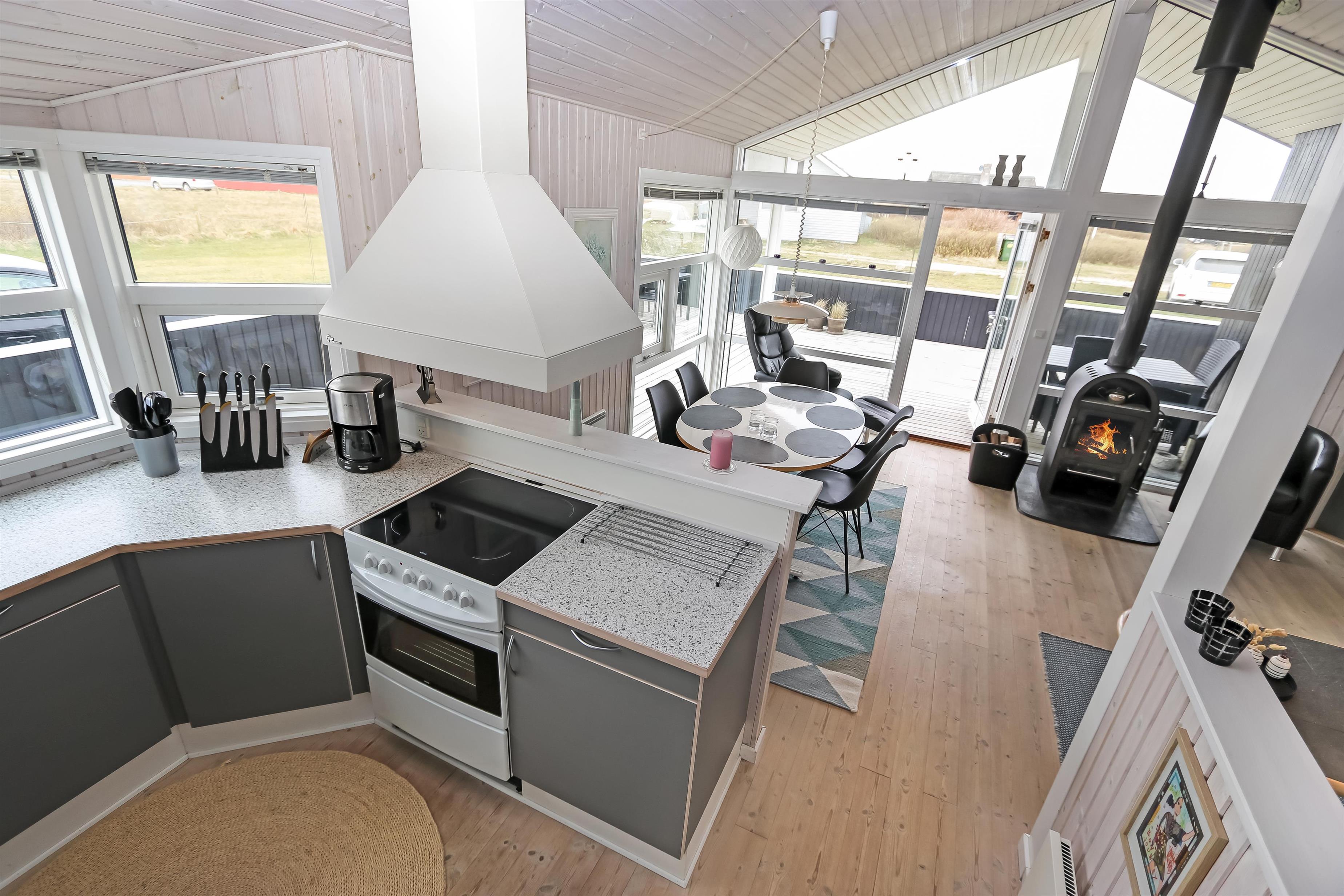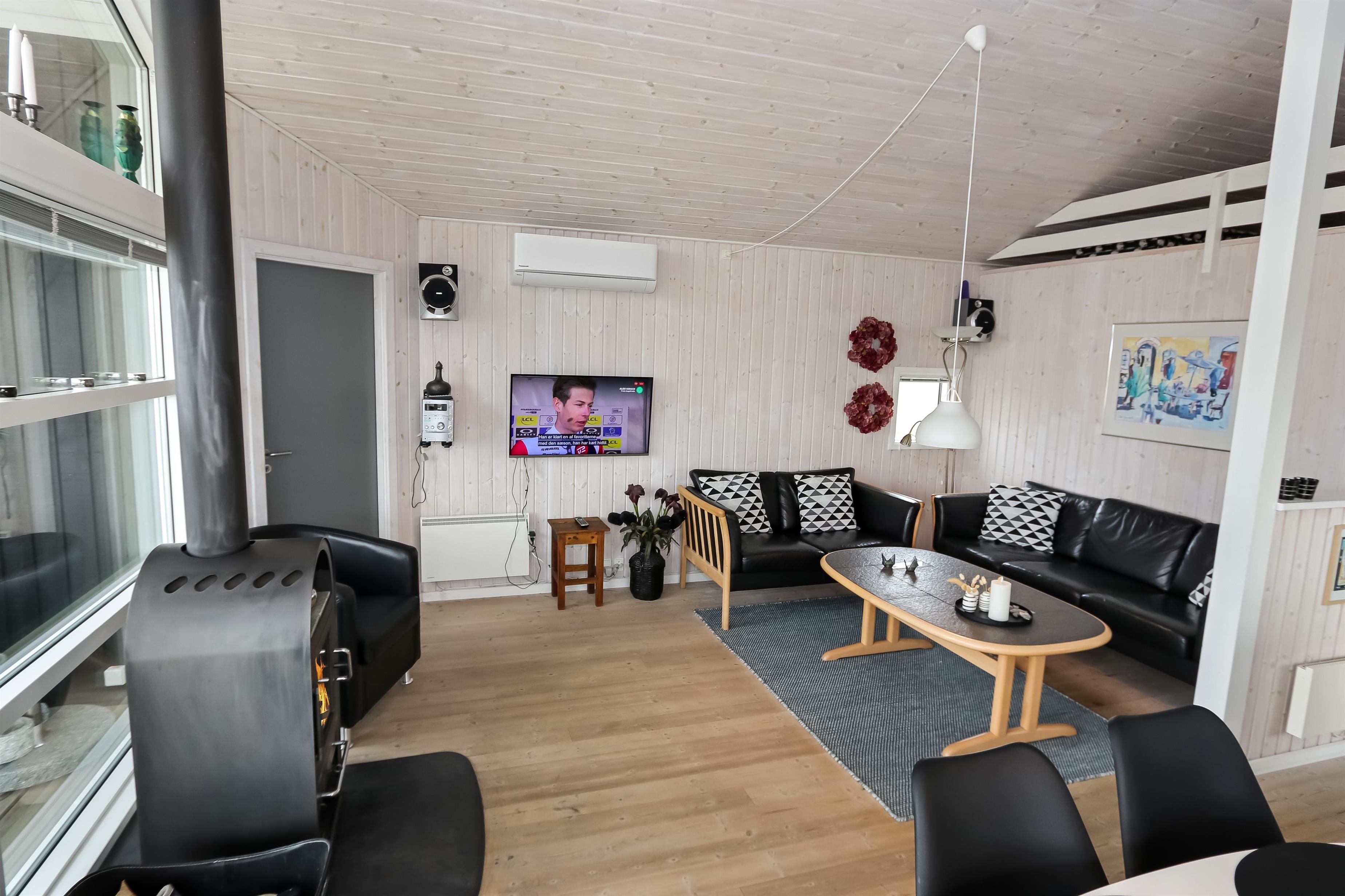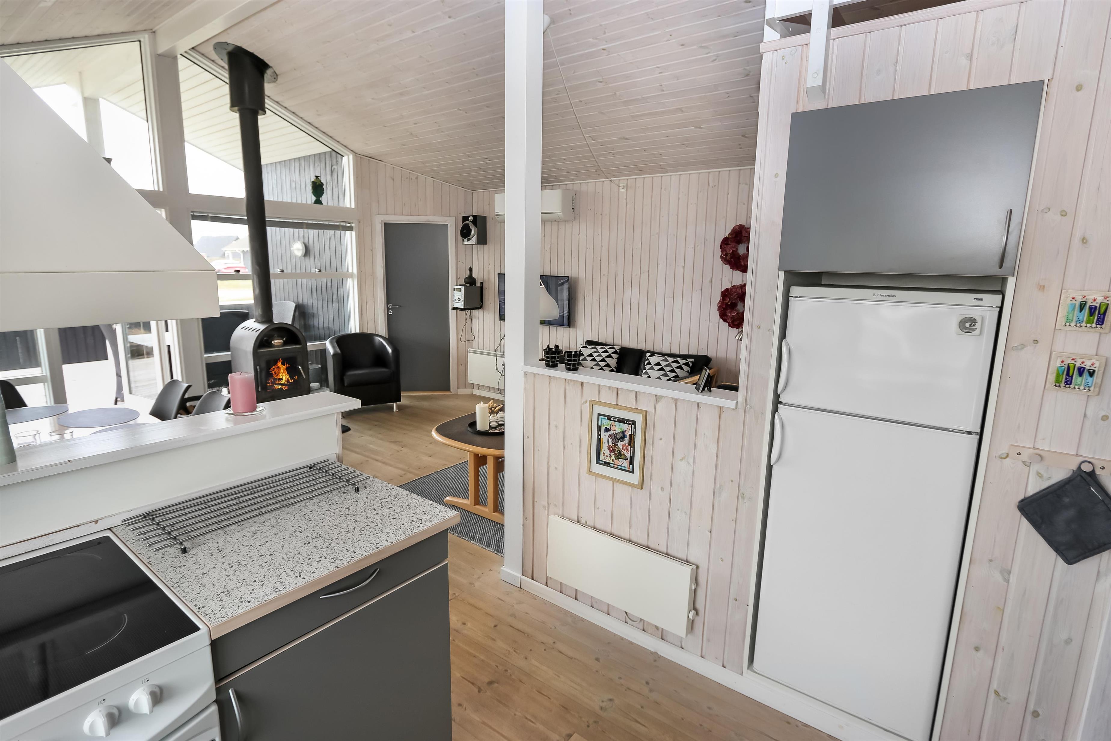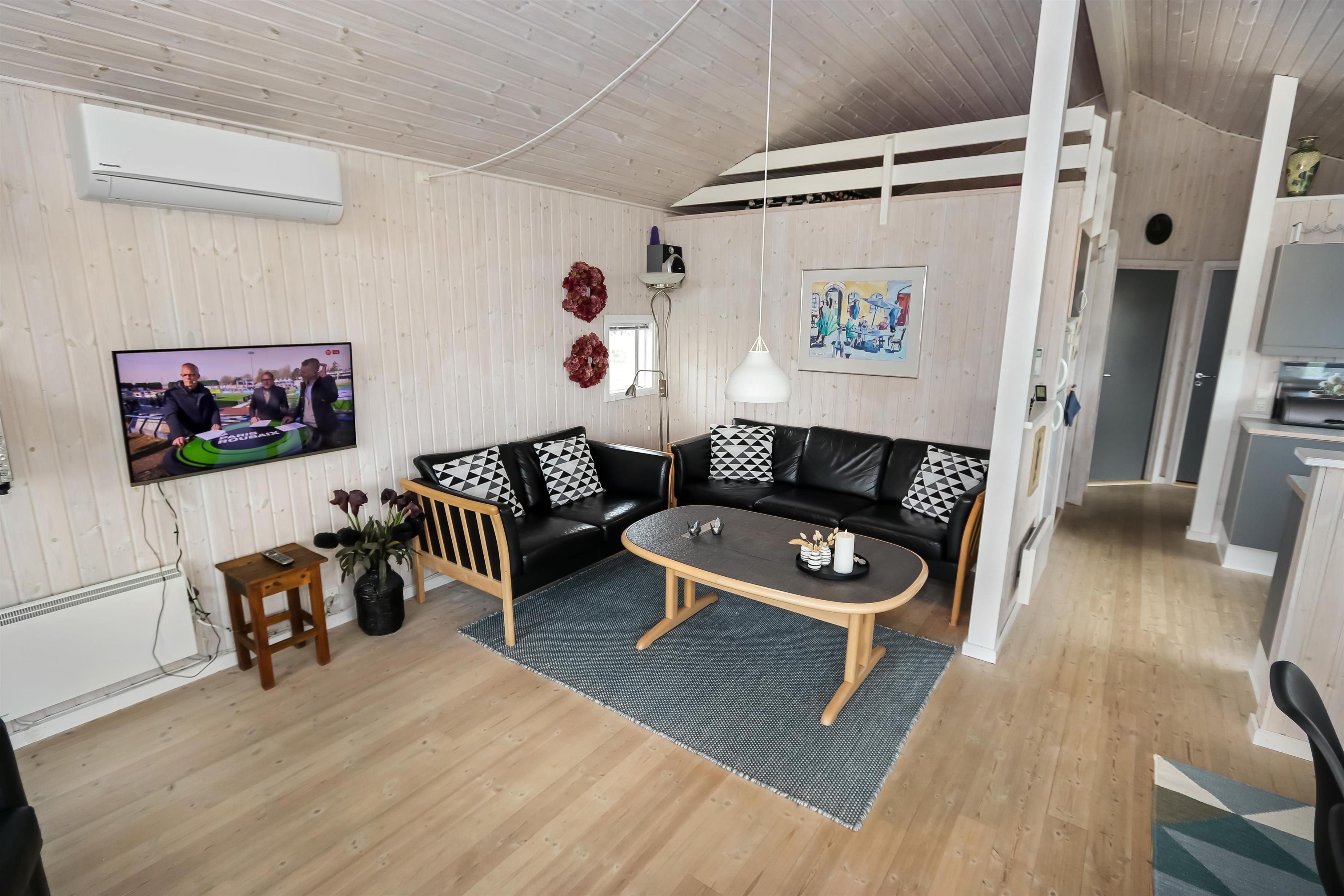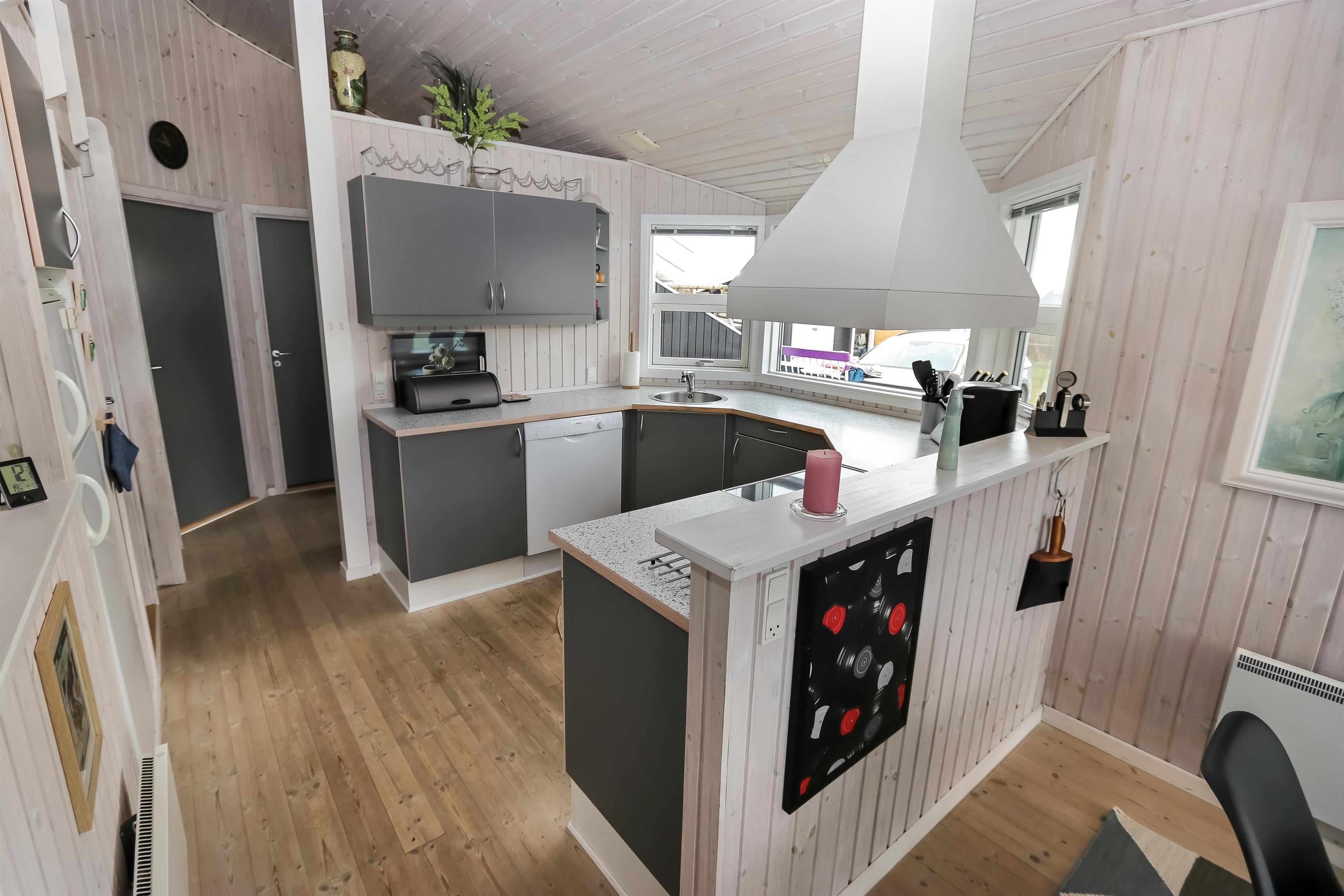 Godt indrettet og optimalt udnyttet hus på 90 m2. 3 dejlige soveværelser (1DS, 1DS, 2ES). Veludstyret køkkenhjørne i en flot grå kontrastfarver og med alt i hvidevare. Der er komfur med glaskeramisk kogeplade, emhætte, mikroovn, opvaskemaskine, køleskab fryseboks samt alt i service/køkkengrej. Åben opholdsstue i forbindelse med køkkenhjørnet med spisebord lige ved køkkenet, pæne lædermøbler, TV med danske og tyske kanaler, CD/Radio og en dejlig brændeovn. Stort badeværelse, hvor samme flotte grå kontrastfarve som i køkkenet går igen. Badeværelset har toilet, håndvask, bruser, spabad, direkte adgang til sauna, vaskemaskine og klinkegulv med gulvvarme. Gæstetoilet ligeledes med toilet, håndvask, bruser og klinkegulv med gulvvarme. Tørretumbler forefindes. Alle soverum samt opholdsrum har flotte trægulve som er nemme at rengøre. Der er installeret varmepumpe i huset. Ikke ryger hus. Husdyr ikke tilladt.