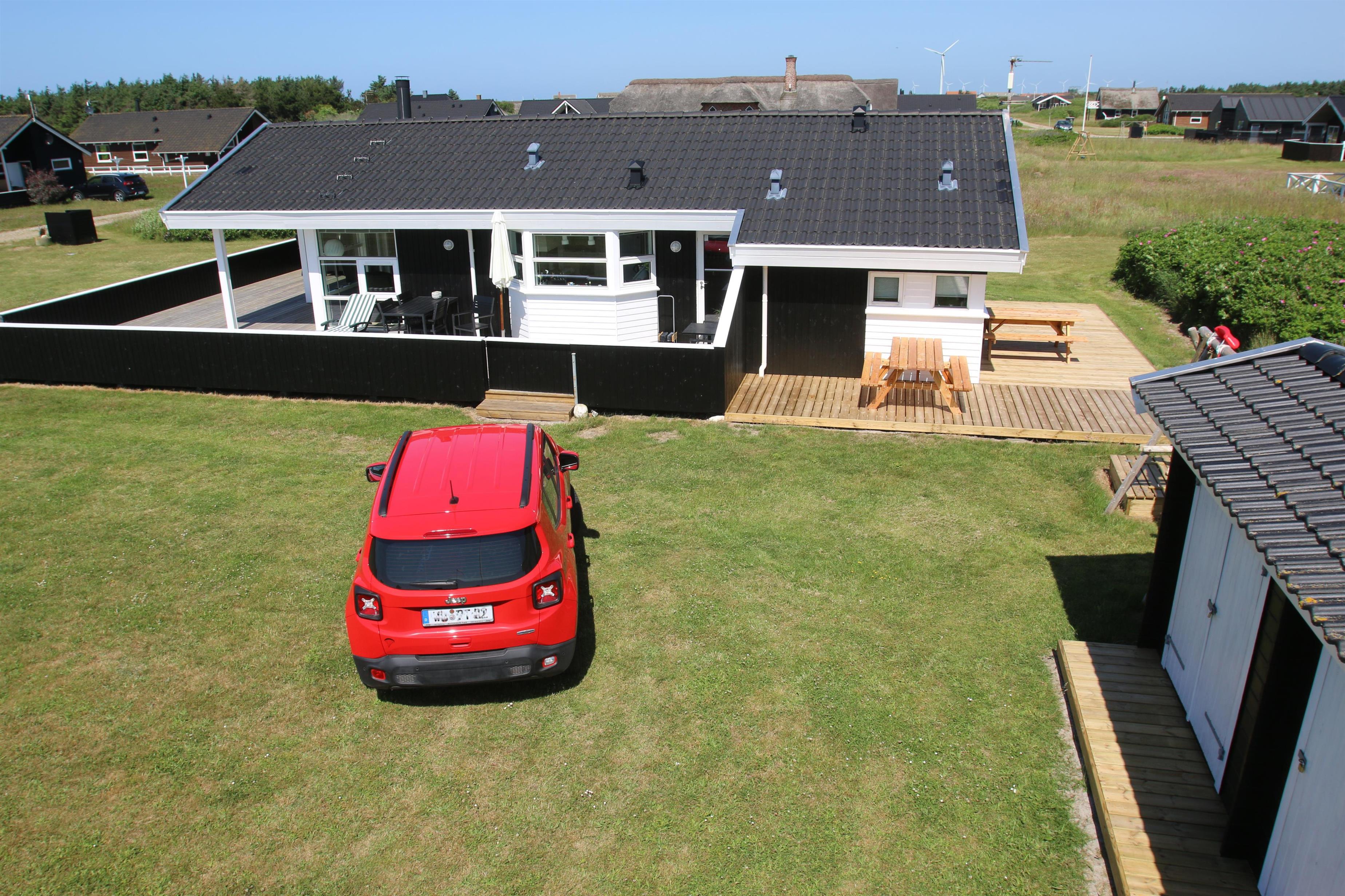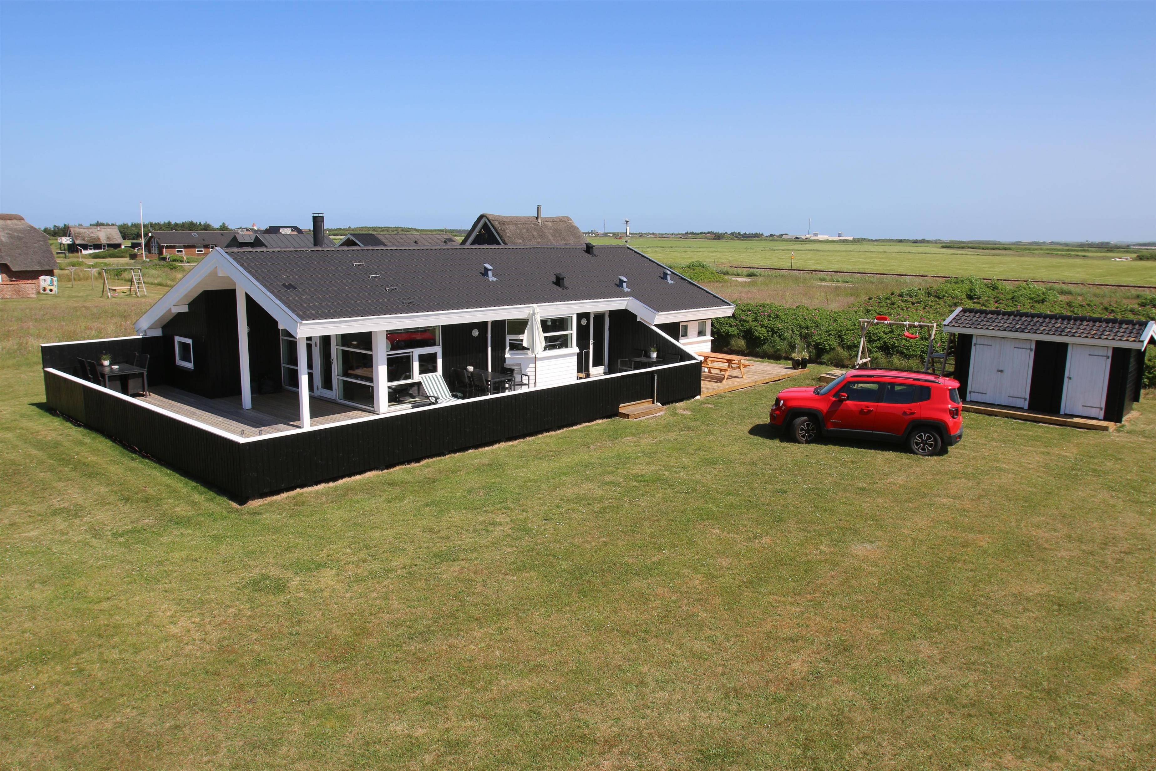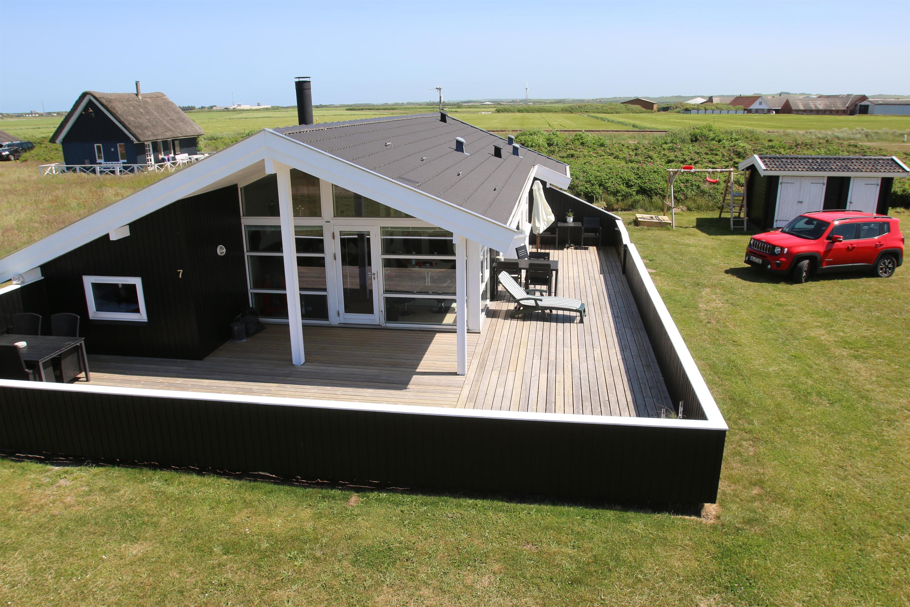 Pragtfuldt, velholdt træhus fra 2003 med gratis Internet, lukket terrasseanlæg og kun ca. 450m fra Vesterhavet og med udsigt til klitterne.