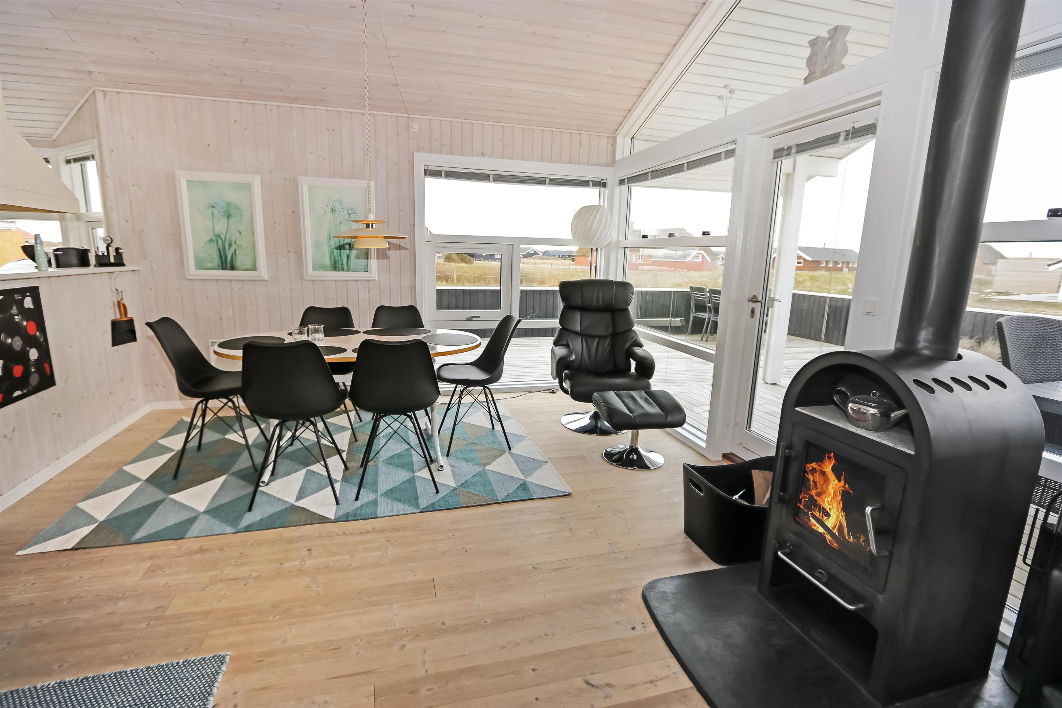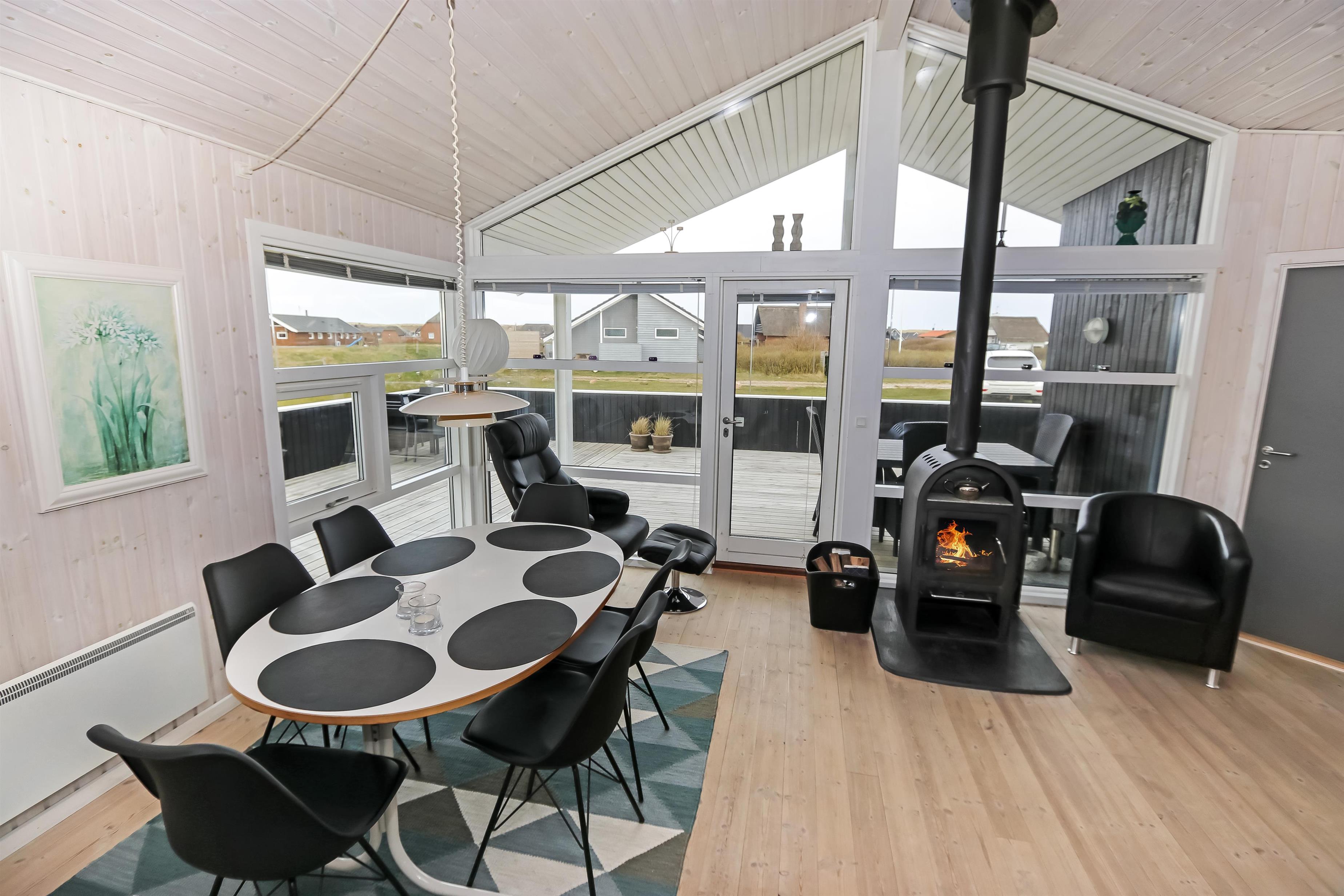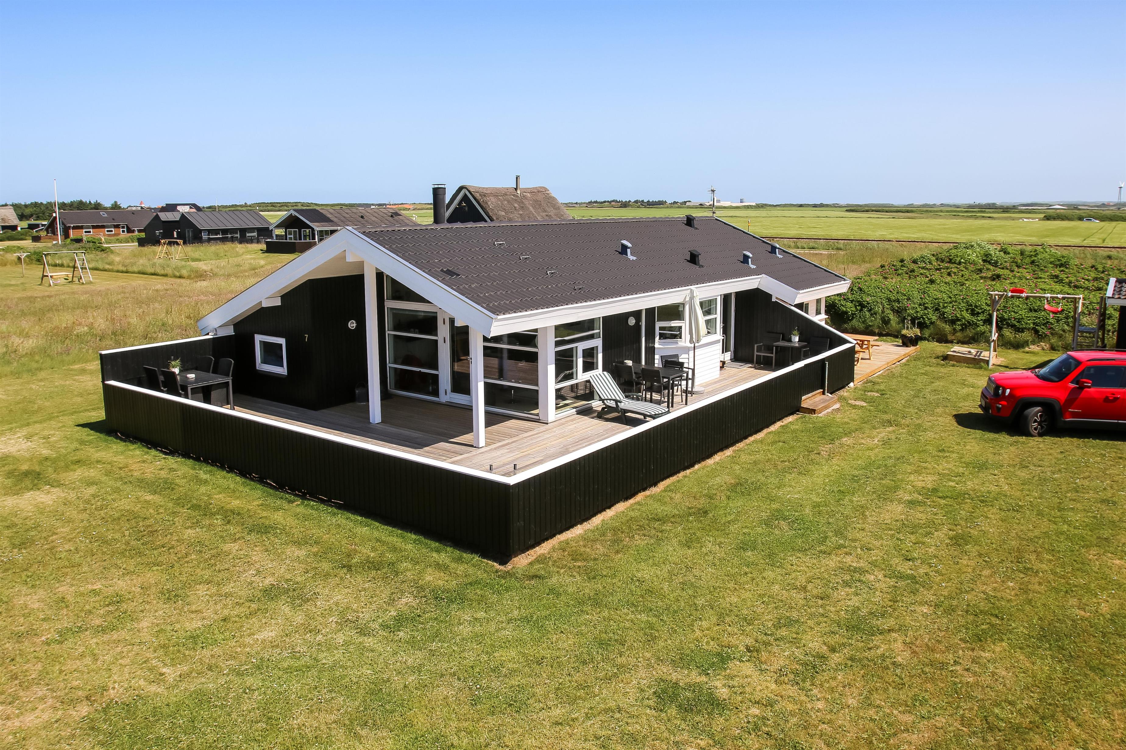 Pragtfuldt, velholdt træhus fra 2003 med gratis Internet, lukket terrasseanlæg og kun ca. 450m fra Vesterhavet og med udsigt til klitterne.