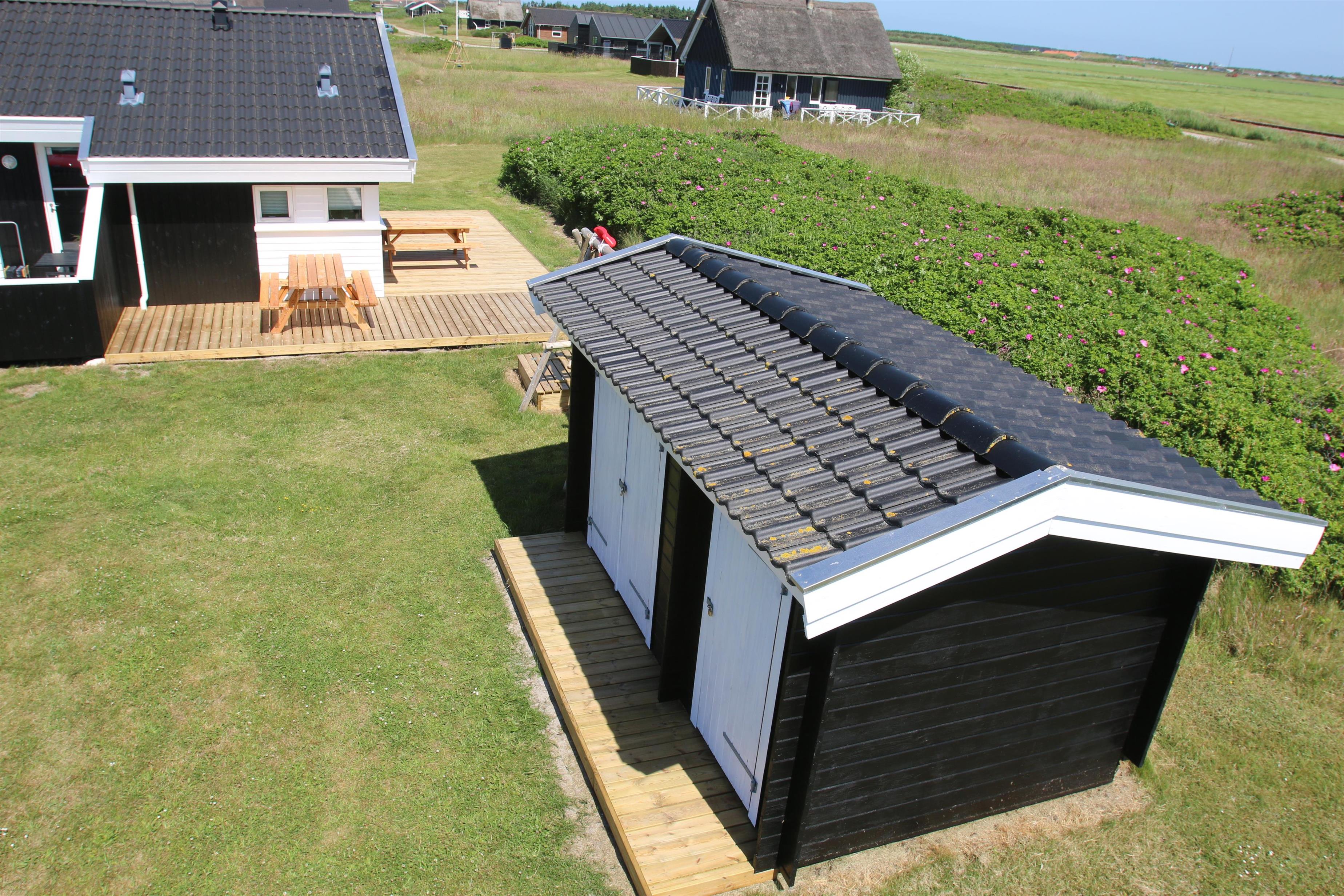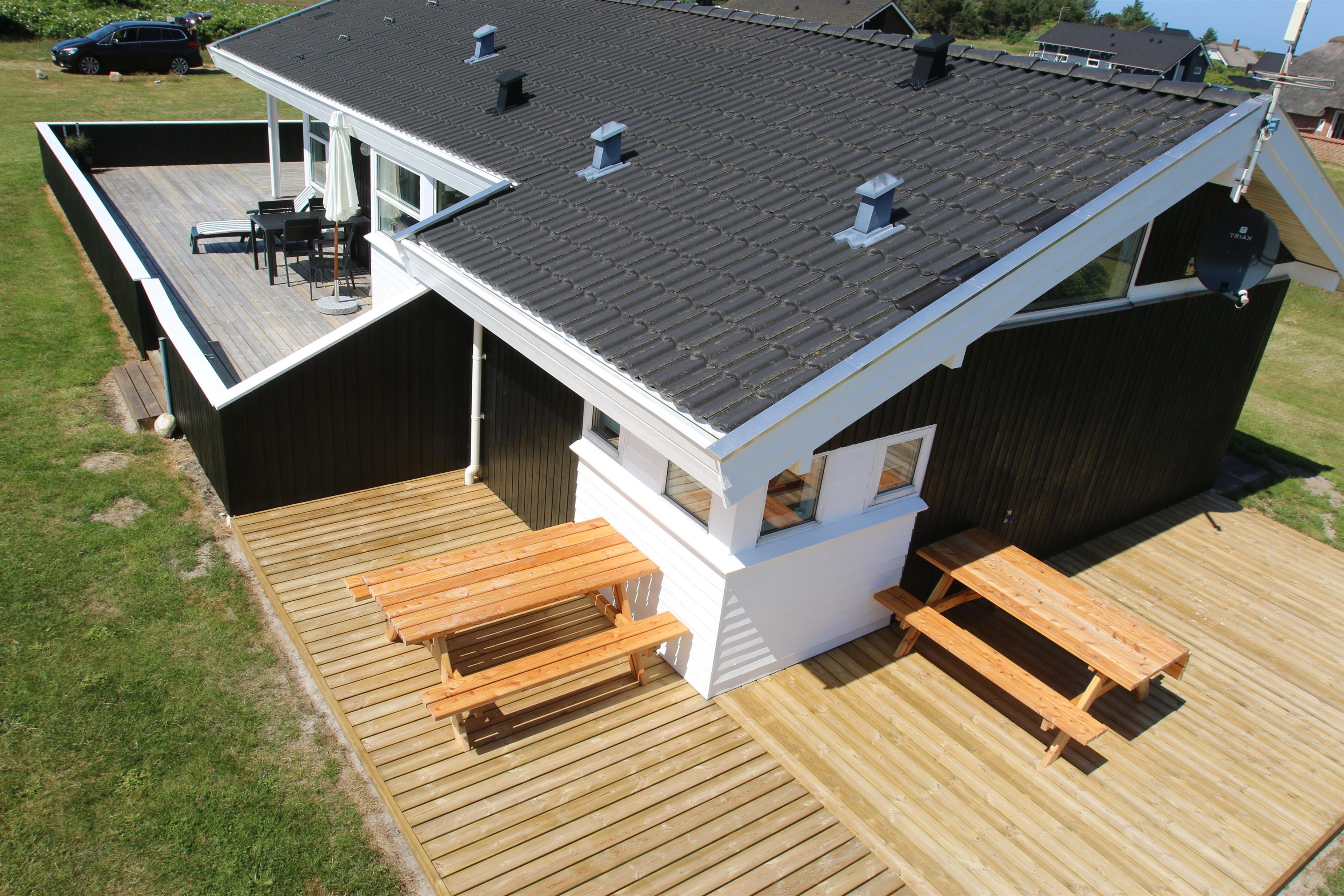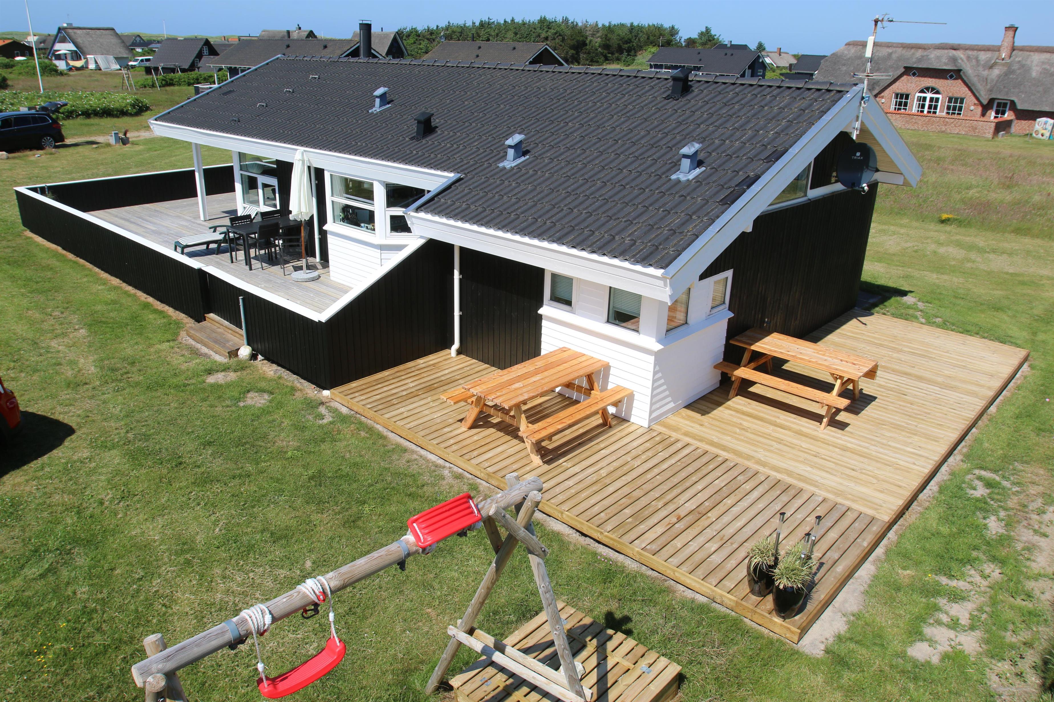 Udgang fra stuen til et stort delvis overdækket lukket terrasseanlæg. Terrassen er indhegnet og der er grill, solvogne og masser af havemøbler, så det er altid mulig at finde læ og sol på terrassen. Velholdt, stor naturgrund på ca. 1.000 m2 med gynge og sandkasse. Alt i alt et særdeles attraktivt ferietilbud for både familier eller par. Her får i - ud over en central beliggende, en berusende natur tæt ved Vesterhavet - også et hus som giver meget igen til en attraktiv pris.