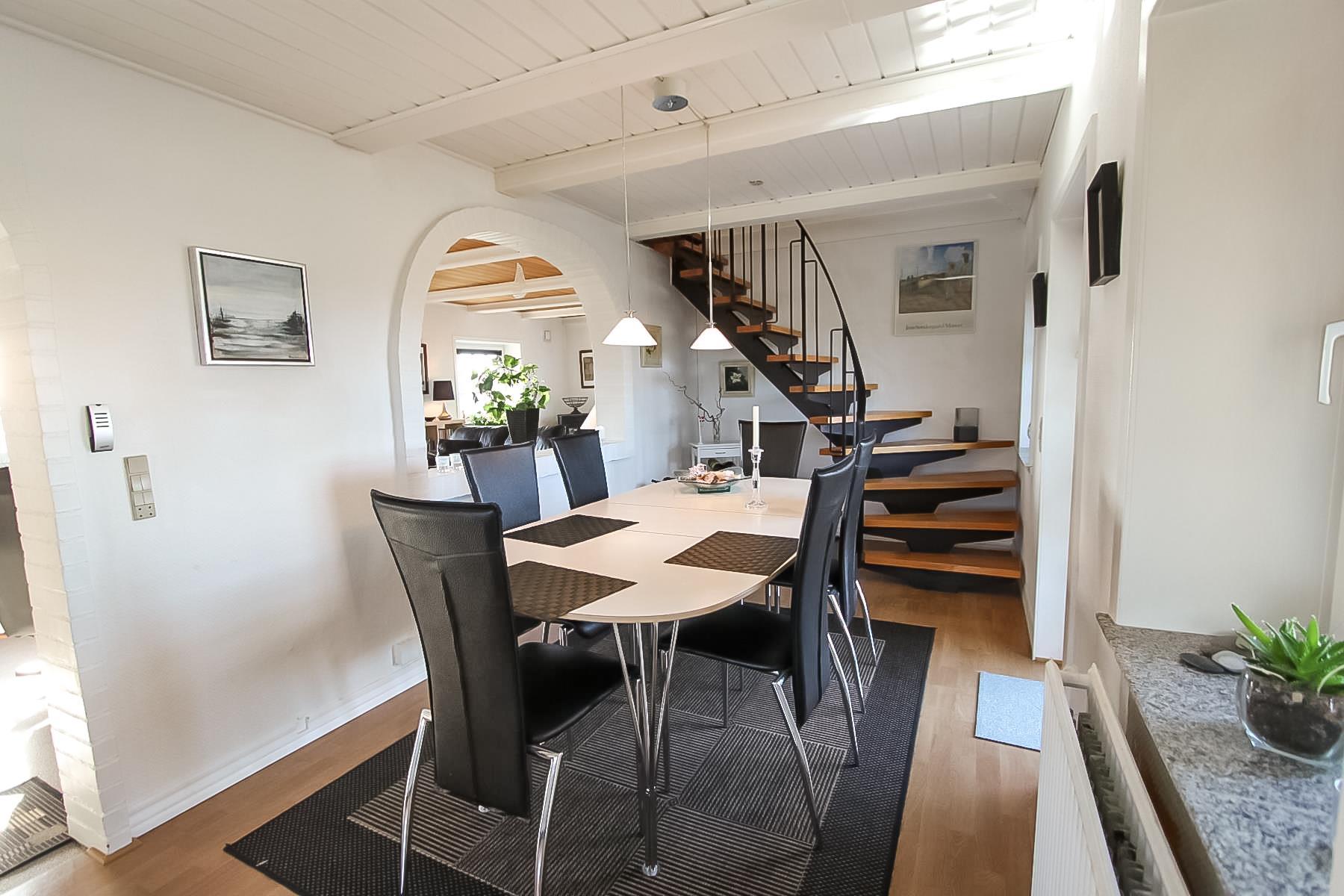 Feriehuset er fordelt på to etager og på 145 m² er der plads til hele familien. Huset er meget velplejet og smagfuldt indrettet med lyse vægge og komfortable møbler, der skaber en hyggelig og indbydende atmosfære.