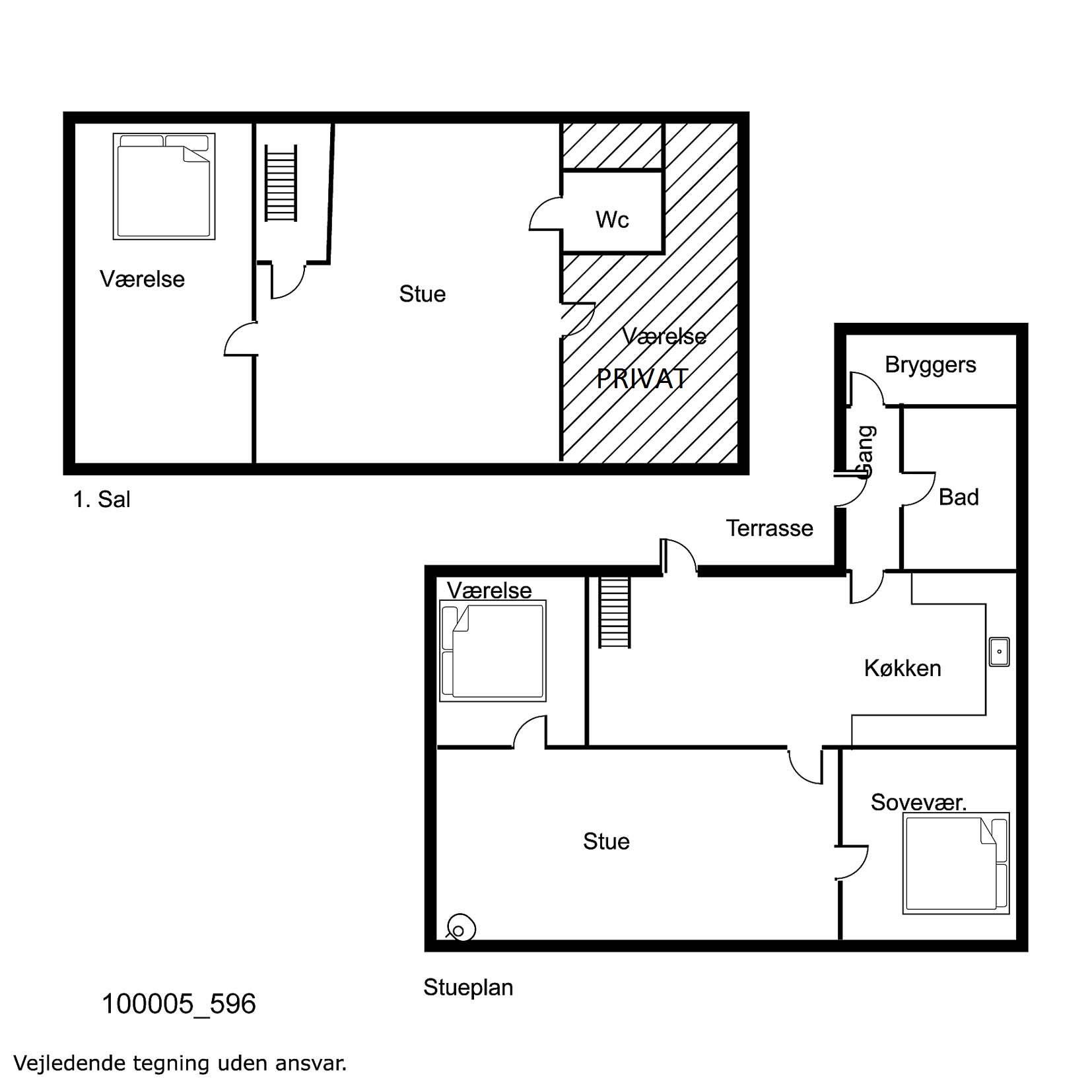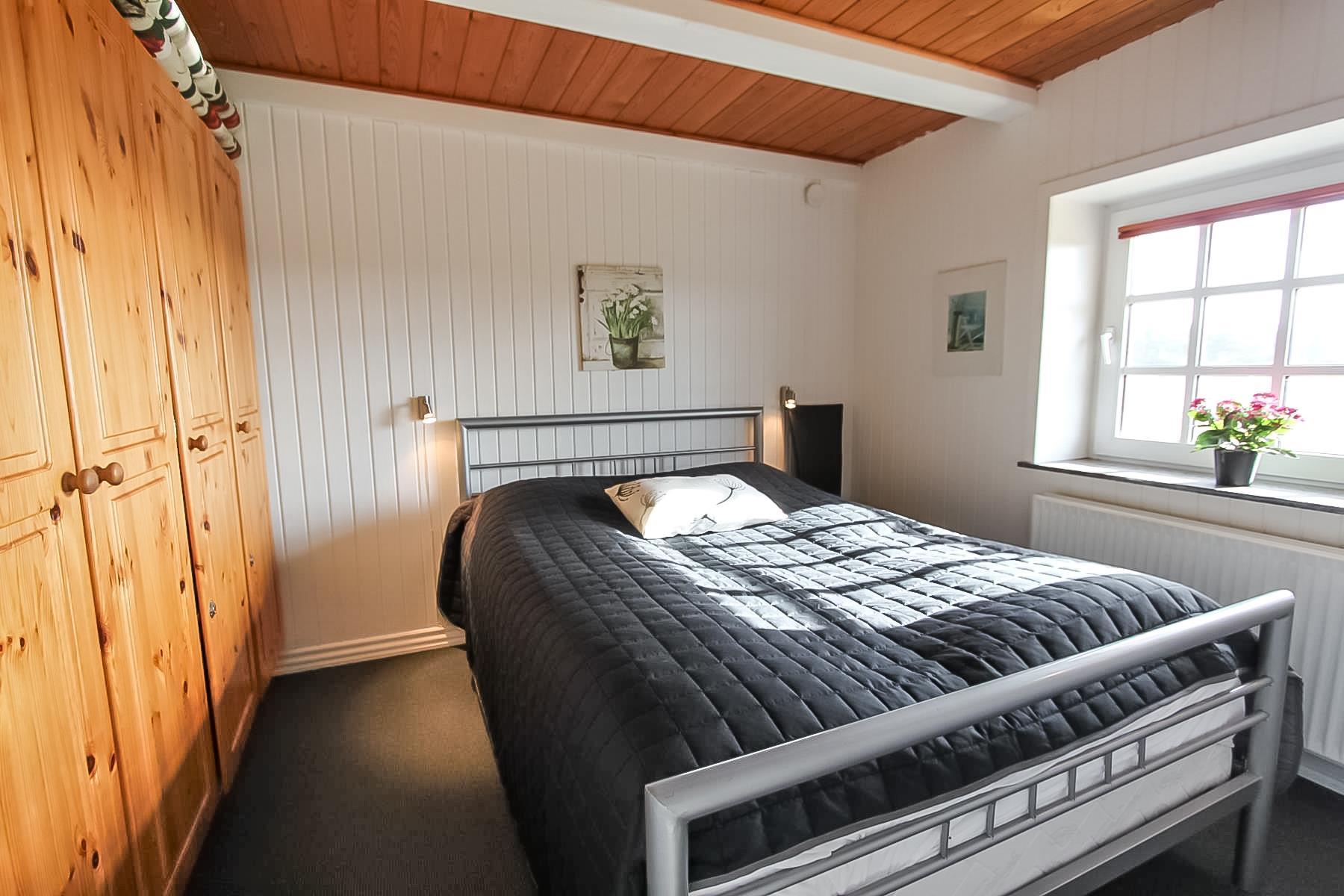 Der er tre soveværelser (2 på stueetagen og 1 på 1. sal), samt to badeværelser – ét med bruser på stueetagen og ét mindre toilet/badeværelse på 1. sal. Huset har nyt luft-til-vand-anlæg, som gør det særdeles energivenligt og giver lavere forbrug. Gratis internetadgang er inkluderet.