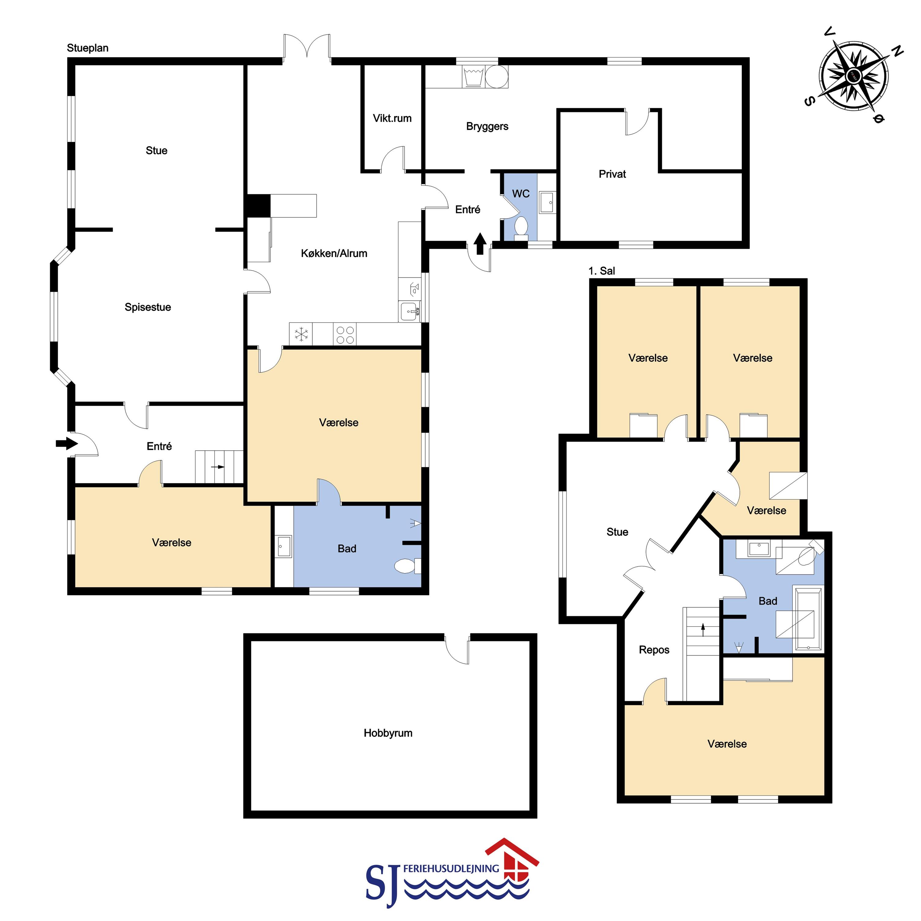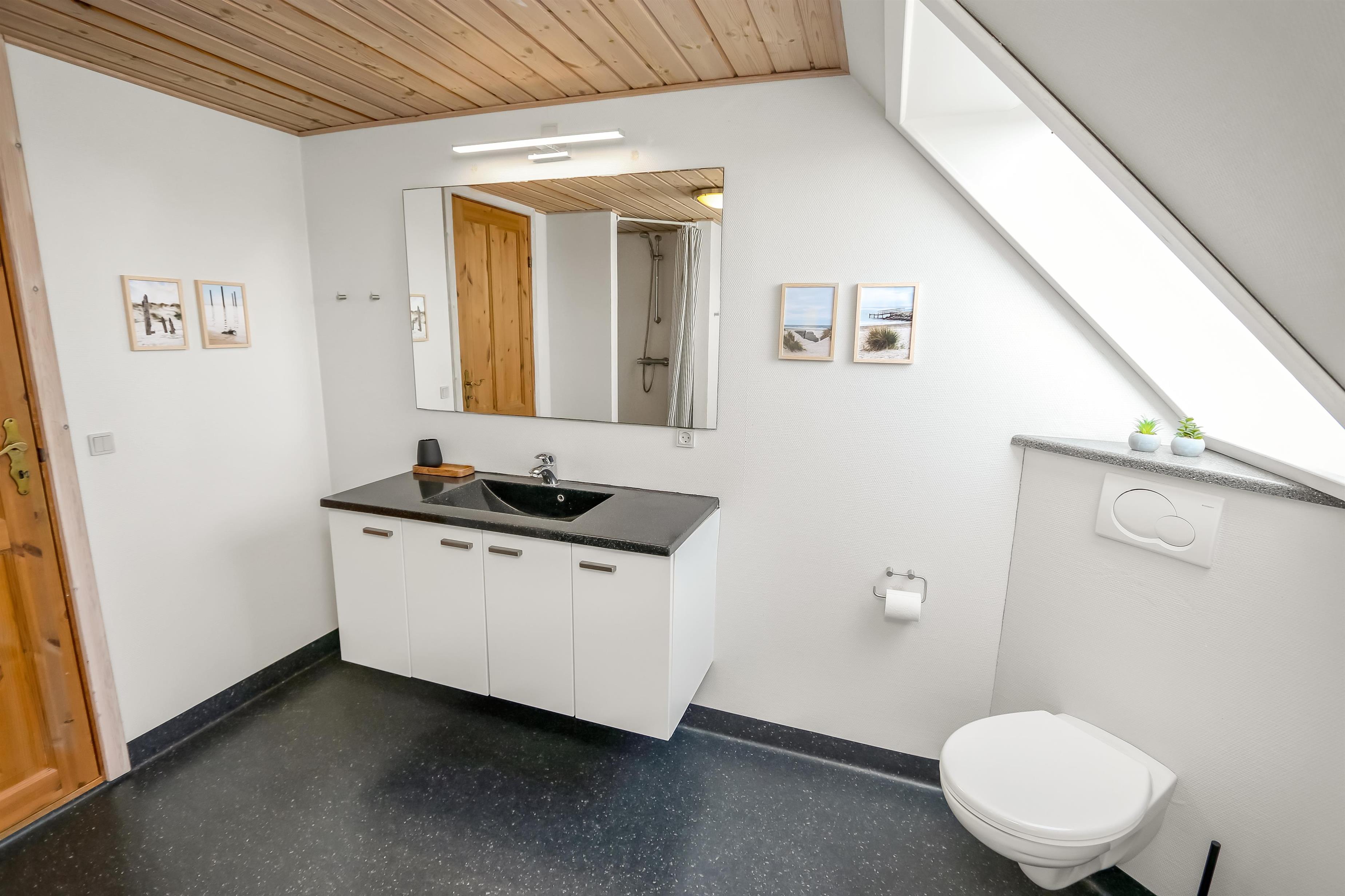 Fra entréen fører trappen op til 1. sal. Her er der en ekstra stue med en stor, lækker sofa med chaiselong og et ekstra fladskærms-tv med danske og tyske kanaler. Der står også en PlayStation med spil klar til brug, som også kan bruges til afspilning af DVD/Blu-ray.