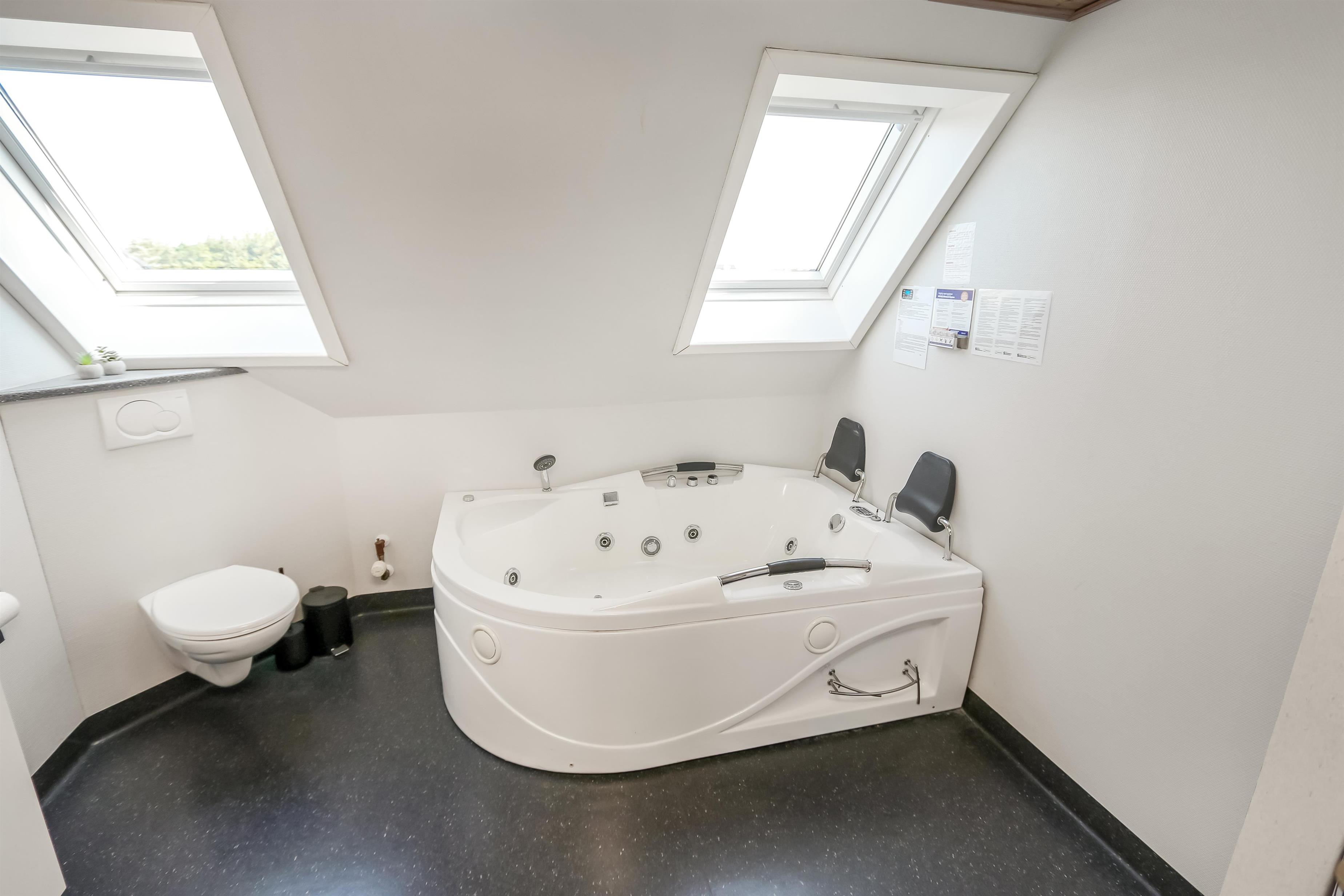 På 1. sal findes et flot, renoveret badeværelse med toilet, håndvask, bruseniche og et lækkert spabad. Der er fire soveværelser: (1DS + 1DS), 1DS, 1ES og 1DS.
