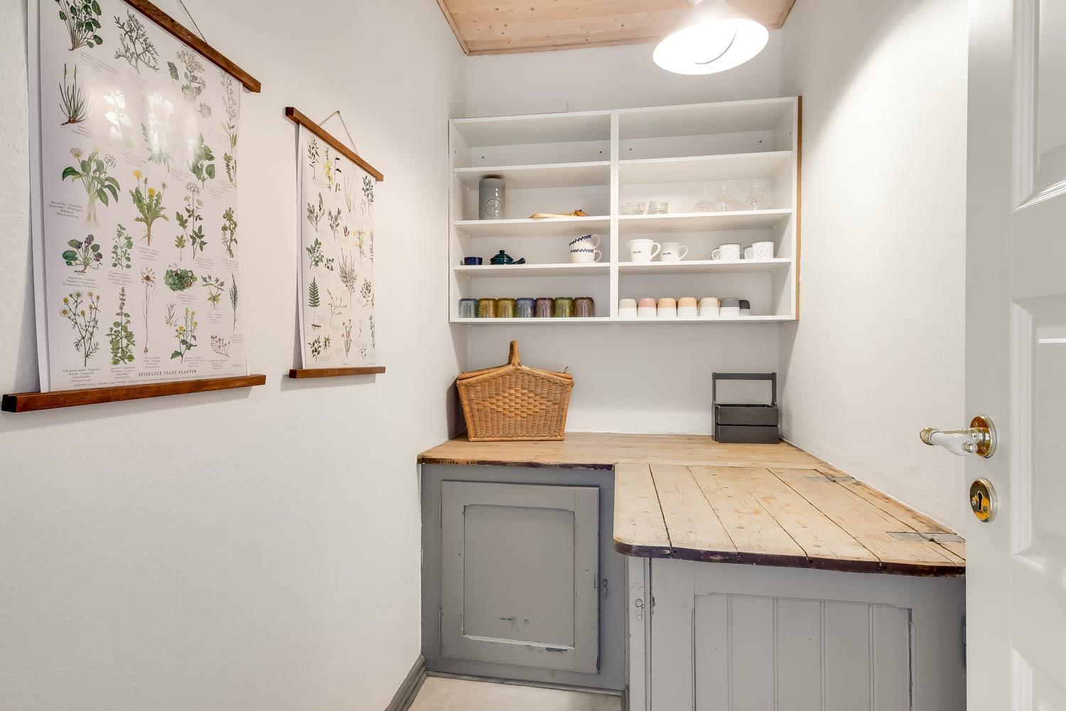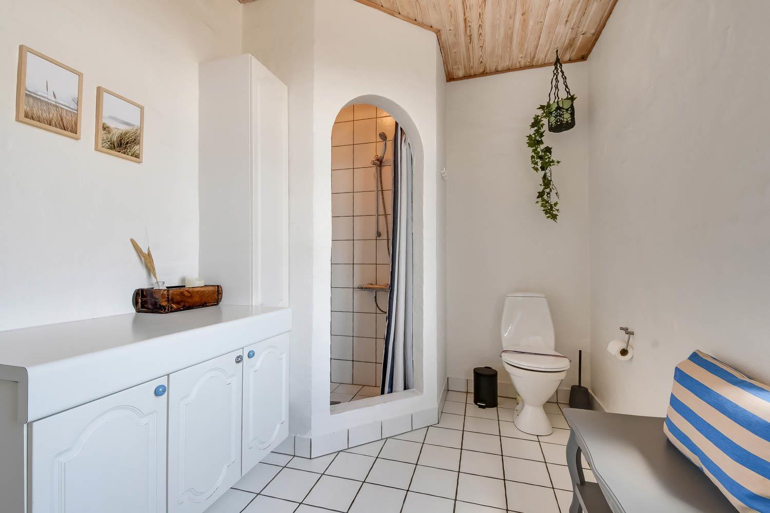 Det flotte og stilrene køkken er udstyret med bl.a. keramiske kogeplader, emhætte, indbygningsovn, mikroovn og et stort køleskab samt fryseboks. Entré, opholdsstue og køkken har alle praktiske klinkegulve. Huset har også et renoveret, dejligt og praktisk bryggers med masser af opbevaringsplads, vaskemaskine og tørretumbler. I stueetagen er der et stort badeværelse med toilet, håndvask, muret bruseniche og klinkegulv med gulvvarme, samt et lille badeværelse med toilet og håndvask.