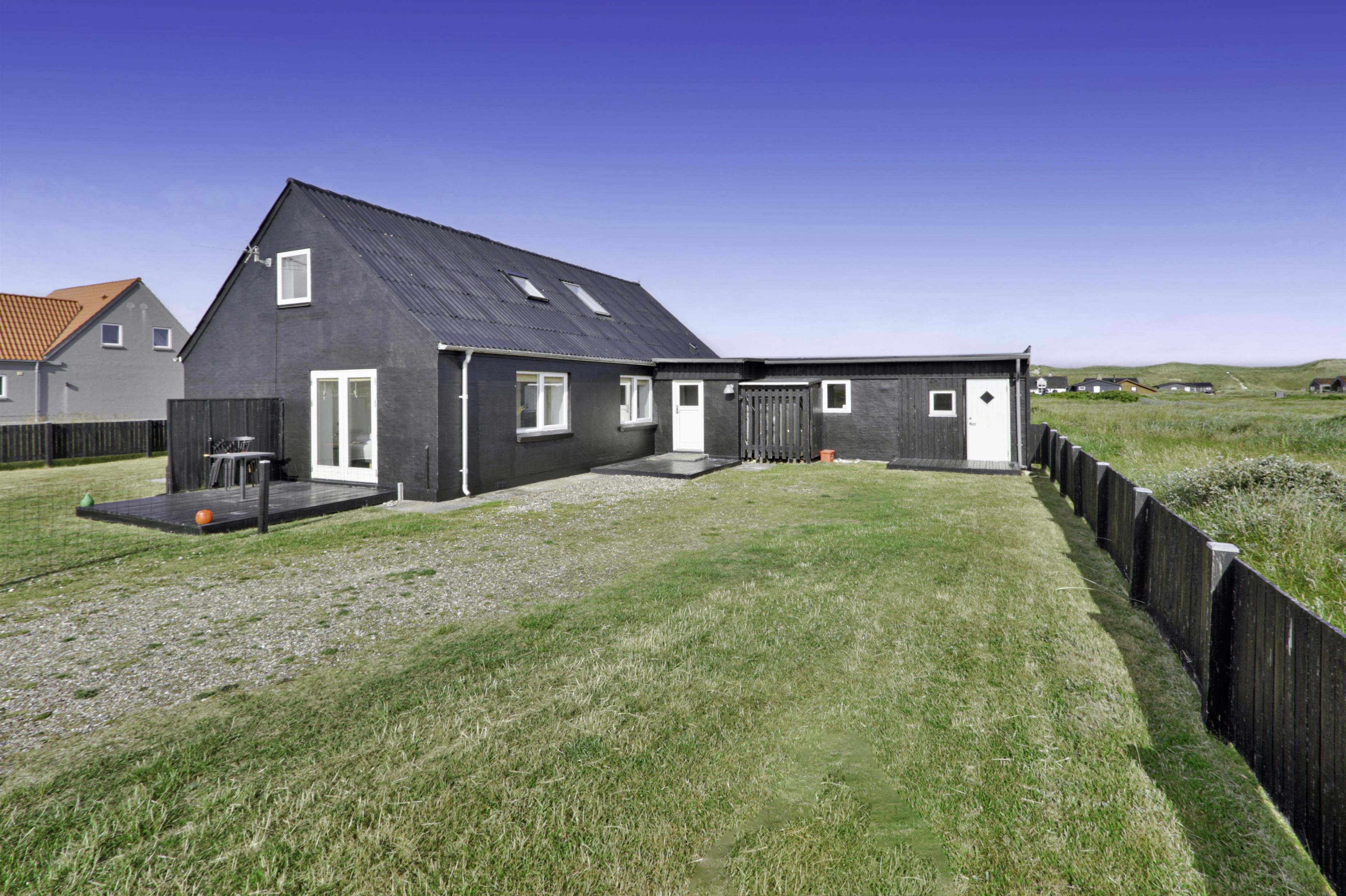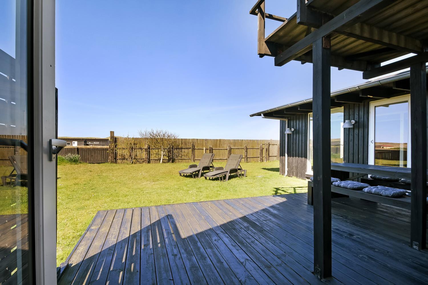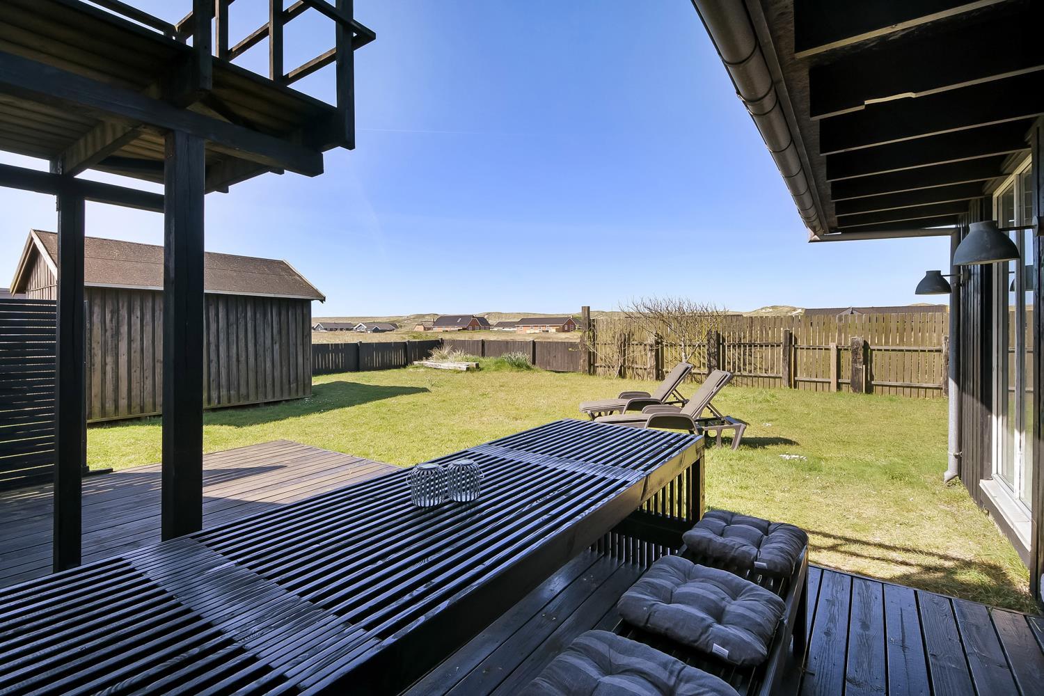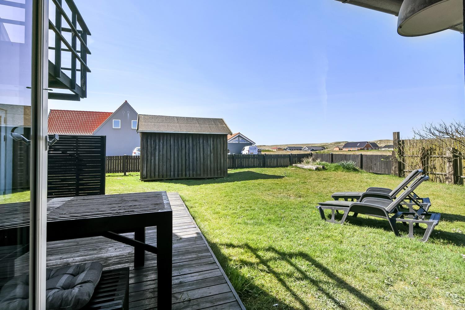 Huset ligger på en 850 m2 stor indhegnet grund, så hunden kan løbe frit. Fra stuen er der udgang til en af husets 2 terrasser med havemøbler, 2 solvogne og grill. Herfra er der udsigt til klitterne, hvor Vesterhavet gemmer sig bag og bølgegangen kan høres. Desuden er der en anden mindre terrasse med udgang fra et af soveværelserne, så man har mulighed for at finde en plads i solen fra 2 af husets sider. Vesterhavet kan nås på få minutter til fods og byder på lange gå- eller løbeture eller man kan samle sten og skaller, flyve med drage, fiske og meget mere. I området omkring Vrist finder man en af Vestjyllands smukkeste cykelruter. Ikke langt fra Vrist kommer man i bil hurtigt til havnebyerne Lemvig og Thyborøn, hvor man kan nyde en is på havnen, købe frisk fisk eller shoppe i de lokale butikker. Eller man tager det lille VLTJ-tog der køre forbi huset i ny og næ, hvortil man kan få gratis togbilletter på SJ’s kontor til at køre mellem Lemvig og Thyborøn.