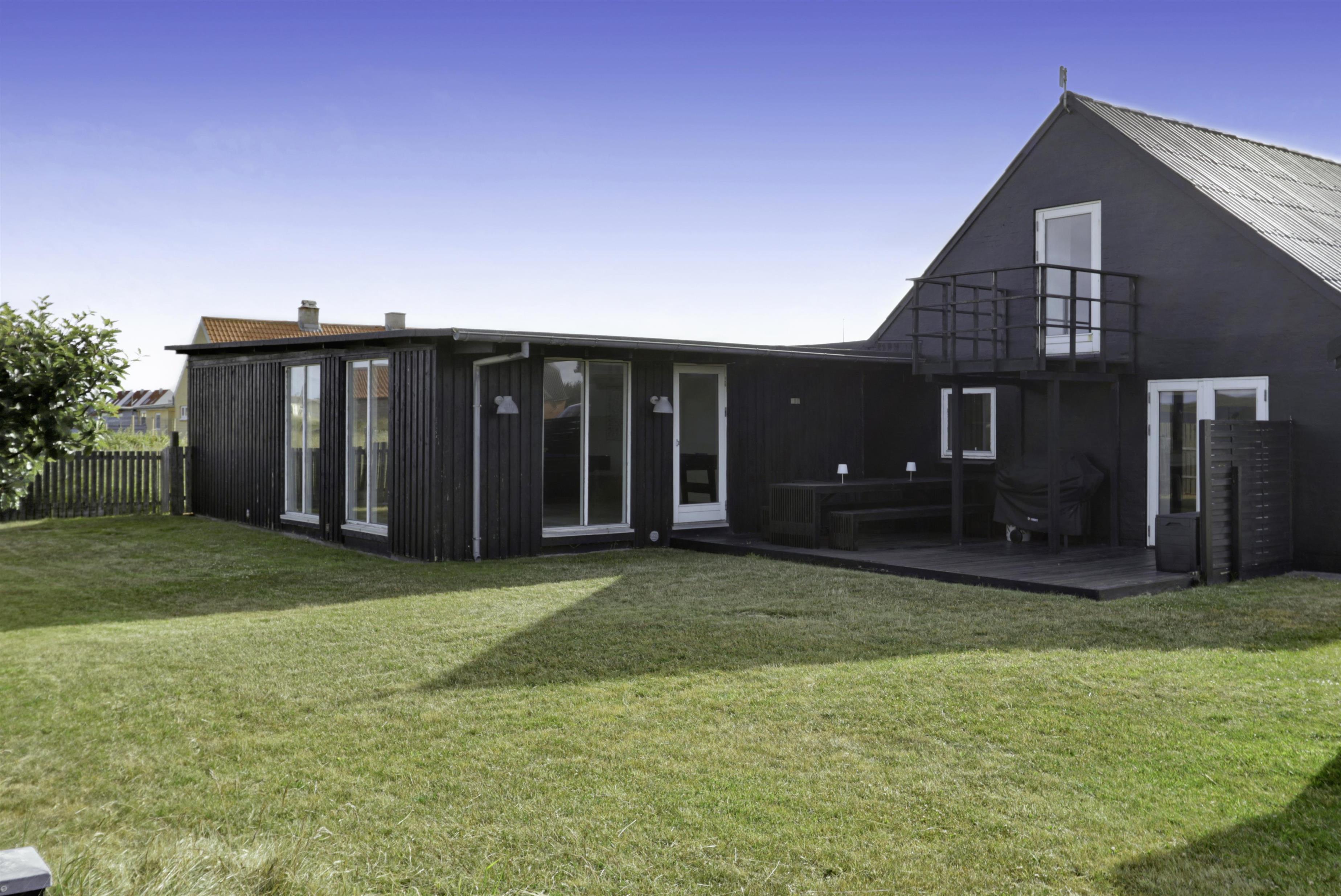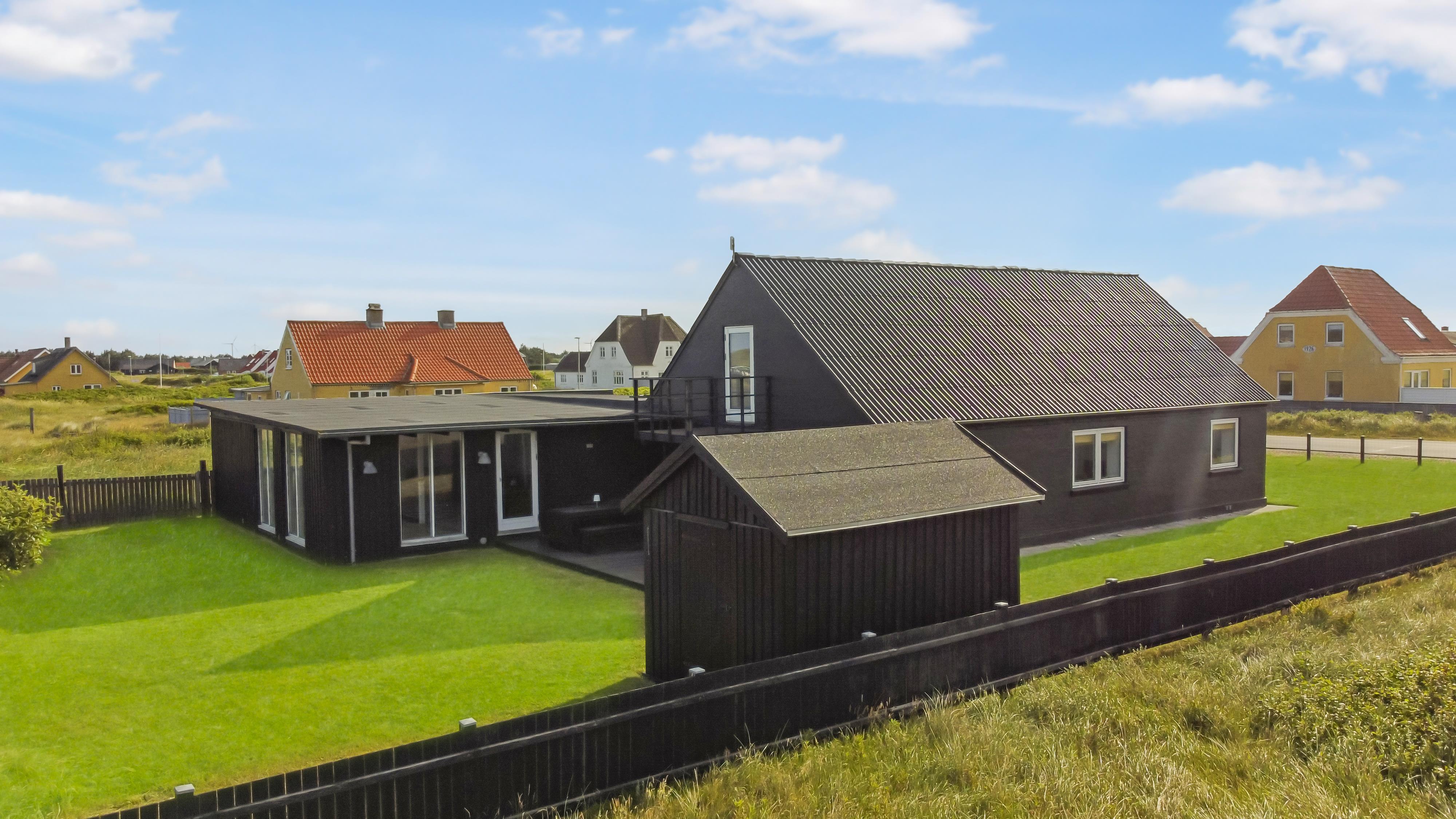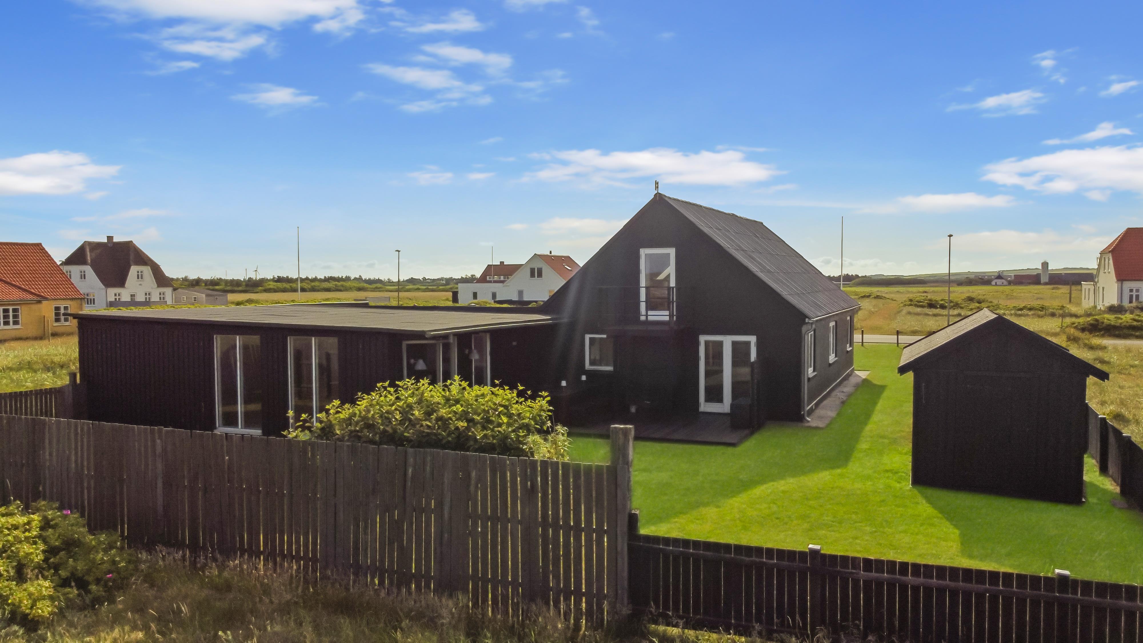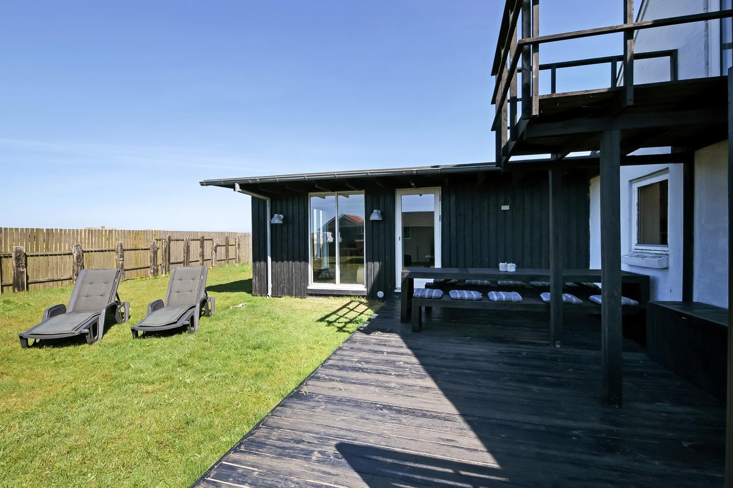 Huset ligger på en 850 m2 stor indhegnet grund, så hunden kan løbe frit. Fra stuen er der udgang til en af husets 2 terrasser med havemøbler, 2 solvogne og grill. Herfra er der udsigt til klitterne, hvor Vesterhavet gemmer sig bag og bølgegangen kan høres. Desuden er der en anden mindre terrasse med udgang fra et af soveværelserne, så man har mulighed for at finde en plads i solen fra 2 af husets sider. Vesterhavet kan nås på få minutter til fods og byder på lange gå- eller løbeture eller man kan samle sten og skaller, flyve med drage, fiske og meget mere. I området omkring Vrist finder man en af Vestjyllands smukkeste cykelruter. Ikke langt fra Vrist kommer man i bil hurtigt til havnebyerne Lemvig og Thyborøn, hvor man kan nyde en is på havnen, købe frisk fisk eller shoppe i de lokale butikker. Eller man tager det lille VLTJ-tog der køre forbi huset i ny og næ, hvortil man kan få gratis togbilletter på SJ’s kontor til at køre mellem Lemvig og Thyborøn.