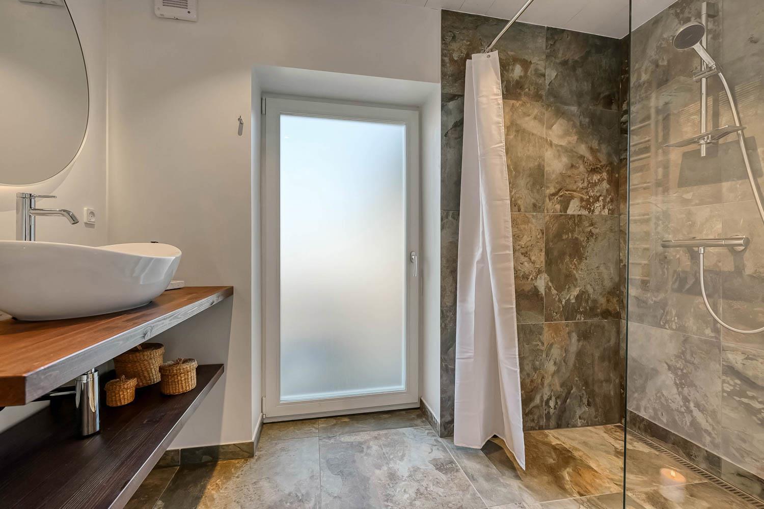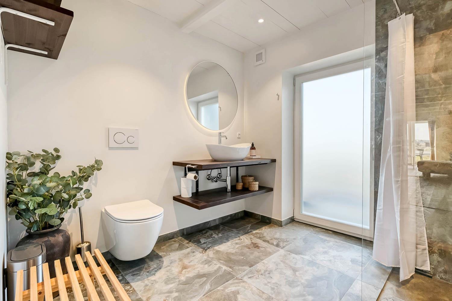 Der er to flotte badeværelser, begge centralt placeret og indrettet med toilet, håndvask og bruser. Skulle der opstå behov for tøjvask under opholdet, står både vaskemaskine og tørretumbler til rådighed. Til familiens mindste gæst findes der naturligvis også en barnestol.