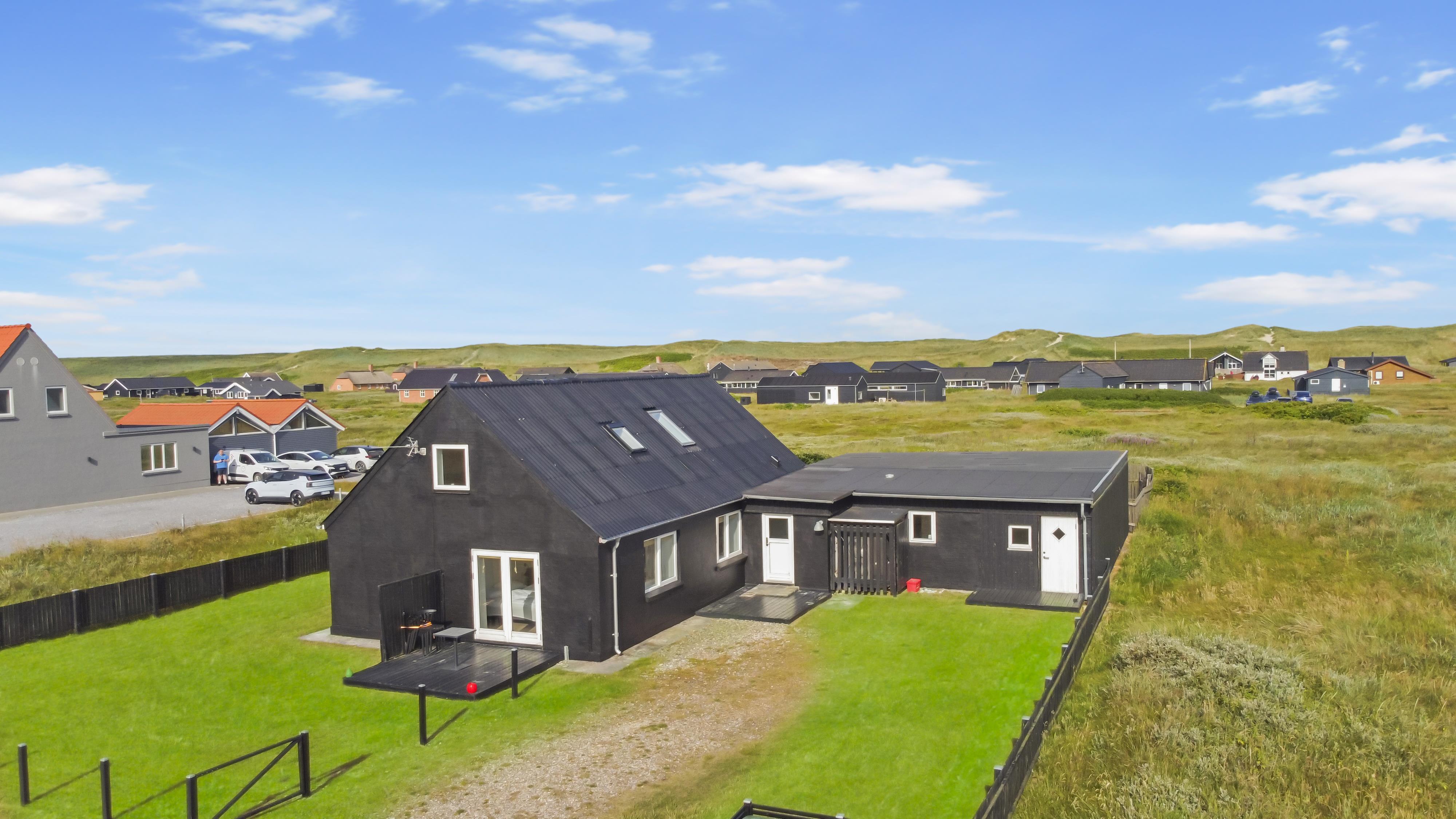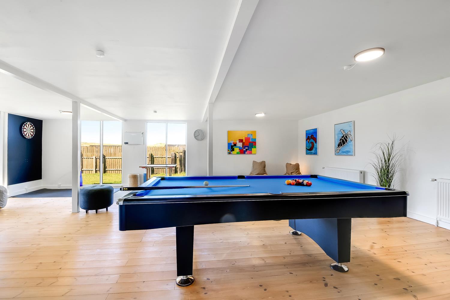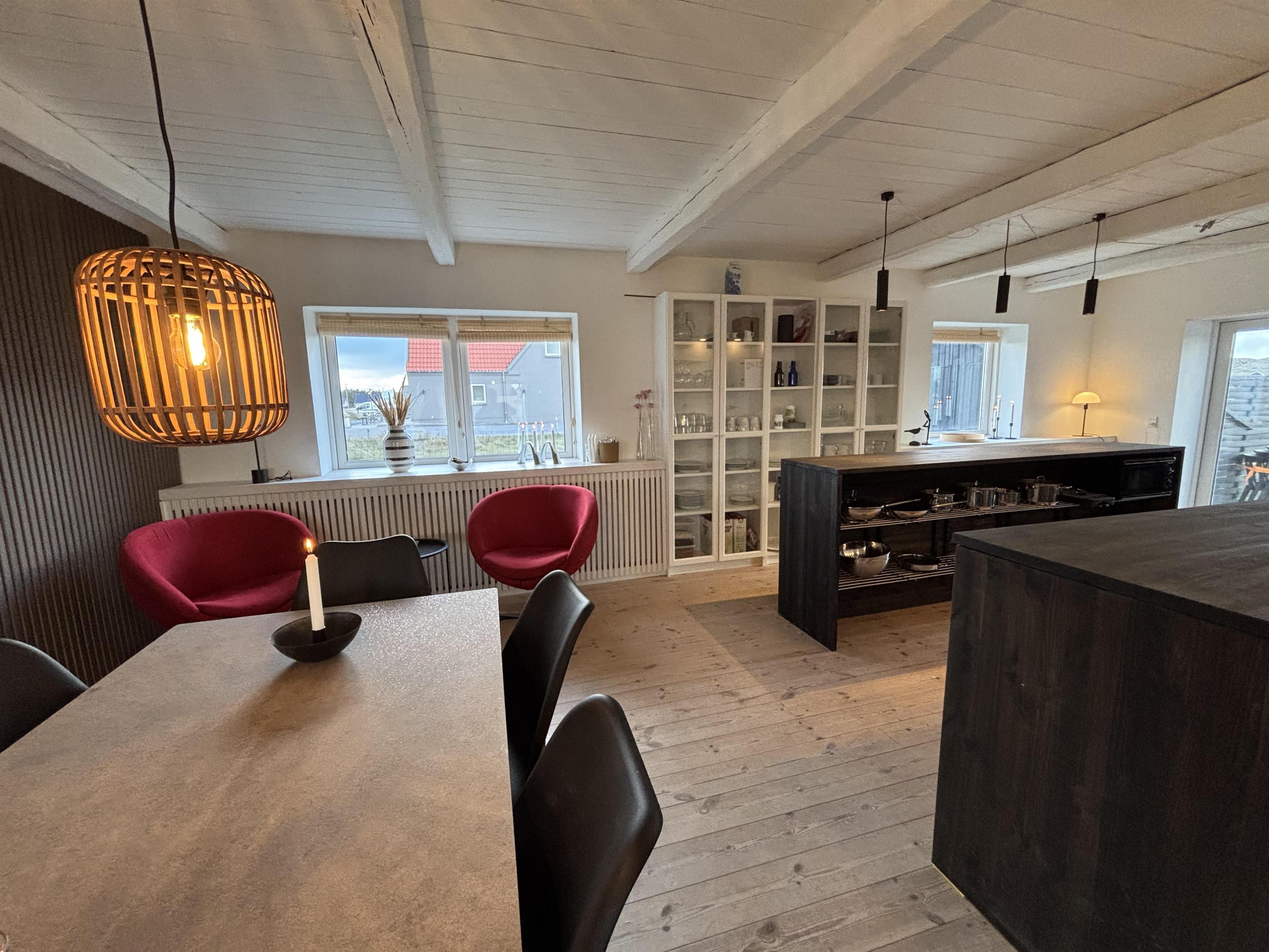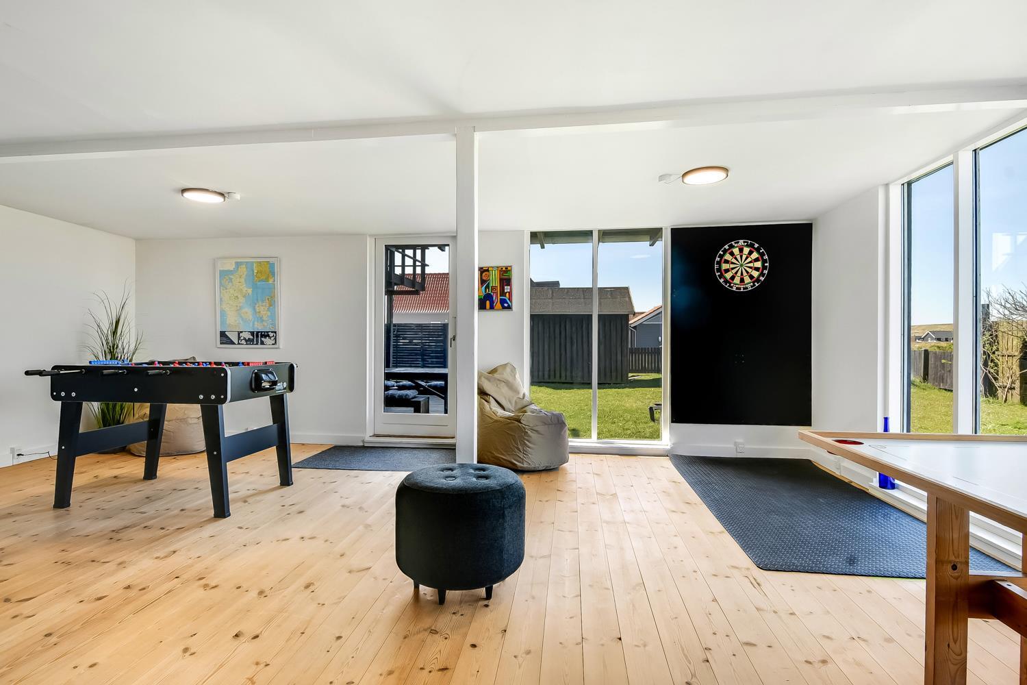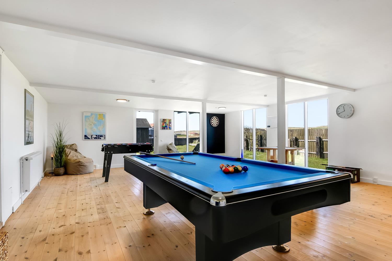 Huset på hele 220 m2 er fordelt på 2 etager og er blevet renoveret i løbet af 2024. En lys entré byder velkommen til husets indre. Fra entreen kommer man ud i husets køkken med køle-/fryseskab, opvaskemaskine, glaskeramisk komfur, emhætte og mikroovn. I køkkenet er der et lille siddehjørne. Fra køkkenet kommer man ud til husets stue. Her er der plads til at familien og venner kan samles om spisebordet eller i sofahjørnet. Stuen er indrettet med læder- og polstermøbler, stort fjernsyn med danske og tyske kanaler og radio. I husets anden ende ligger et stort aktivitetsrum med billard, bordtennis, bordfodbold og dartskive. Så der er rig mulighed for at udfordre hinanden i spil i løbet af ferien. Centralt i huset ligger badeværelset med toilet, håndvask og bruser. Huset har 4 rummelige soveværelser fordelt med 3 værelser i stueetagen og 1 værelse på 1. sal (1DS, 1DS, 1DS, 1DS). Der er yderligere liggemuligheder på 1. sal. Fra 1. sal er der også udgang til en altan med skøn udsigt mod klitterne. Skulle det ske, at der er behov for at vaske tøj i løbet af ferien, er der vaskemaskine og tørretumbler. Desuden er der en barnestol til rådighed til husets mindste gæst.