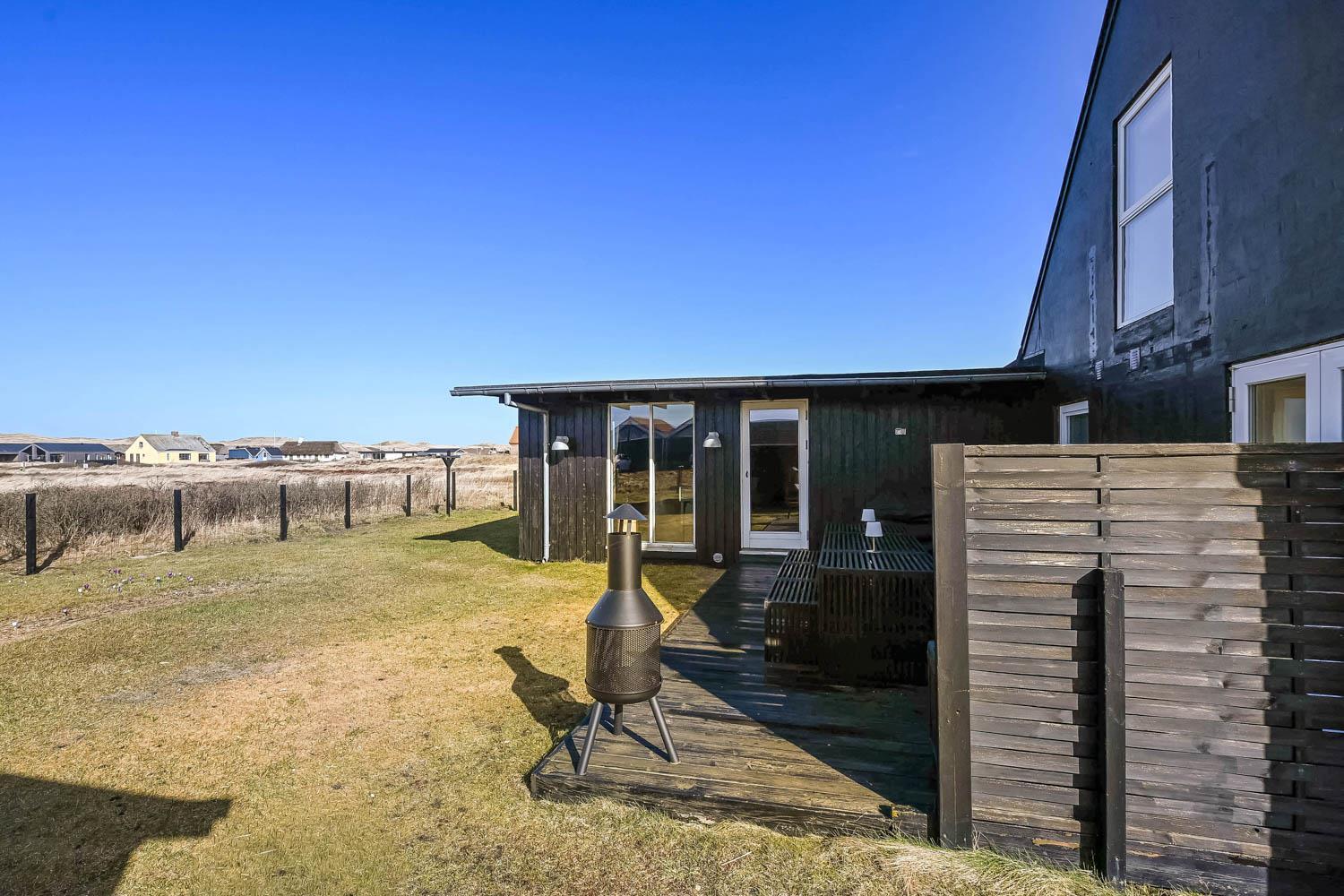 Huset ligger på en 850 m² stor indhegnet grund, hvor også hunden trygt kan løbe frit. Fra køkkenet er der udgang husets store terrasse med havemøbler, grill og to solvogne. Herfra kan I nyde den skønne udsigt mod klitterne og høre Vesterhavets bølger i baggrunden. Derudover findes 2 mindre terrasser - det ene med udgang fra et af soveværelserne og den anden med udgang fra stuen - så I har mulighed for at finde både sol og læ fra flere sider af huset.
