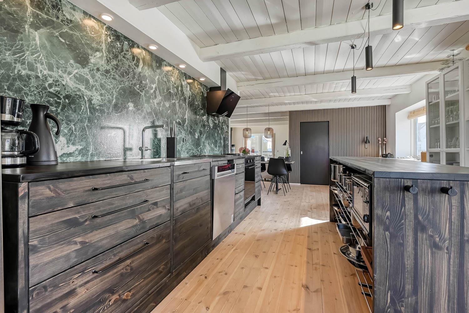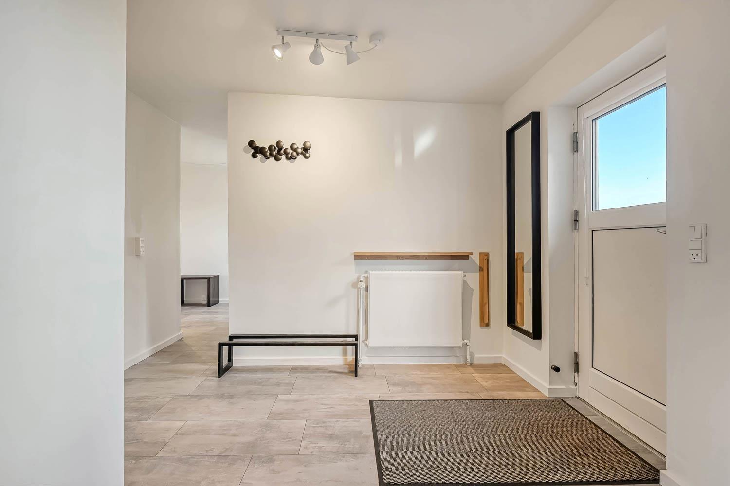 En lys entré byder jer velkommen indenfor og leder videre ind i det kombinerede, veludstyrede køkken og stue, som blandt andet rummer amerikaner køle-/fryseskab, opvaskemaskine, glaskeramisk induktionskomfur, emhætte og mikroovn. Køkkenet har desuden et hyggeligt lille siddehjørne og ligger i åben forbindelse med den rummelige stue.