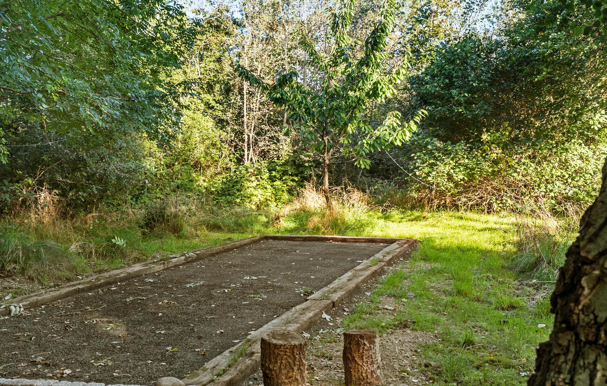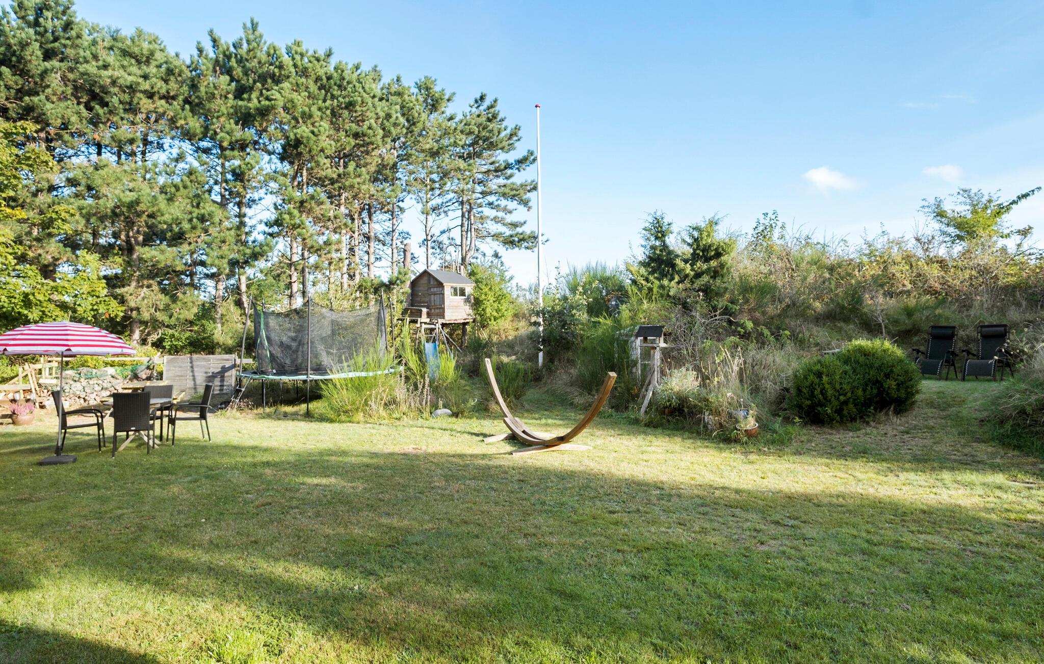 Hyggeligt træhus ved Yderby Lyng strand med stor terrasse, petanquebane og trampolin for hele familien.