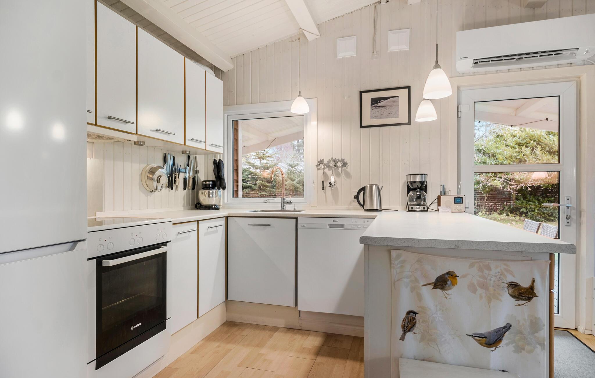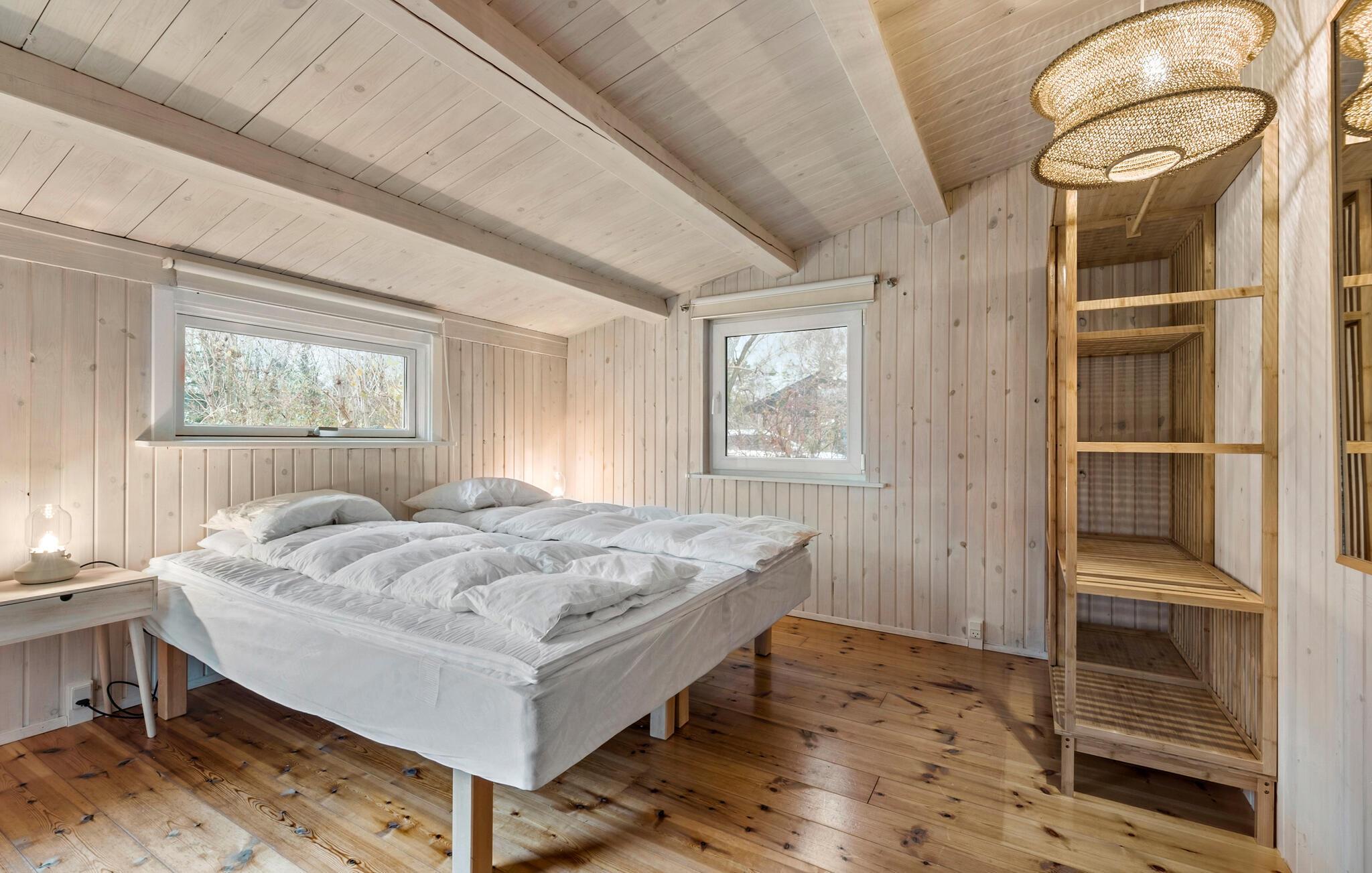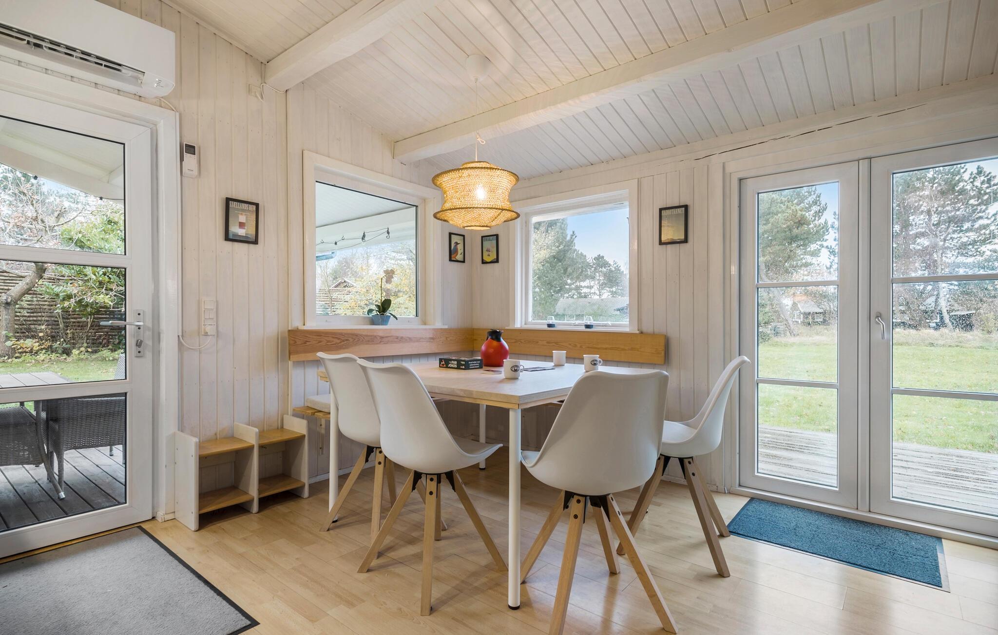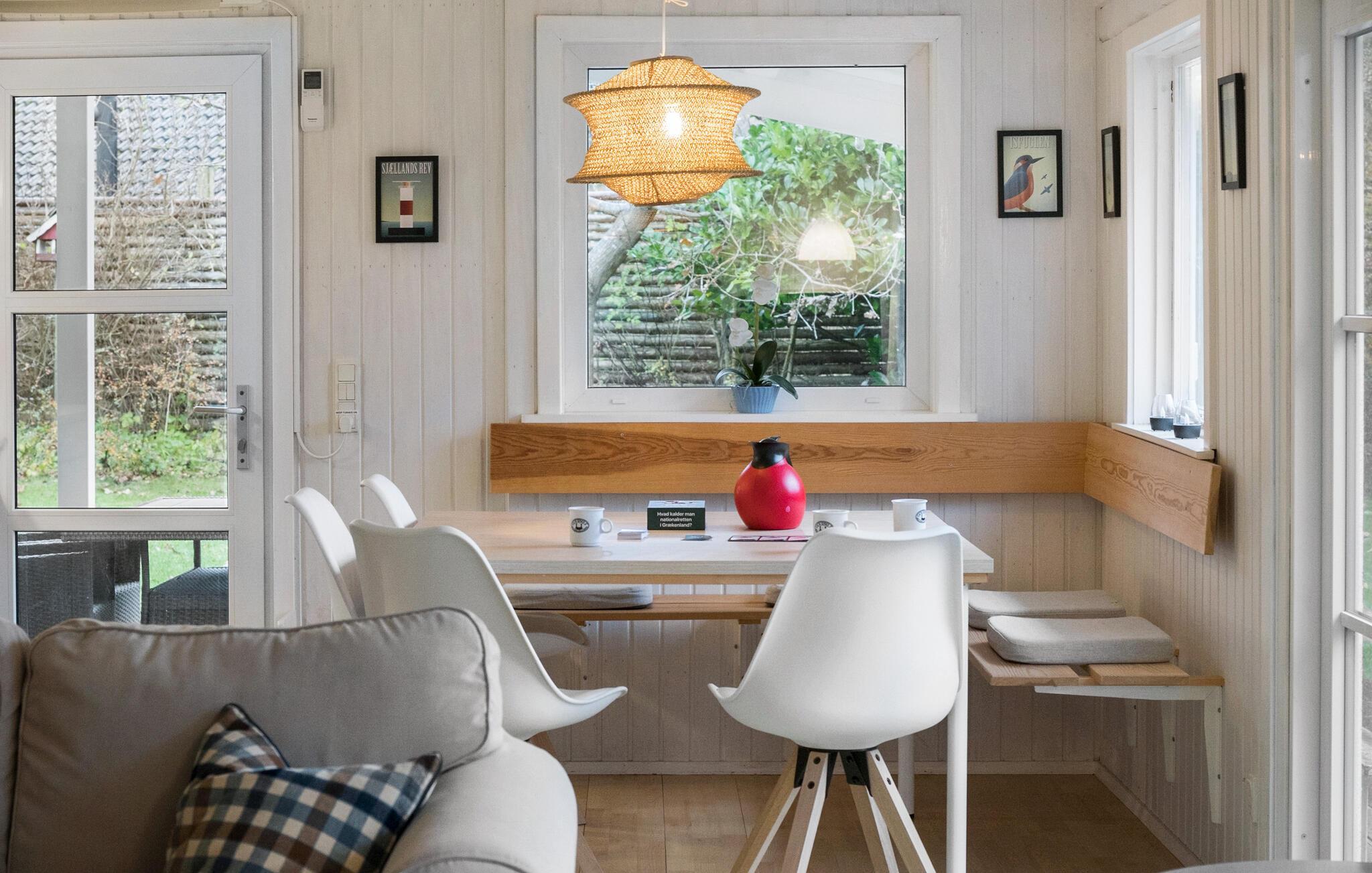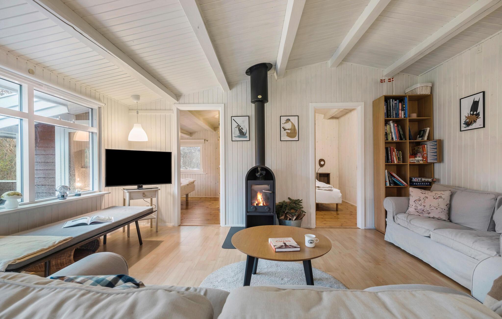 Kom ind og gør jer godt tilpas i det lyse, smagfuldt indrettede interiør i jeres charmerende feriehus. Træbeklædte vægge, masser af naturligt dagslys og stilfulde møbler skaber en hyggelig atmosfære. Nyd måltiderne sammen i den hyggelige spiseplads med udsigt til det grønne og glæd jer til afslappede aftener med en god bog foran den knitrende pejs.